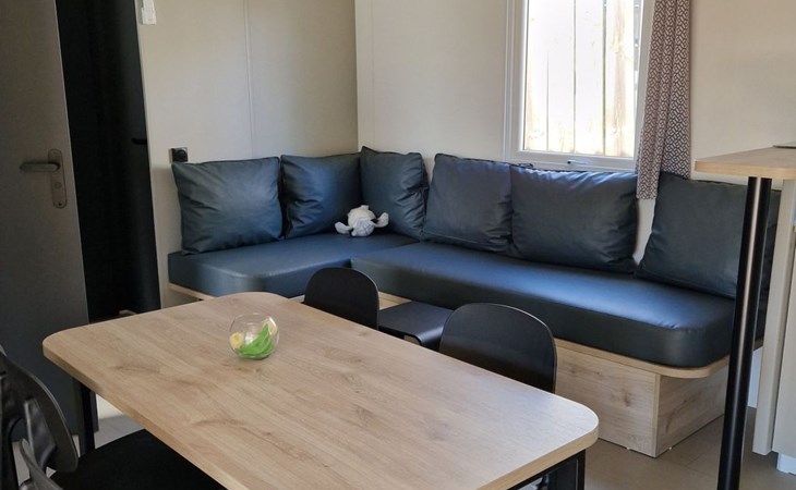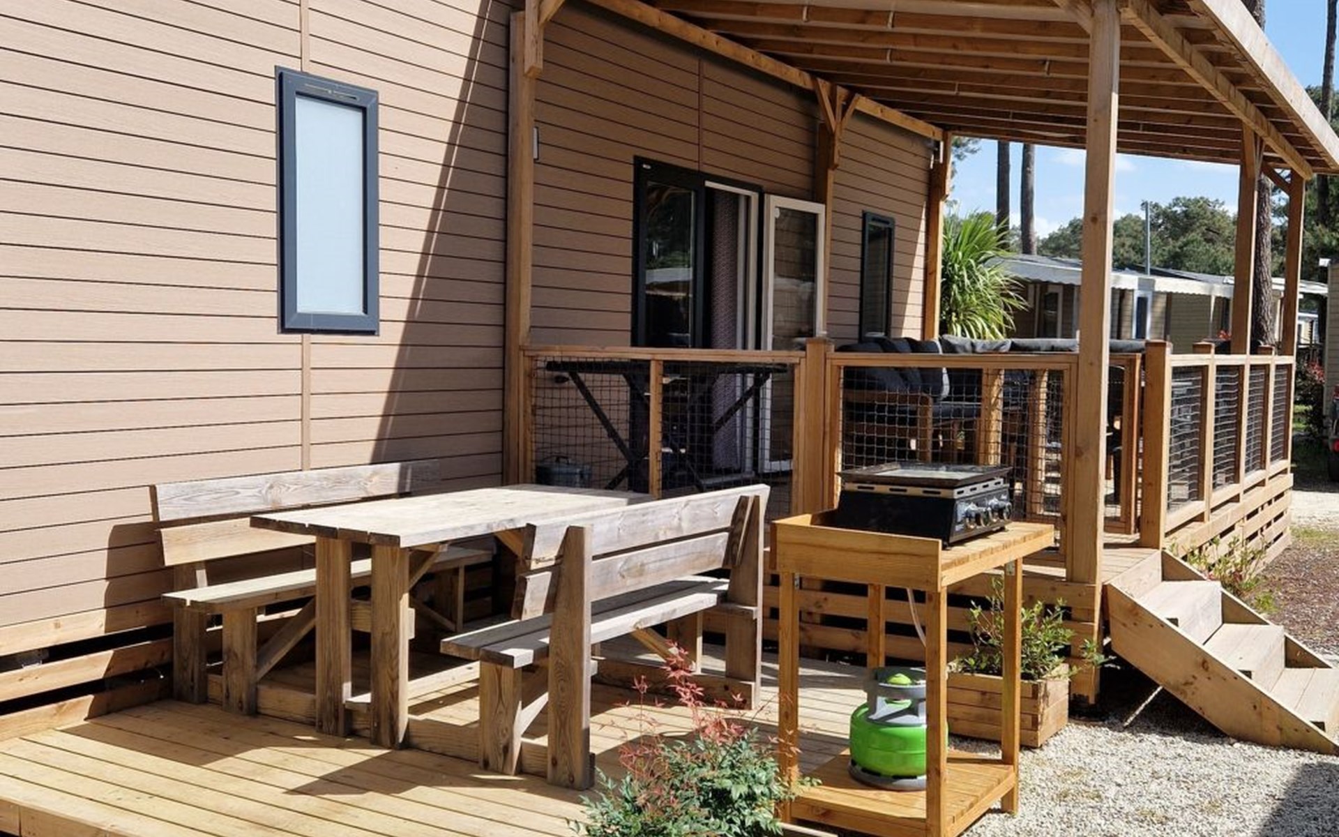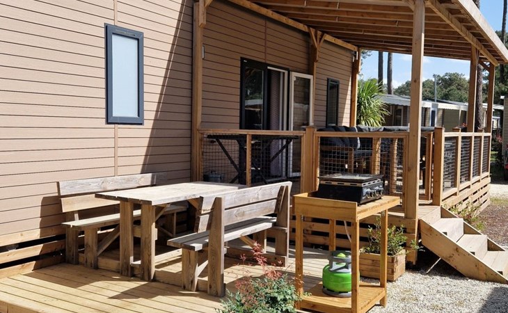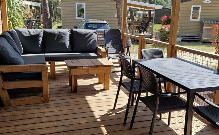 Die 18m2 große Terrasse ist vollständig überdacht. Dort finden Sie einen Tisch mit Stühlen, eine Eckbank aus Holz, 2 Relaxsessel und eine Gasplancha.