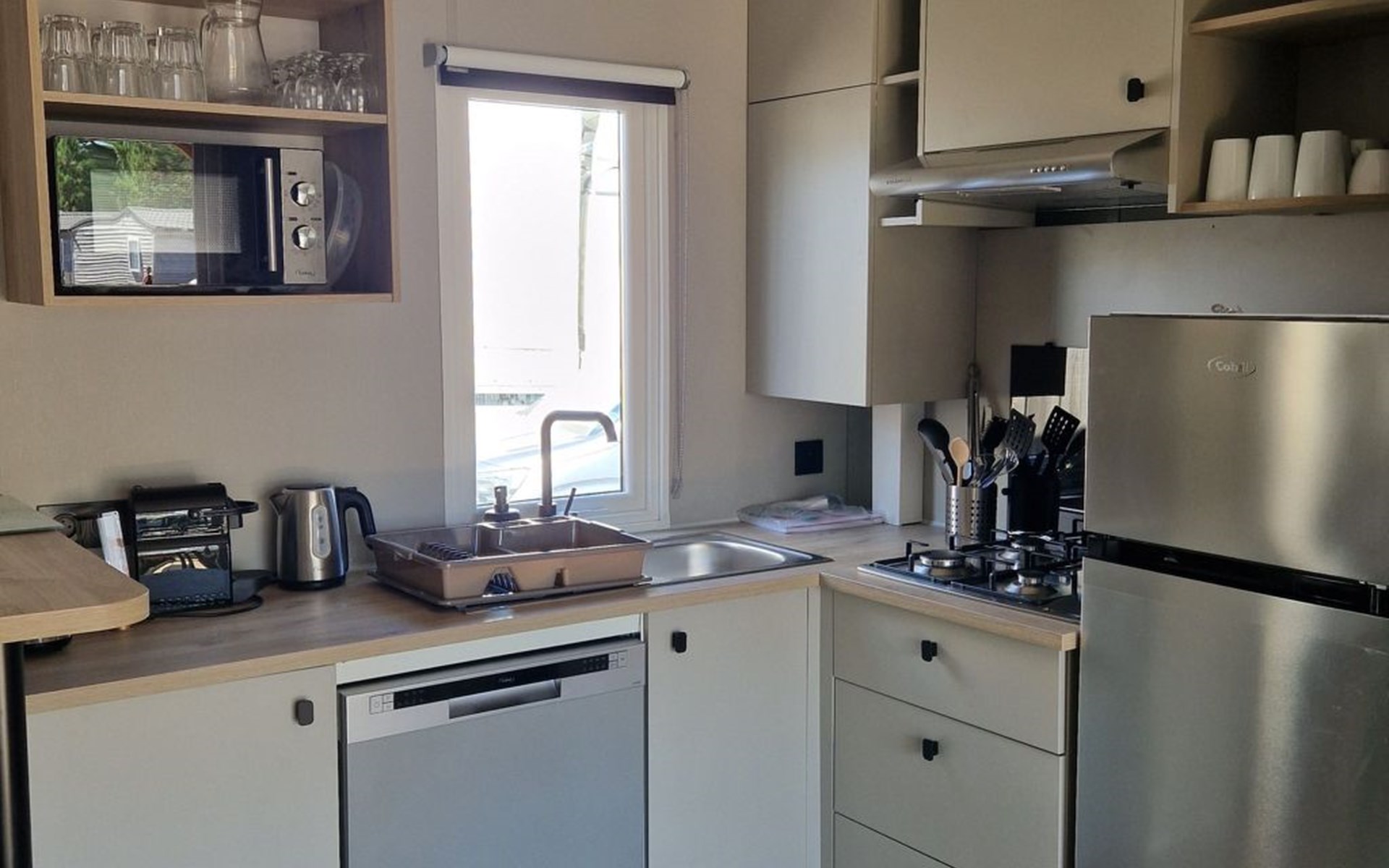 Die offene Einbauküche verfügt über einen Geschirrspüler, eine Mikrowelle, einen Airfryer, eine Krups-Kaffeemaschine mit Pads, einen Toaster, einen Wasserkocher und einen Kühlschrank mit Gefrierfach.