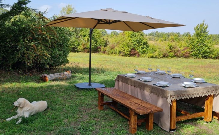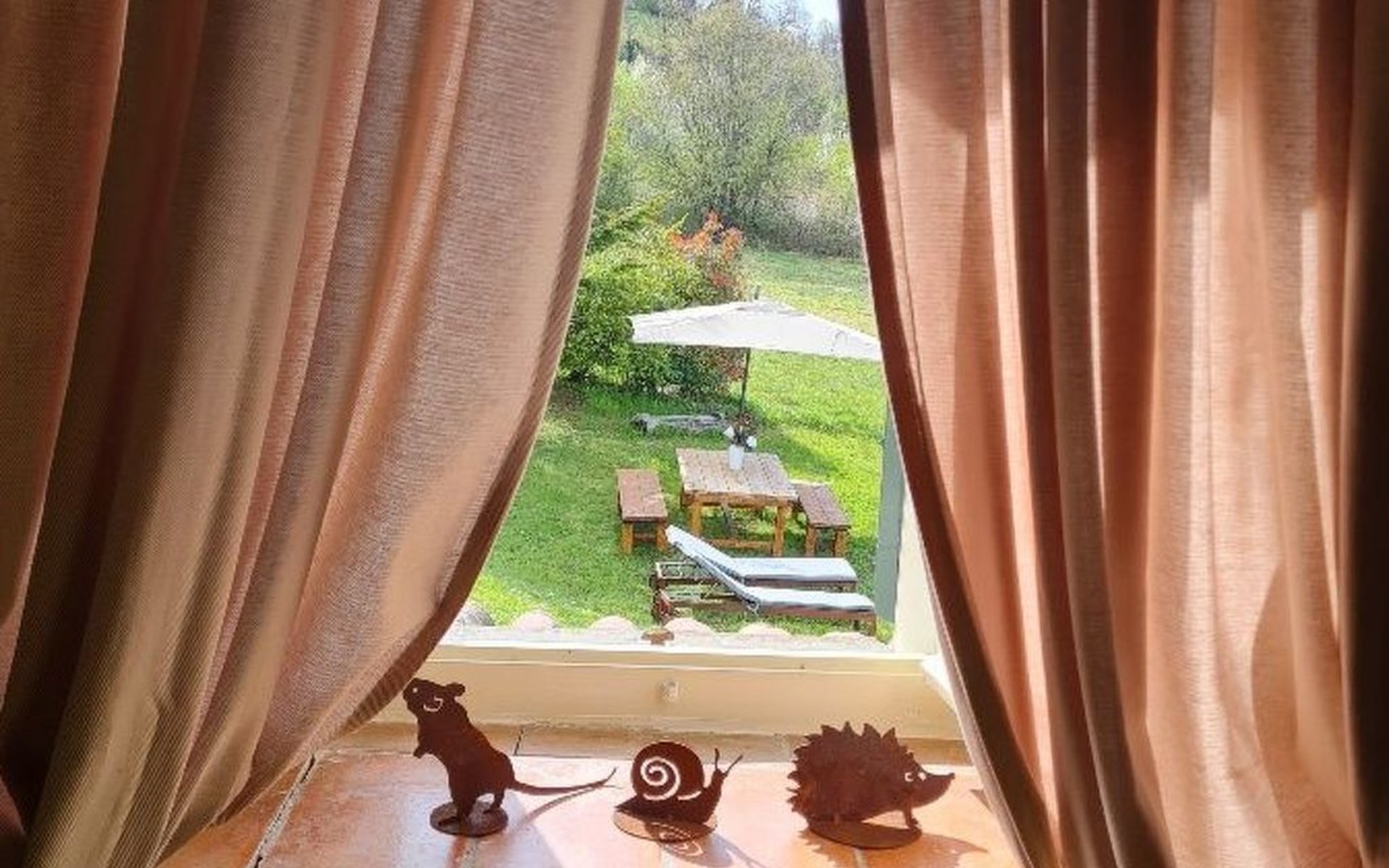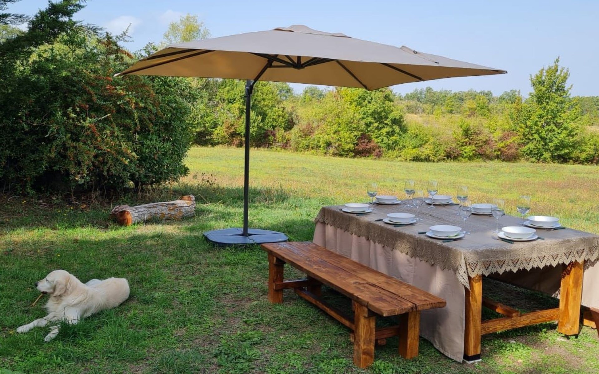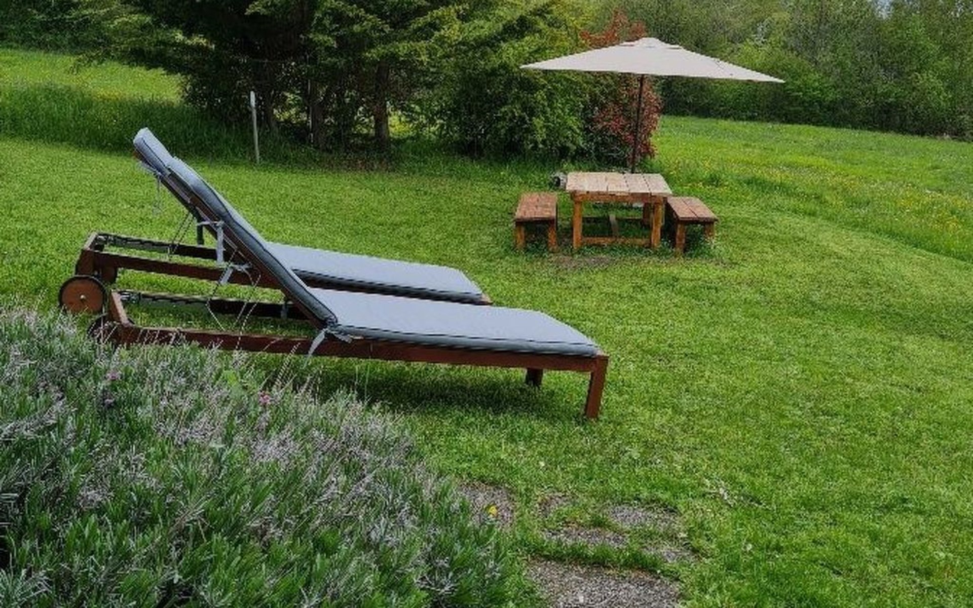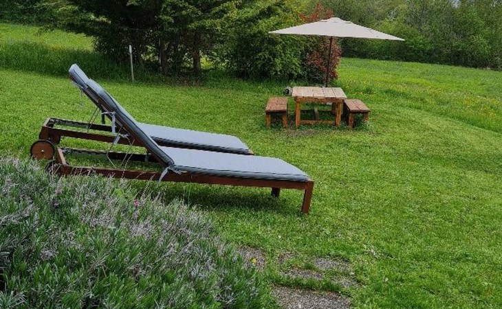 Großer Garten von 500 Quadratmetern komplett mit Gartengeräten, Esstisch, Stühlen, Sonnenschirm und Liegestühlen.