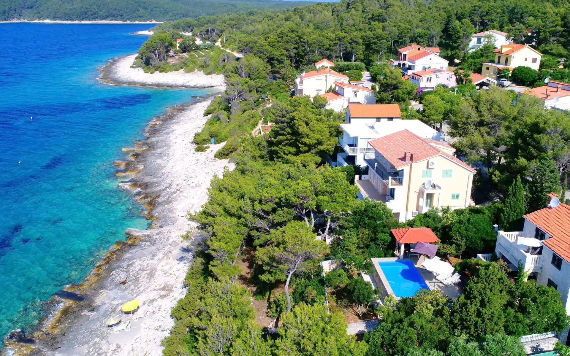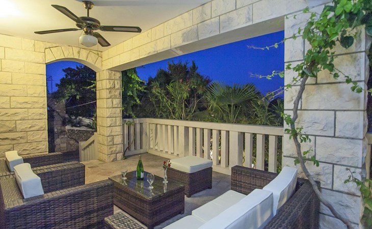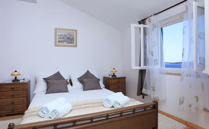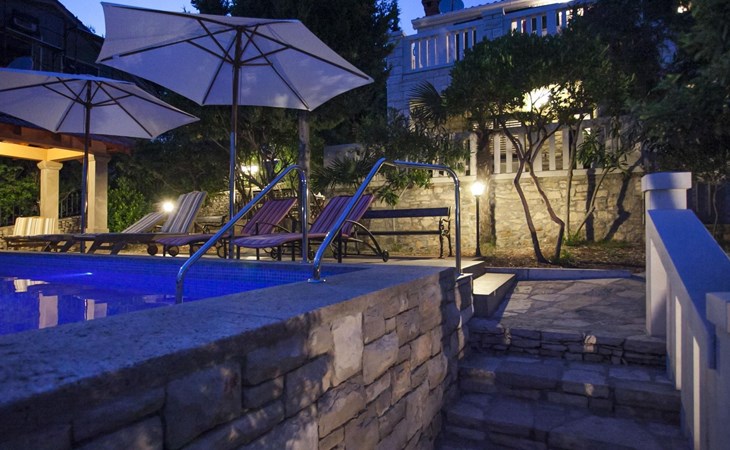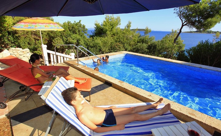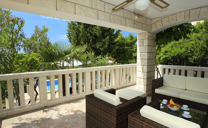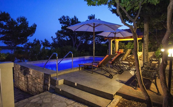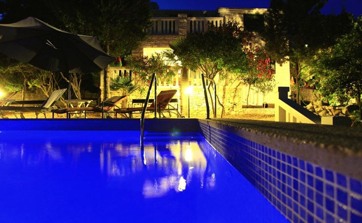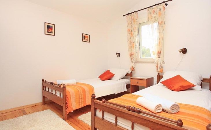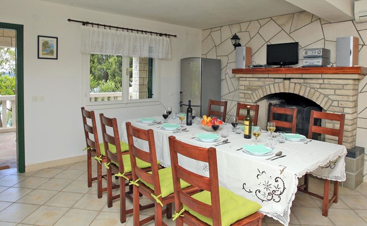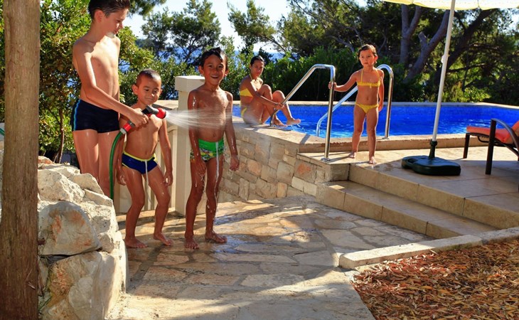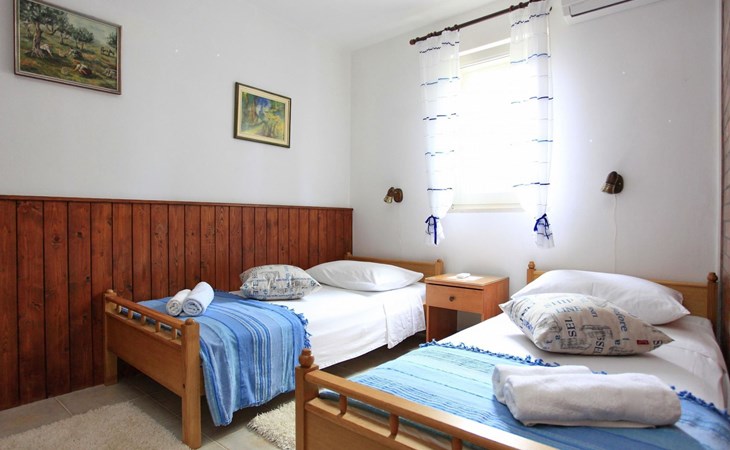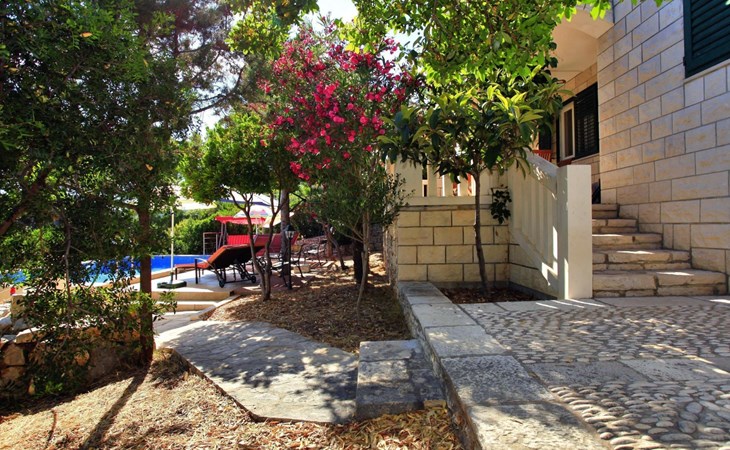 Bei diesem Haus handelt es sich um eine Steinvilla, gebaut im dalmatinischen Still, umgeben von einem Park mit typischen mediterranen Gewächsen, durch den ein Privatweg zum Strand führt. Die Villa besteht aus Erdgeschoss und erster Etage. Im Erdgeschoss sind Küche, Esszimmer mit Kamin, zwei Schlafzimmer und ein Badezimmer. Im ersten Stockwerk befinden sich die Aperitifbar mit Billardtisch, zwei Schlafzimmer mit Holzfußböden, ein Badezimmer und der Balkon. Die Etage wird über eine Außentreppe erreicht. Alle Zimmer verfügen über Klimaanlage. Zwei der vier Zimmer sind mit einem französischen Bett (150 x 195 cm) und die beiden anderen Zimmer mit je zwei Einzelbetten ( 90 x 195 cm) ausgestattet. Vom Haus gelangen Sie auf die große, teilweise überdachte Terrasse mit ihren gemütlichen Lounge Möbeln. Entspannen Sie am Pool und nutzen Sie zur Zubereitung der Mahlzeiten auch ruhig einmal den Außengrill. Es sind genügend Liegestühle vorhanden. Außerdem gibt es ein kleine Laube, die Schutz vor der Sonne spendet.