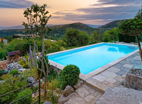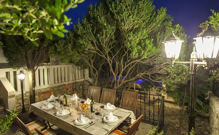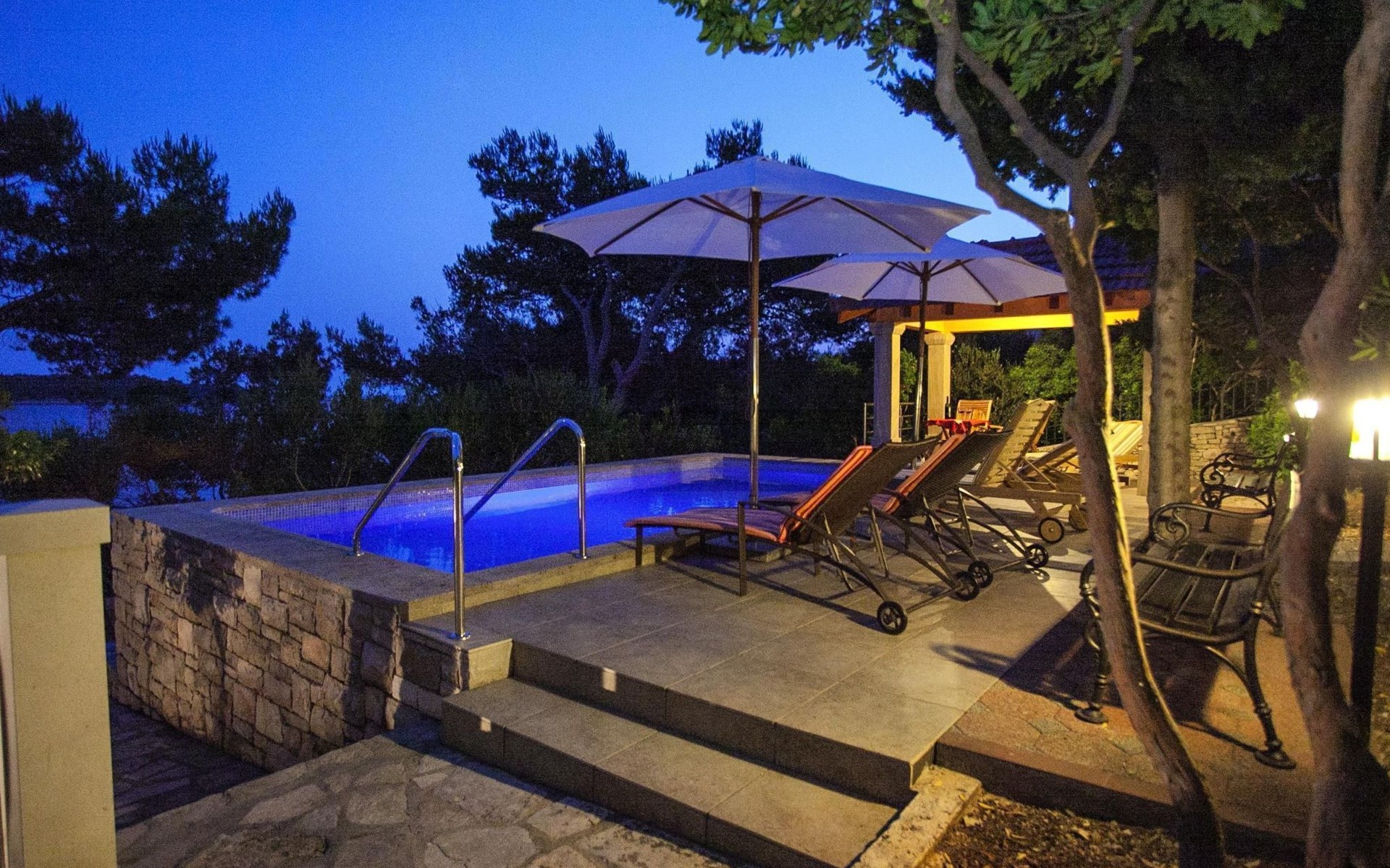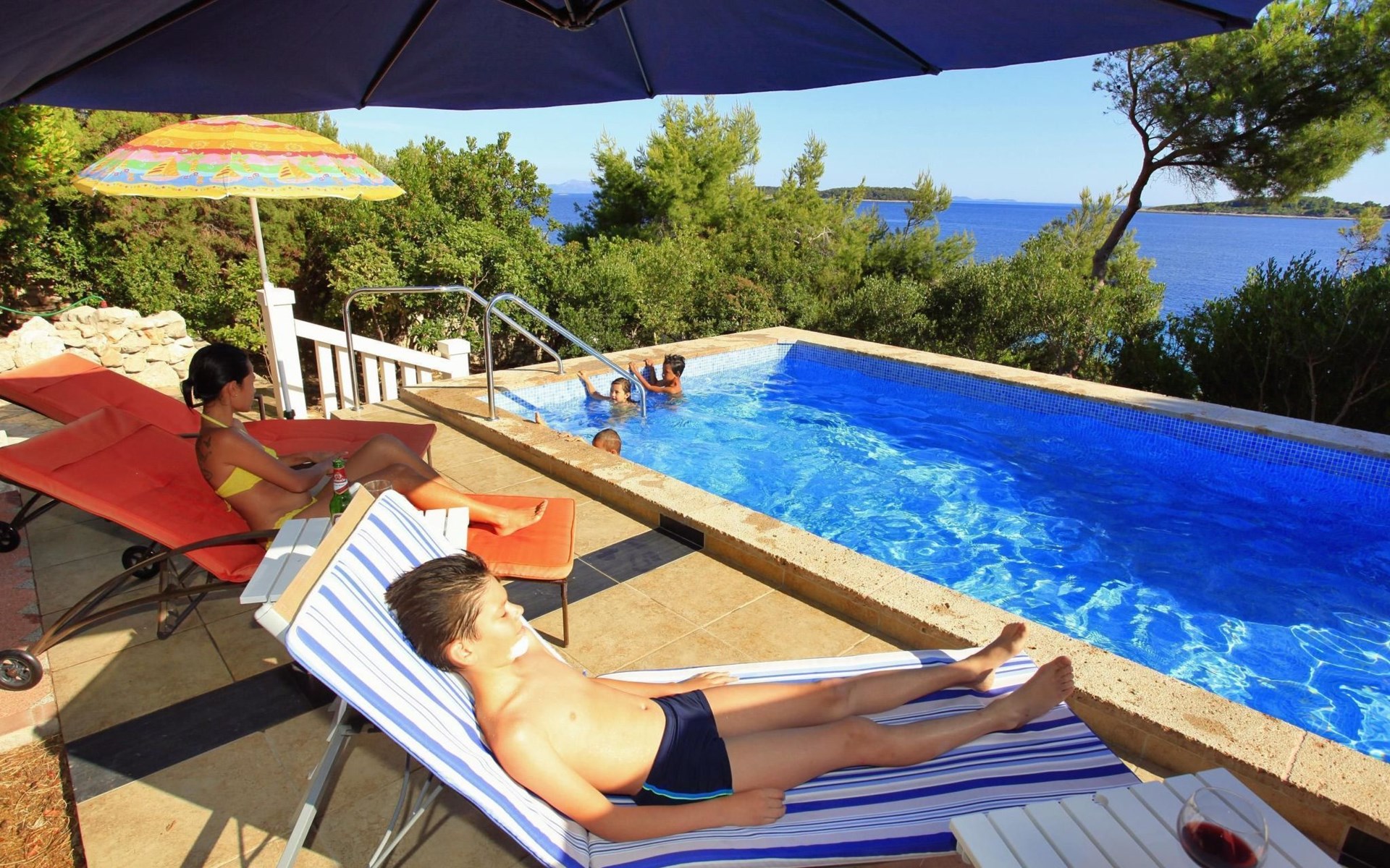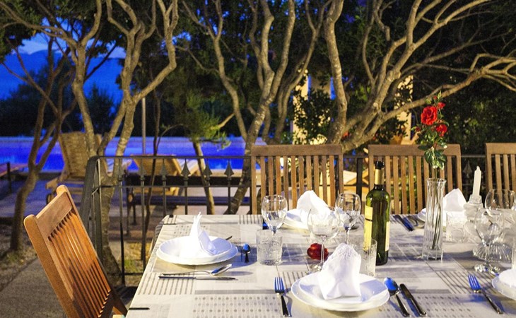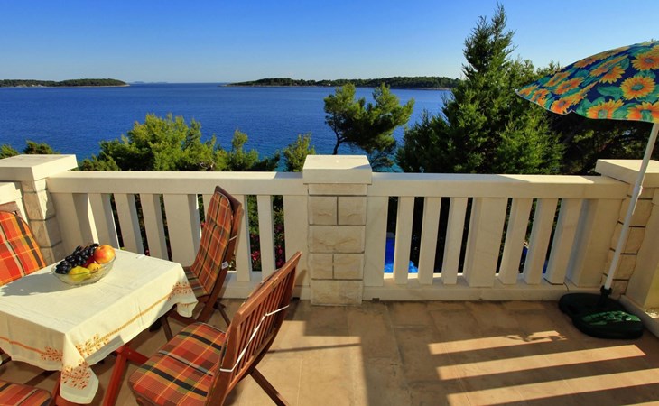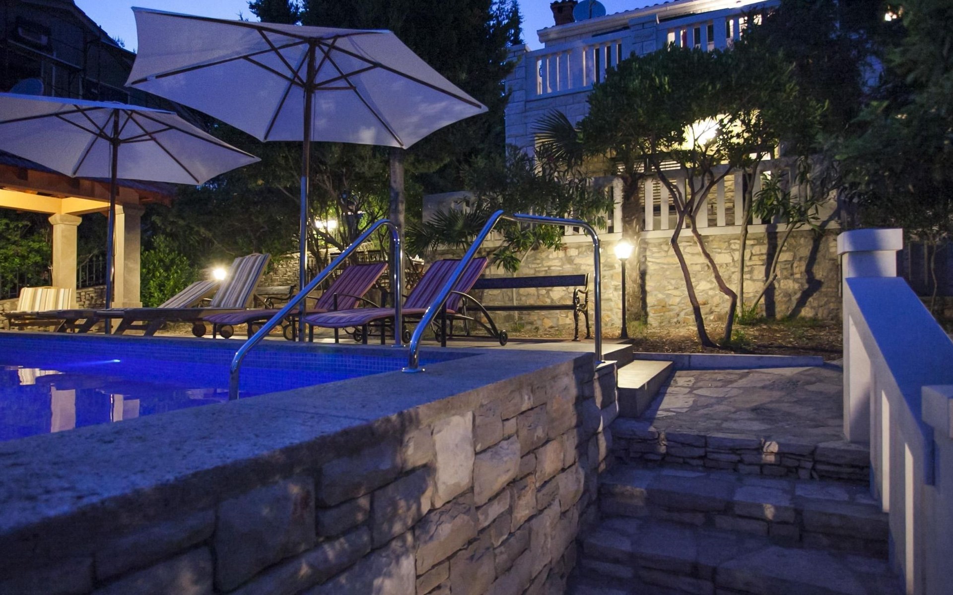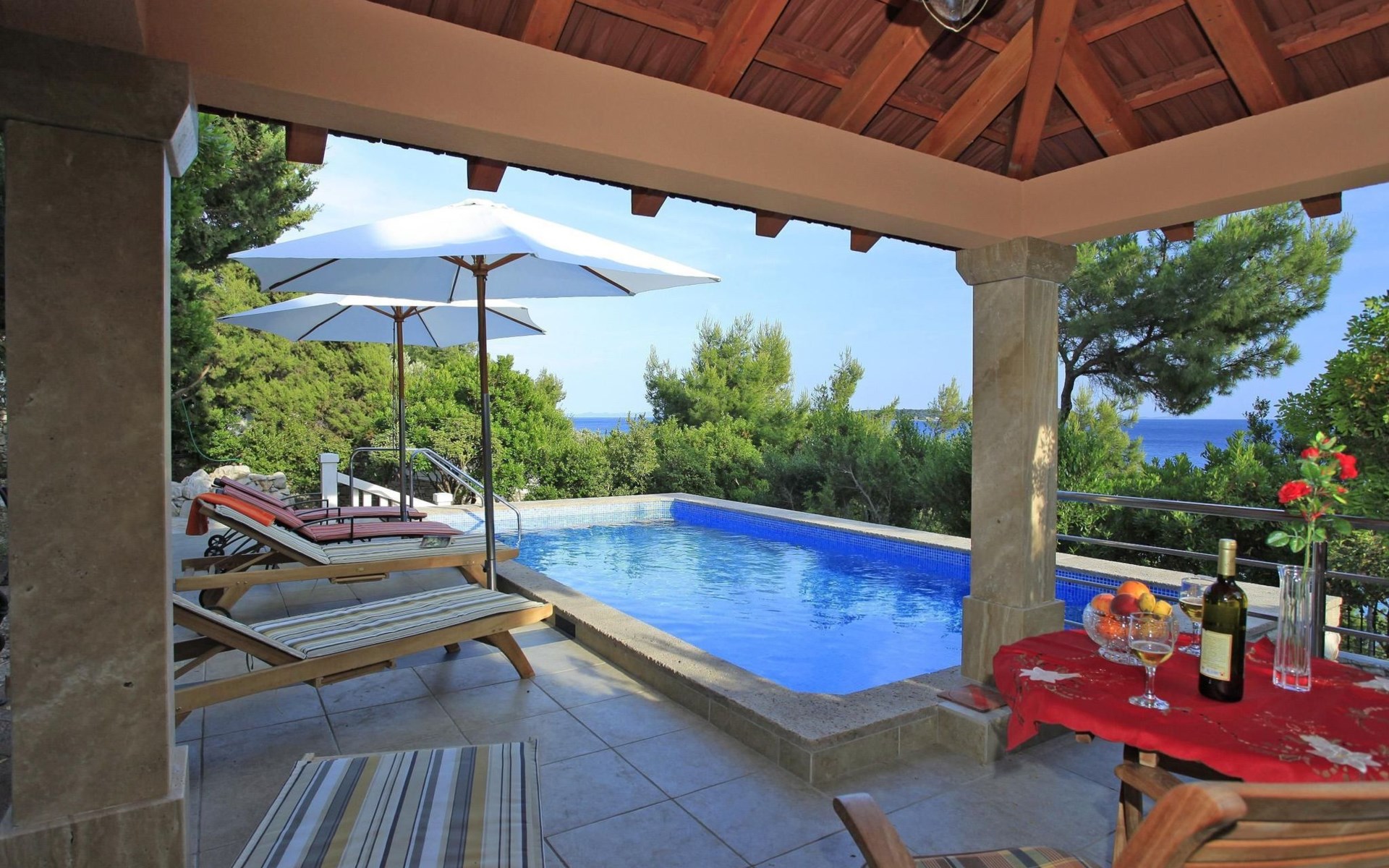 Bei diesem Haus handelt es sich um eine Steinvilla, gebaut im dalmatinischen Still, umgeben von einem Park mit typischen mediterranen Gewächsen, durch den ein Privatweg zum Strand führt. Die Villa besteht aus Erdgeschoss und erster Etage. Im Erdgeschoss sind Küche, Esszimmer mit Kamin, zwei Schlafzimmer und ein Badezimmer. Im ersten Stockwerk befinden sich die Aperitifbar mit Billardtisch, zwei Schlafzimmer mit Holzfußböden, ein Badezimmer und der Balkon. Die Etage wird über eine Außentreppe erreicht. Alle Zimmer verfügen über Klimaanlage. Zwei der vier Zimmer sind mit einem französischen Bett (150 x 195 cm) und die beiden anderen Zimmer mit je zwei Einzelbetten ( 90 x 195 cm) ausgestattet. Vom Haus gelangen Sie auf die große, teilweise überdachte Terrasse mit ihren gemütlichen Lounge Möbeln. Entspannen Sie am Pool und nutzen Sie zur Zubereitung der Mahlzeiten auch ruhig einmal den Außengrill. Es sind genügend Liegestühle vorhanden. Außerdem gibt es ein kleine Laube, die Schutz vor der Sonne spendet.