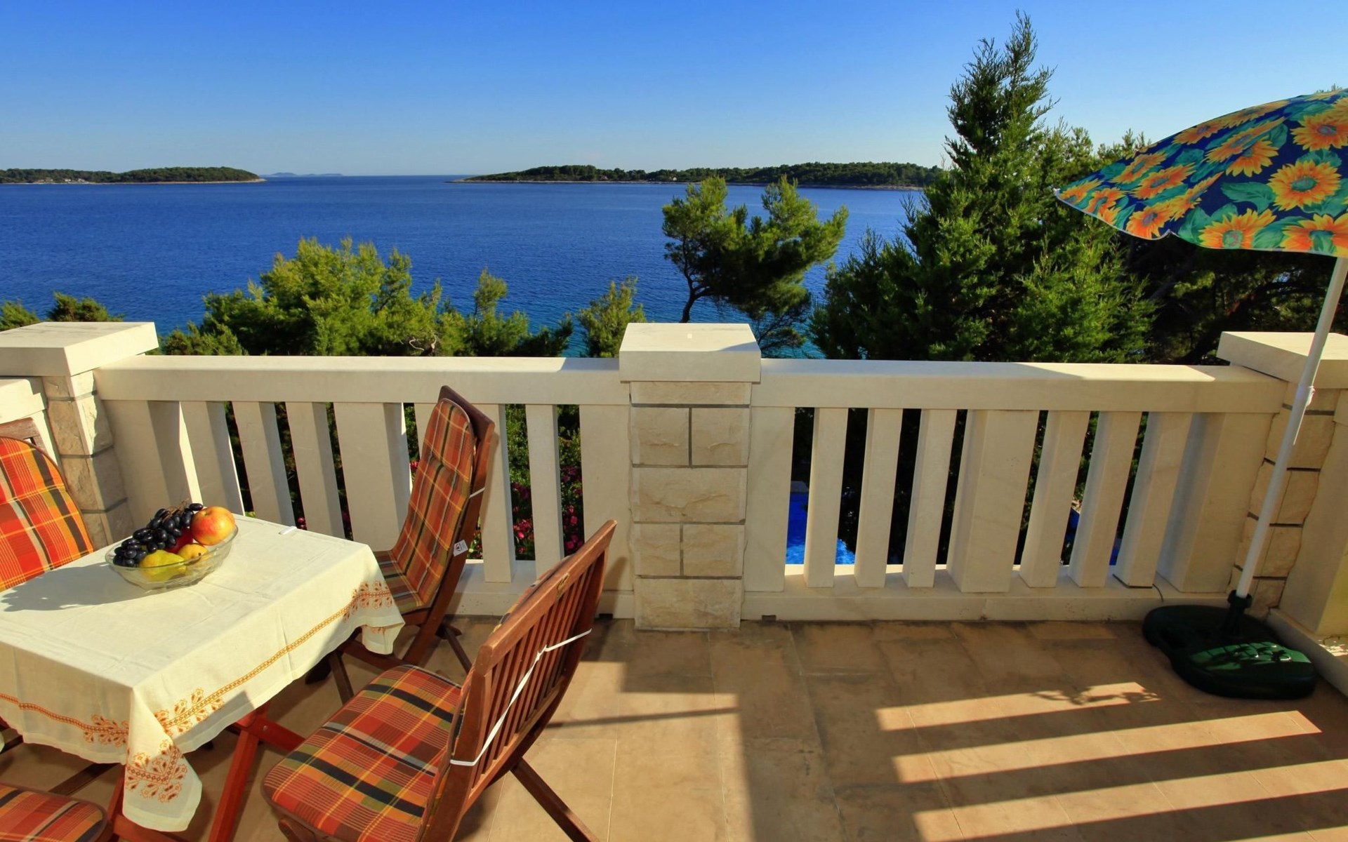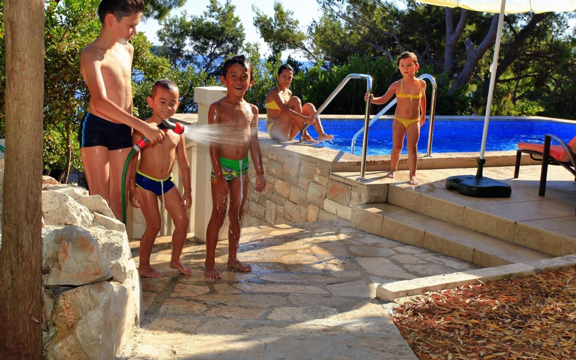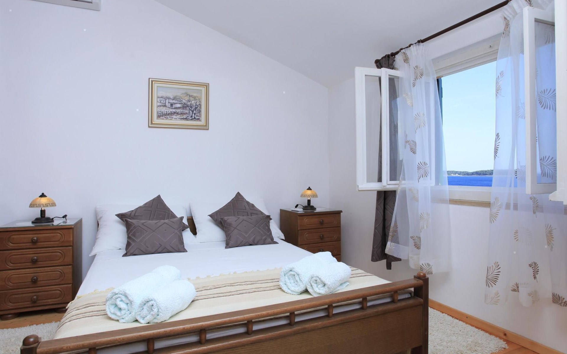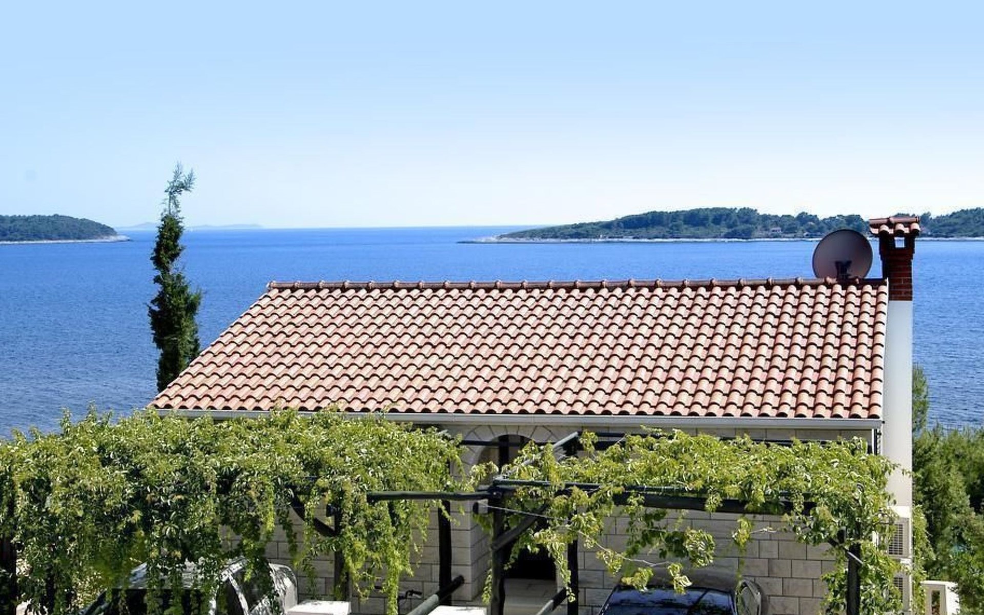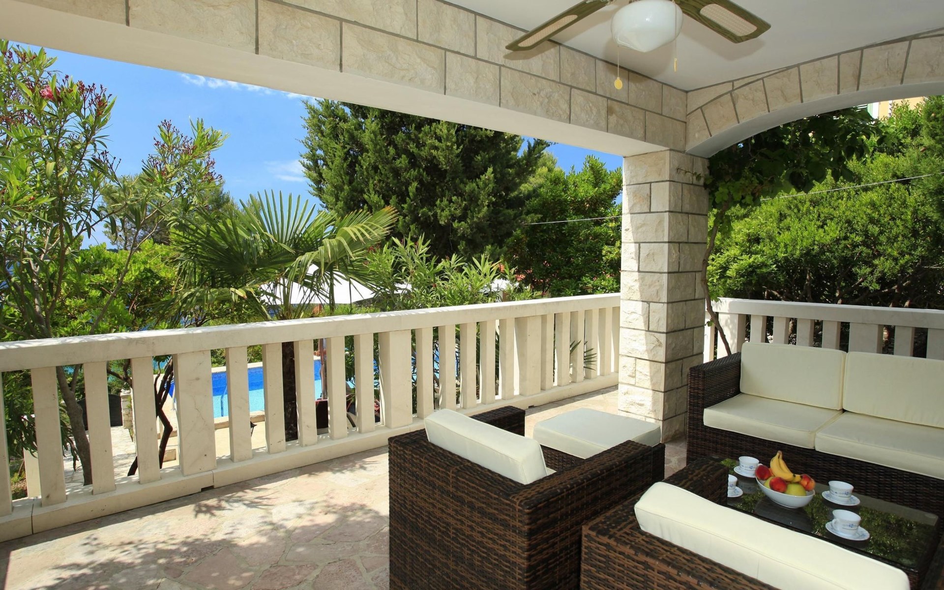 Bei diesem Haus handelt es sich um eine Steinvilla, gebaut im dalmatinischen Still, umgeben von einem Park mit typischen mediterranen Gewächsen, durch den ein Privatweg zum Strand führt. Die Villa besteht aus Erdgeschoss und erster Etage. Im Erdgeschoss sind Küche, Esszimmer mit Kamin, zwei Schlafzimmer und ein Badezimmer. Im ersten Stockwerk befinden sich die Aperitifbar mit Billardtisch, zwei Schlafzimmer mit Holzfußböden, ein Badezimmer und der Balkon. Die Etage wird über eine Außentreppe erreicht. Alle Zimmer verfügen über Klimaanlage. Zwei der vier Zimmer sind mit einem französischen Bett (150 x 195 cm) und die beiden anderen Zimmer mit je zwei Einzelbetten ( 90 x 195 cm) ausgestattet. Vom Haus gelangen Sie auf die große, teilweise überdachte Terrasse mit ihren gemütlichen Lounge Möbeln. Entspannen Sie am Pool und nutzen Sie zur Zubereitung der Mahlzeiten auch ruhig einmal den Außengrill. Es sind genügend Liegestühle vorhanden. Außerdem gibt es ein kleine Laube, die Schutz vor der Sonne spendet.