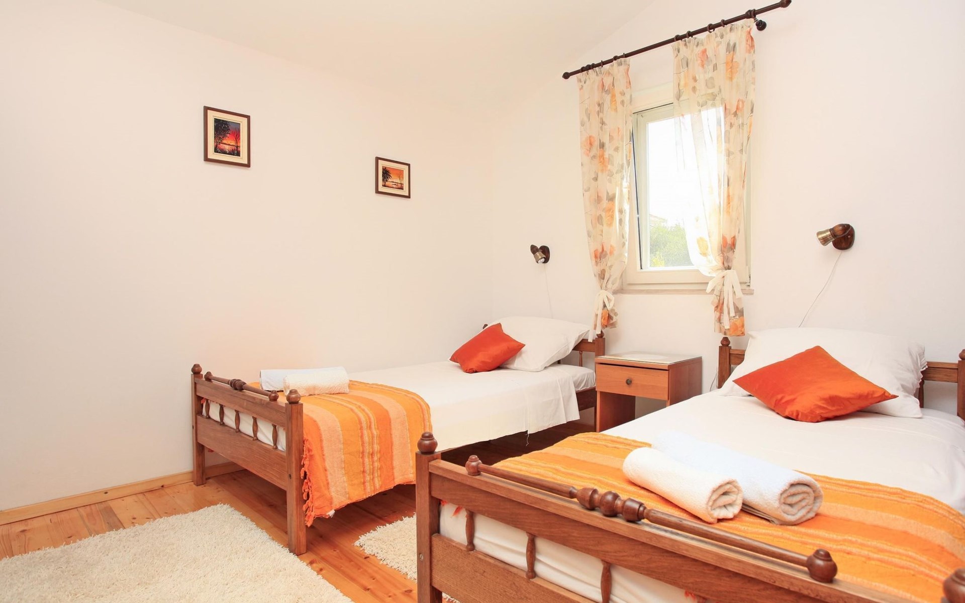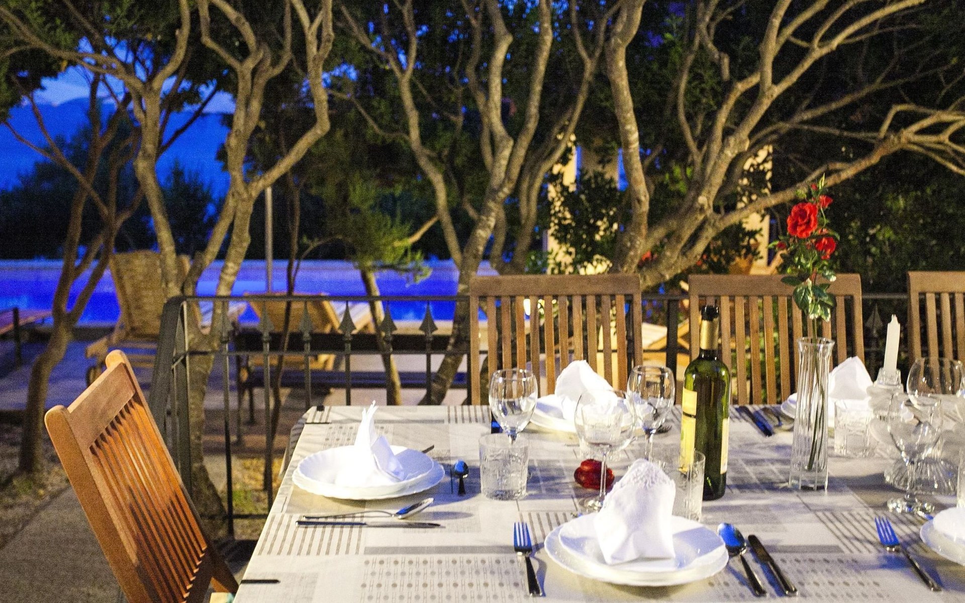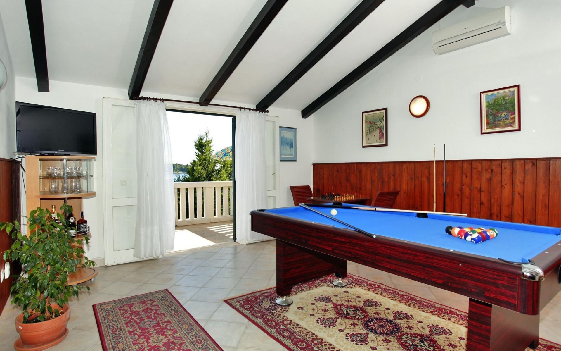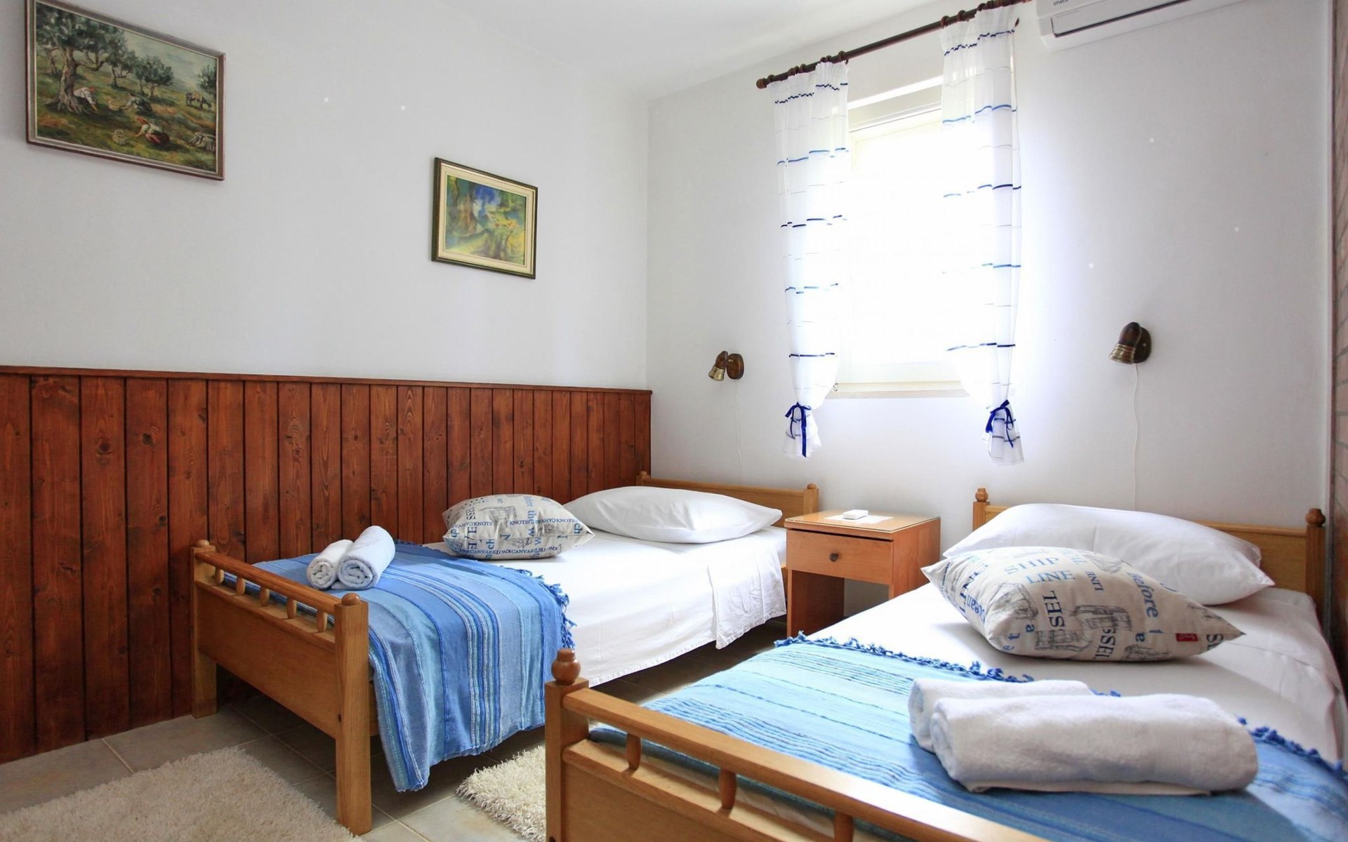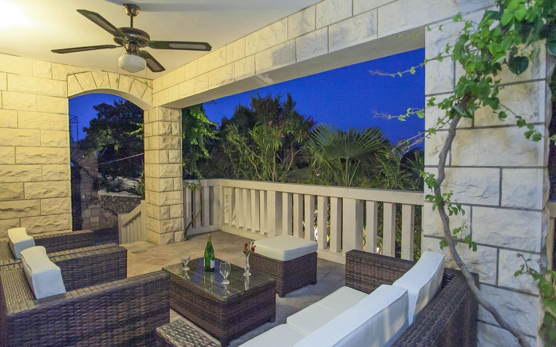 Bei diesem Haus handelt es sich um eine Steinvilla, gebaut im dalmatinischen Still, umgeben von einem Park mit typischen mediterranen Gewächsen, durch den ein Privatweg zum Strand führt. Die Villa besteht aus Erdgeschoss und erster Etage. Im Erdgeschoss sind Küche, Esszimmer mit Kamin, zwei Schlafzimmer und ein Badezimmer. Im ersten Stockwerk befinden sich die Aperitifbar mit Billardtisch, zwei Schlafzimmer mit Holzfußböden, ein Badezimmer und der Balkon. Die Etage wird über eine Außentreppe erreicht. Alle Zimmer verfügen über Klimaanlage. Zwei der vier Zimmer sind mit einem französischen Bett (150 x 195 cm) und die beiden anderen Zimmer mit je zwei Einzelbetten ( 90 x 195 cm) ausgestattet. Vom Haus gelangen Sie auf die große, teilweise überdachte Terrasse mit ihren gemütlichen Lounge Möbeln. Entspannen Sie am Pool und nutzen Sie zur Zubereitung der Mahlzeiten auch ruhig einmal den Außengrill. Es sind genügend Liegestühle vorhanden. Außerdem gibt es ein kleine Laube, die Schutz vor der Sonne spendet.