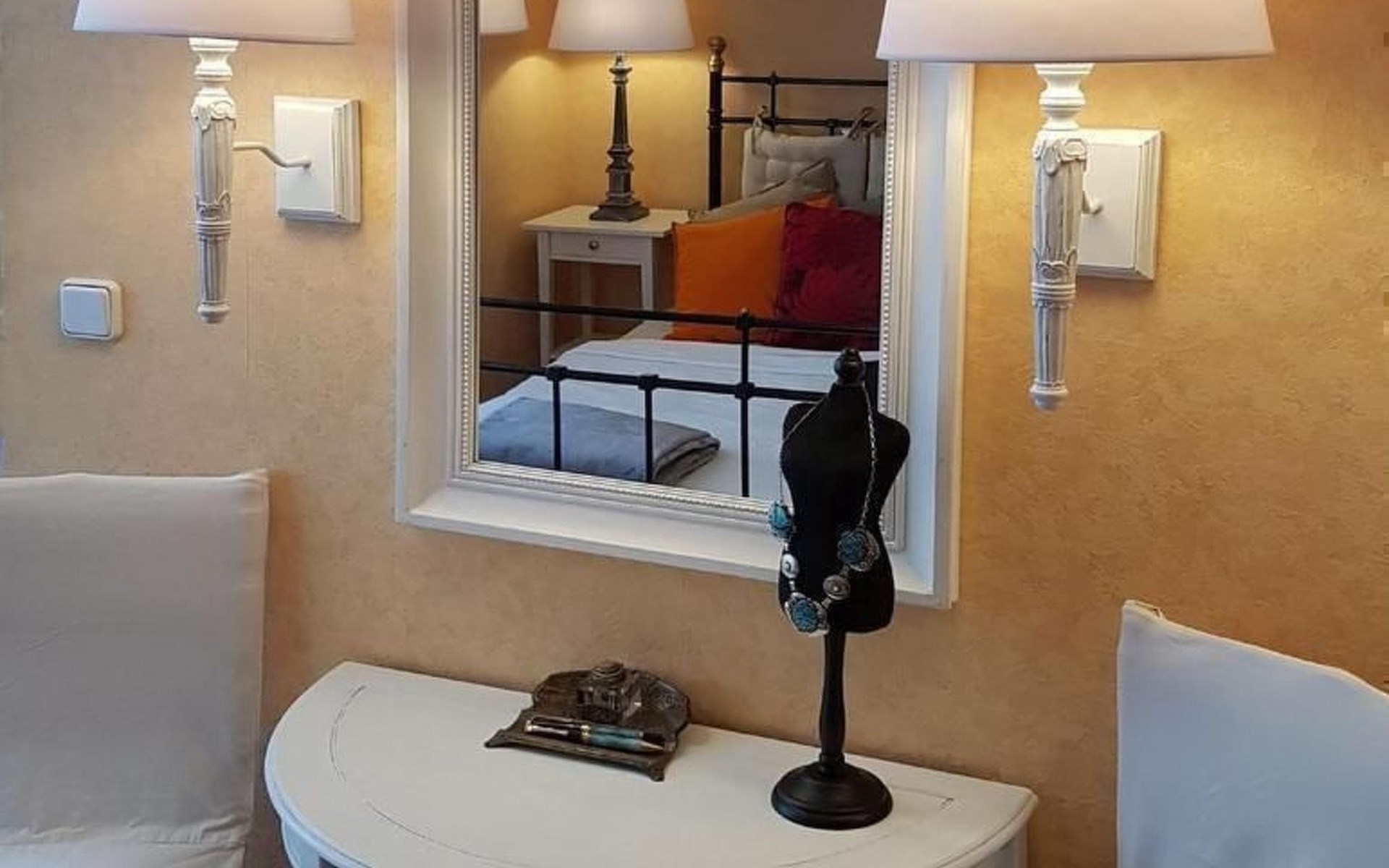 KurzbeschreibungNichtraucherhausKüche 1Küchenmöbel, 4-Flammen-Gasherd, Geschirrspüler, Kühlschrank, Gefrierschrank, Mikrowelle, Toaster, Minibackofen. Sie finden bei uns alles von A wie Austernmesser bis Z wie Zitronenpresse.Wohnzimmer 1Schlafcouch (140x190 cm), Couchtisch, 2 Sessel, offener Kamin, Regale mit Büchern und Spielen, Stereoanlage, Fernseher (SAT-Empfang), DVD-PlayerSchlafzimmer 1Doppelbett (180x200 cm), Einzelbett (90x200 cm), Kleiderschrank, Kommode, Tisch und 2 Stühle, Ventilator, StandspiegelSchlafzimmer 2Doppelbett (140x200 cm), Kleiderschrank, Kommode, SekretärBadezimmer 1Dusche, Waschtisch, WC, EinbauschrankNebengebäude vom Innenhof zugänglich: WC und Waschbecken, Abstellfläche