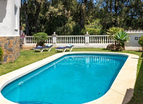 Im Aussenbereich der erfrischende private Pool mit Sonnenterasse und Aussengrill. Von hier aus hat meinen einen atemberaubenden Ausblick auf die Küste und die Bergwelt der Axarquia.