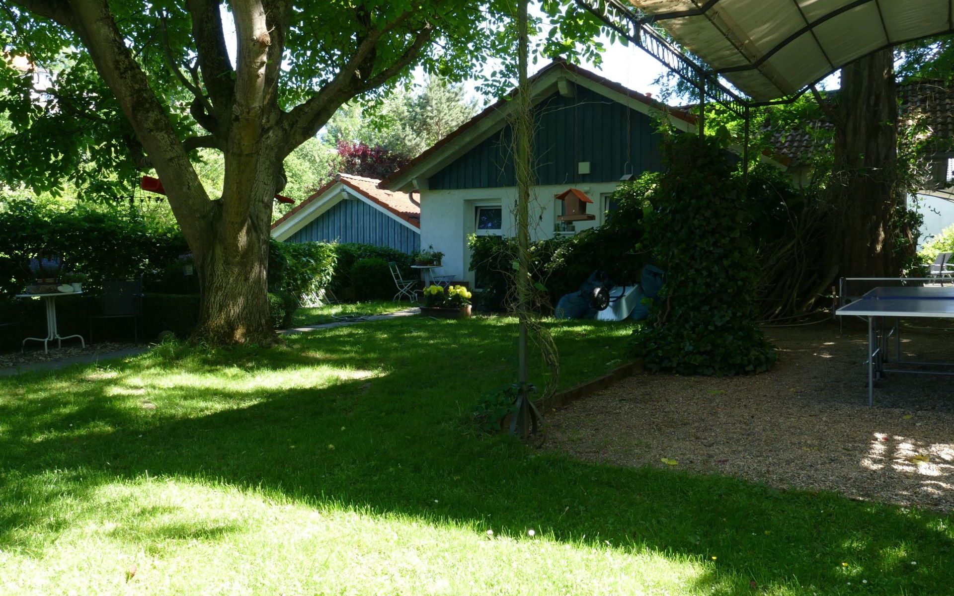 Im Außenbereich erwartet Sie eine Südterrasse mit einem Sonnenschirm sowie weitere überdachte Sitzplätze im liebevoll gestalteten Garten. Für Spielfreude unter freiem Himmel sorgen eine Rutsche, Spielgeräte und eine Tischtennisplatte. Hier können Sie entspannte Stunden verbringen, während sich die Kinder austoben. Der gepflegte Garten mit Grill und Pavillon lädt zu gemütlichen Stunden im Freien ein und bietet den perfekten Rahmen für gesellige Abende.