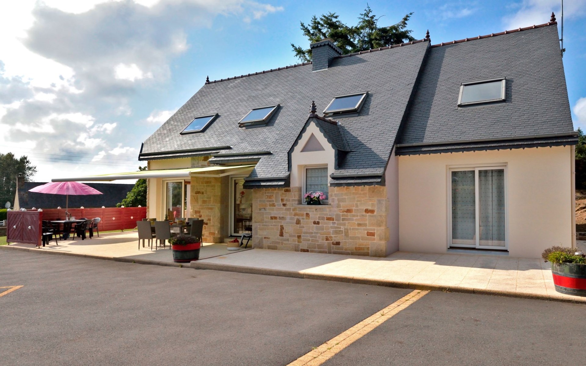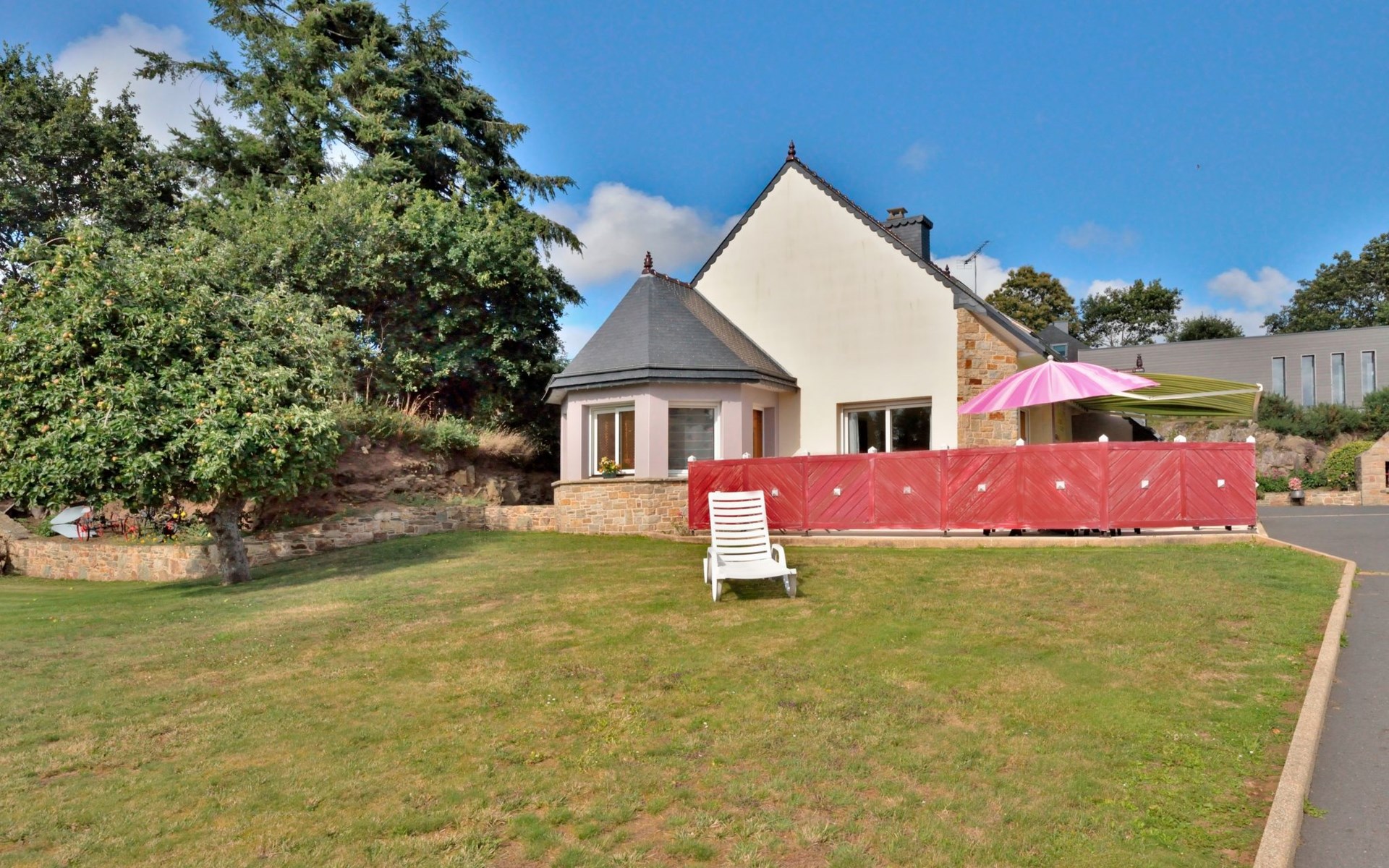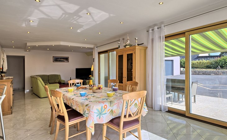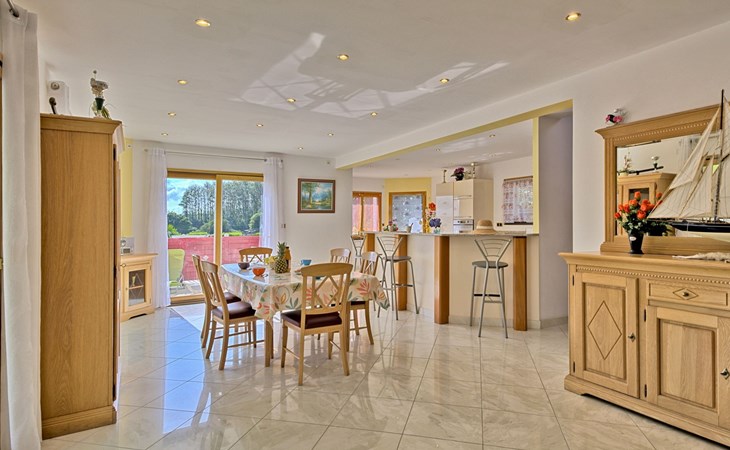 Grosses, schönes Einfamilienhaus "Ty Ker", auf 2 Stockwerken. Im Weiler Ruvignolet, 2.5 km vom Zentrum von Ploubezre, 5 km vom Zentrum von Lannion, erhöhte Lage, 10 km vom Meer, an einer Hauptstrasse. Zur Alleinbenutzung: Grundstück 2'200 m2 (eingezäunt) mit Rasen und Bäumen, Hof, Parkplatz (überdacht) auf dem Grundstück, Einzelgarage. Einkaufsgeschäft 2.3 km, Lebensmittelgeschäft 2.3 km, Supermarkt 2.5 km, Restaurant 2.3 km, Bar 2.3 km, Bäckerei 2.3 km, Bushaltestelle 3 km, Sandstrand 10 km, Hallenbad 4 km. Golfplatz (18 Loch) 16 km, Tennis 2.3 km, Tennishalle 7 km, Wanderwege ab Haus 3 km. Nahe gelegene Sehenswürdigkeiten: Château de Tonquédec 6 km.