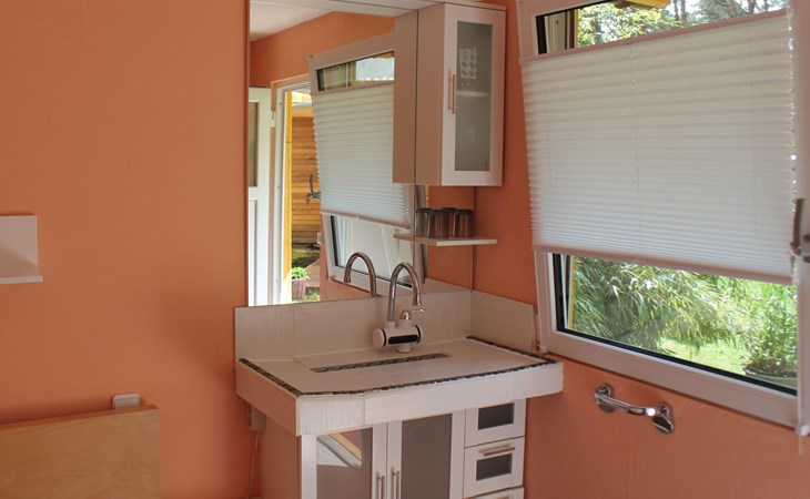 Im Inneren des Bungalows erwarten Sie zwei Schlafzimmer mit Doppelbetten (140 cm und 180 cm), die mittels Glasschiebetüren für Privatsphäre vom Wohnbereich abgetrennt werden können. Das separate Schlafhaus, welches an die Terrasse anschließt und vom Haupthaus getrennt ist, verfügt über ein weiteres 140 cm Bett. Die voll ausgestattete Küche ist in das Wohnzimmer integriert und enthält Mikrowelle, Geschirrspüler, Herd, Backofen, Kaffeemaschine, Kühlschrank, Gefrierschrank und Dunstabzug über einem separaten Esstisch für bis zu 6 Personen. Komplettiert wird das Angebot durch ein modernes Duschbad mit allen Notwendigkeiten und ein durch eine Luft-Wärmepumpe vollklimatisiertes Haus für optimales Raumklima zu jeder Jahreszeit.