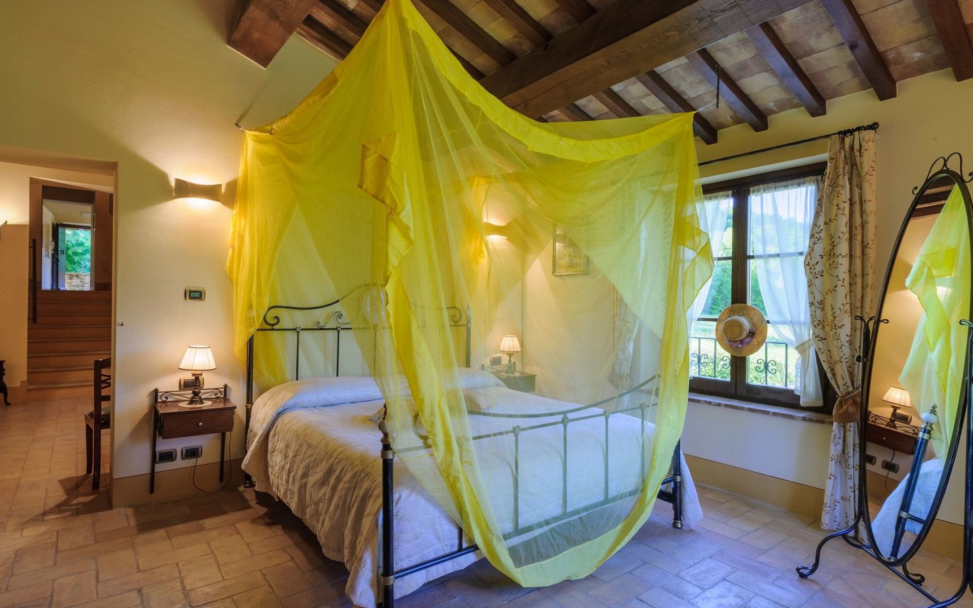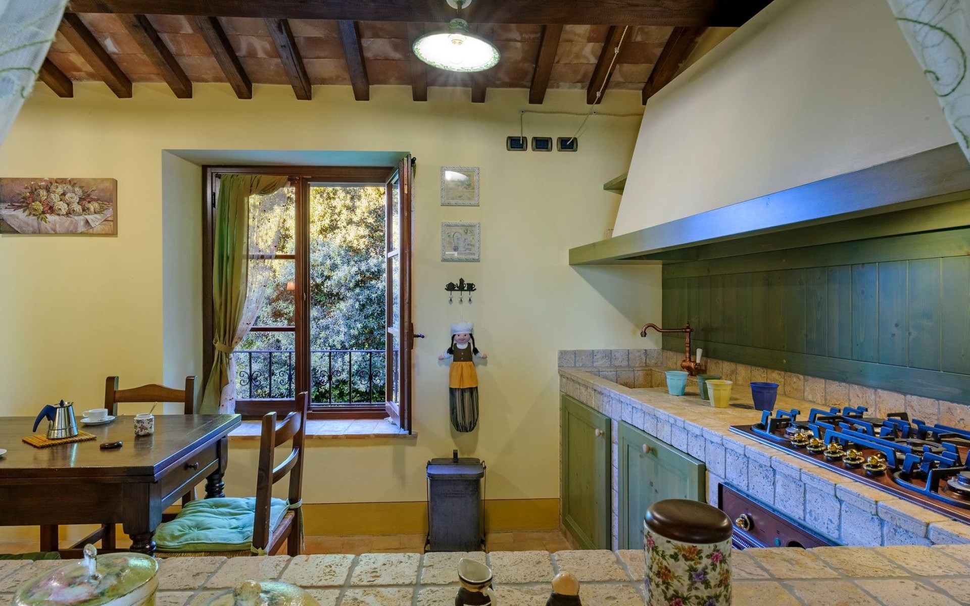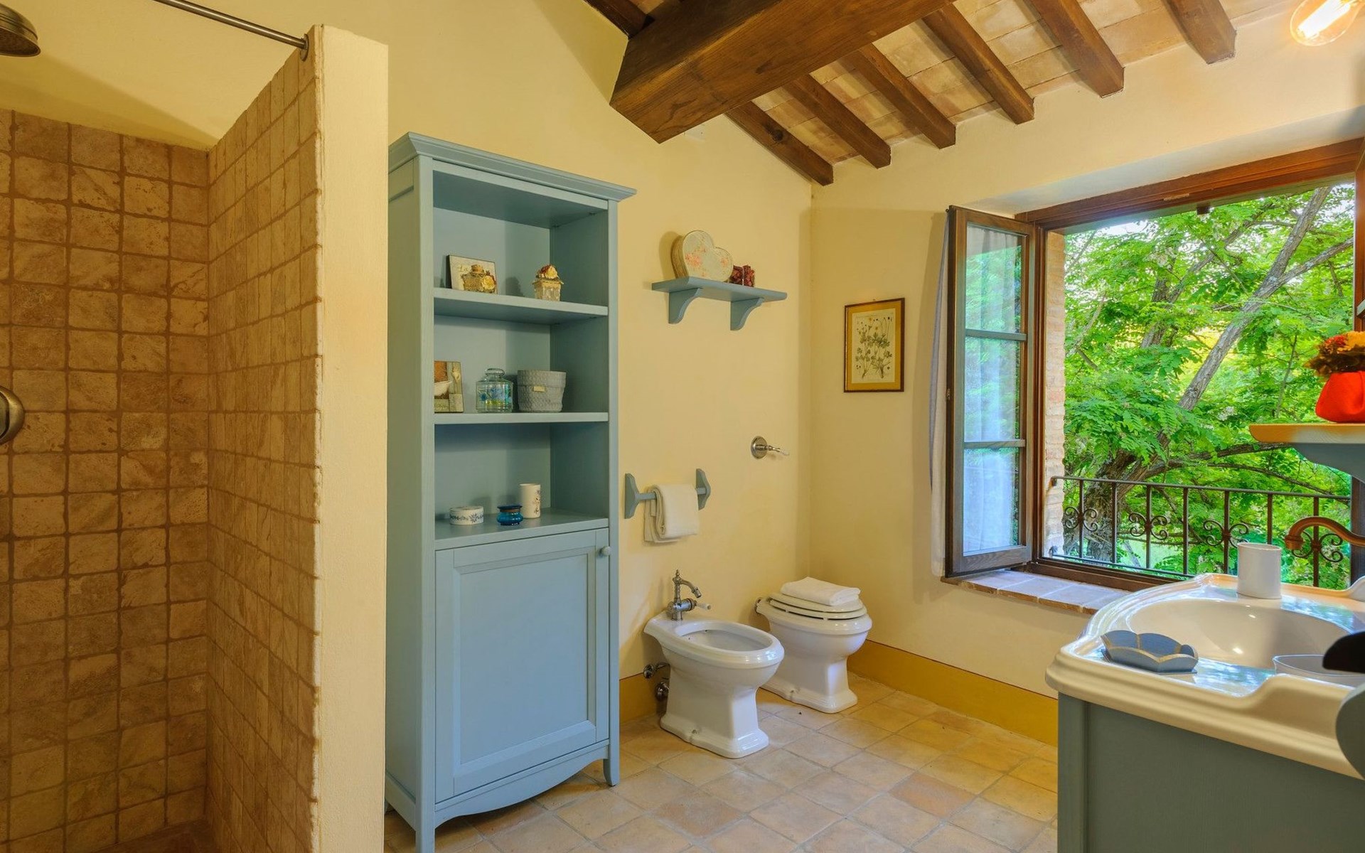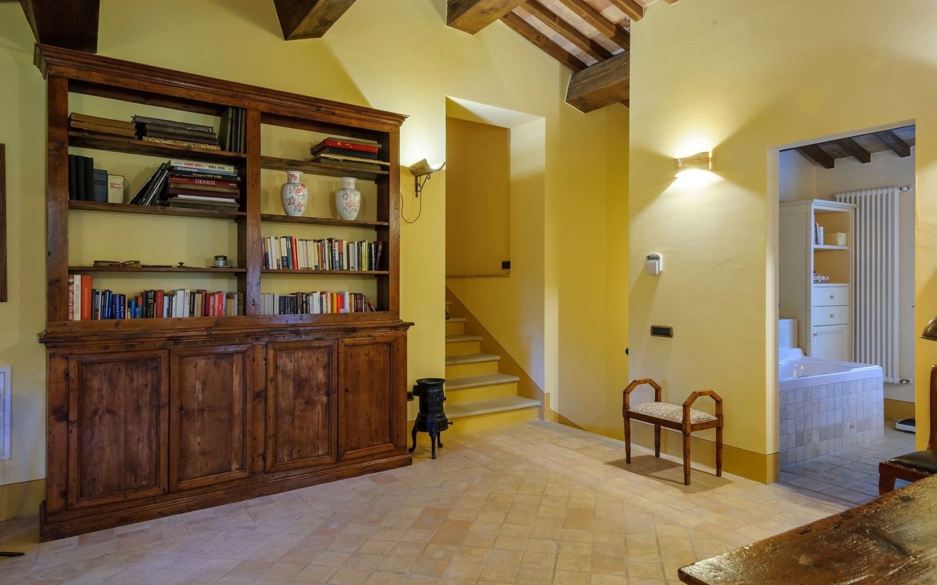 FAMILIEN-SUITE (mit eigenem Eingang und Außentreppe, intern mit dem Rest des ersten Stocks verbunden): Doppelzimmer mit eigenem Bad (Dusche) und Waschmaschine, Küche mit Kamin, Doppelschlafcouch.
