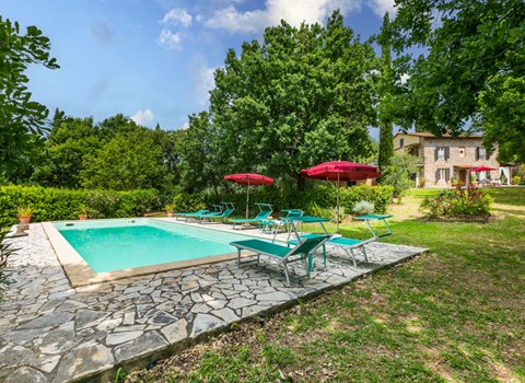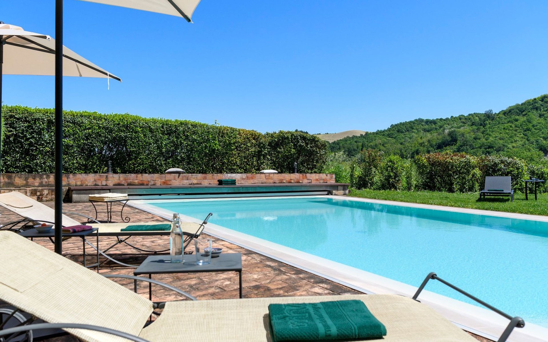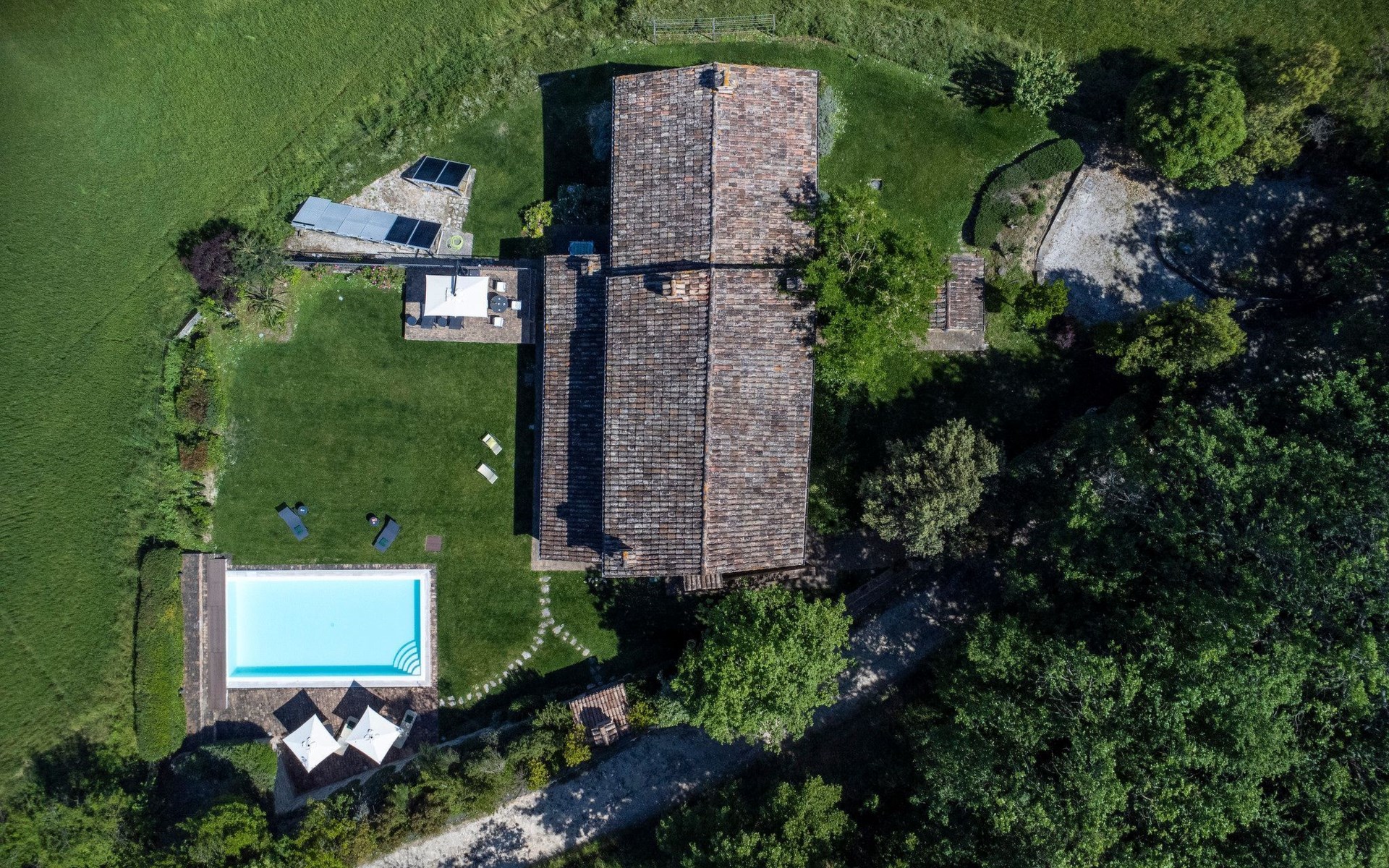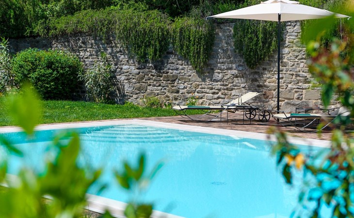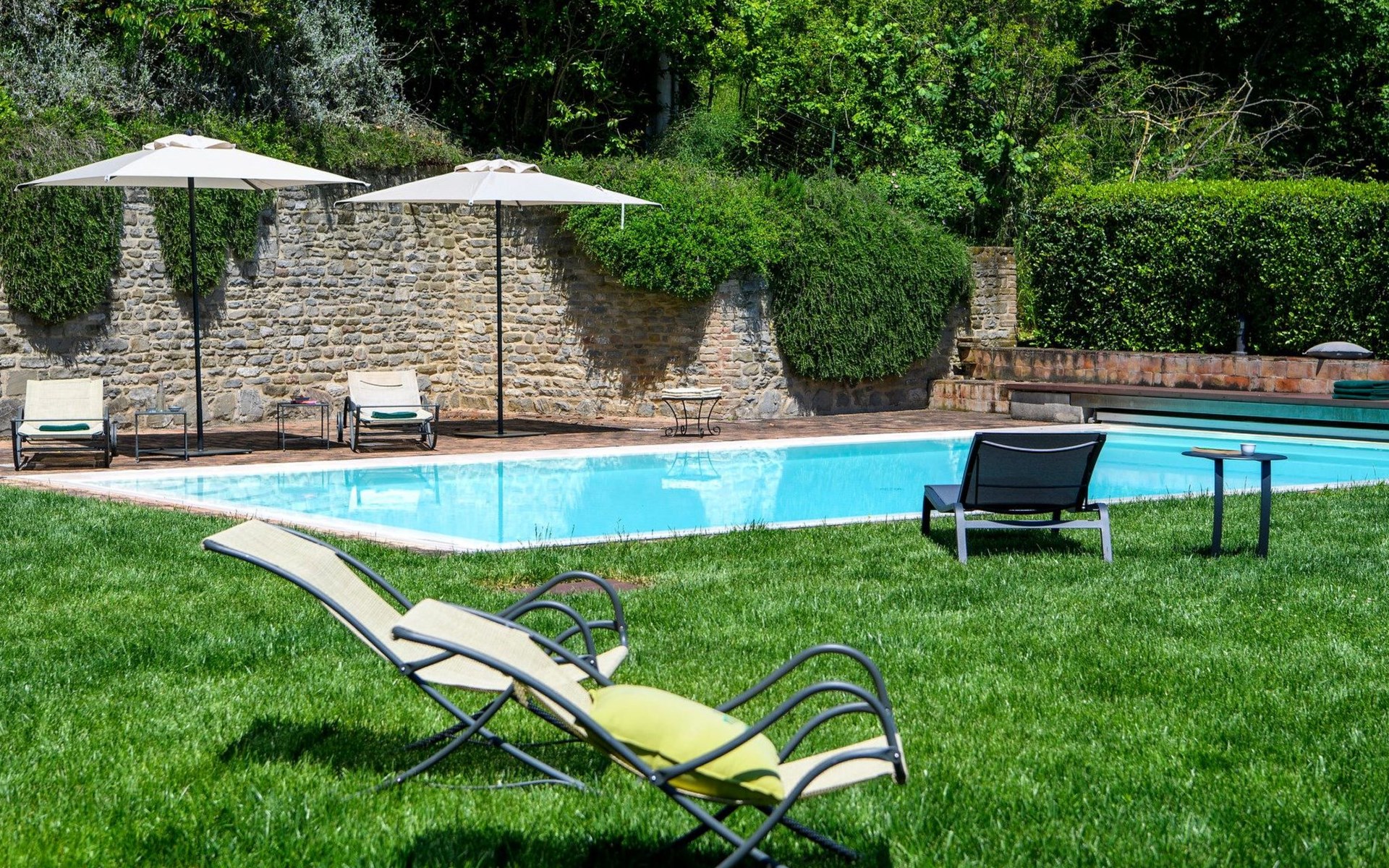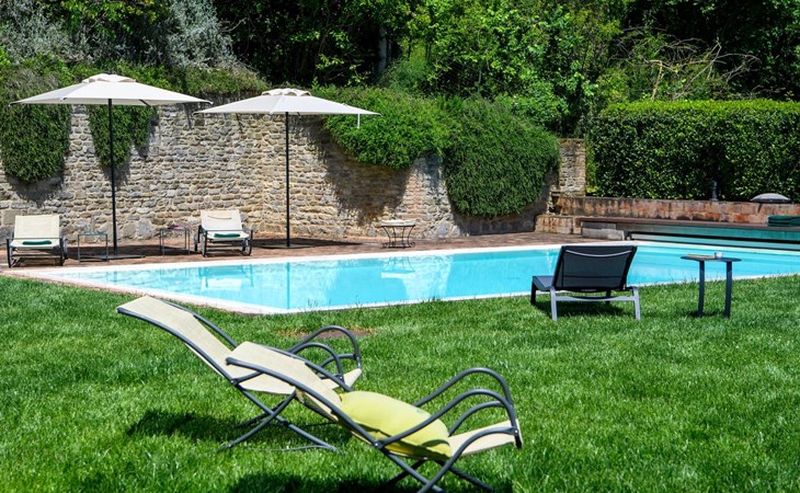 Der private Infinity-Pool mit beigem PVC-Belag und Sauerstoff-Filtersystem ist 10 x 5 m groß und hat eine einheitliche Tiefe von 1,40 m. Er ist über eine bequeme römische Treppe erreichbar und verfügt über eine Innen- und Außenbeleuchtung, ideal für ein angenehmes Bad auch in den Abendstunden. Das gemauerte und mit Sonnenliegen ausgestattete Solarium fügt sich harmonisch in die natürliche Umgebung des Gartens ein und bietet einen perfekten Raum für die Entspannung im Freien.