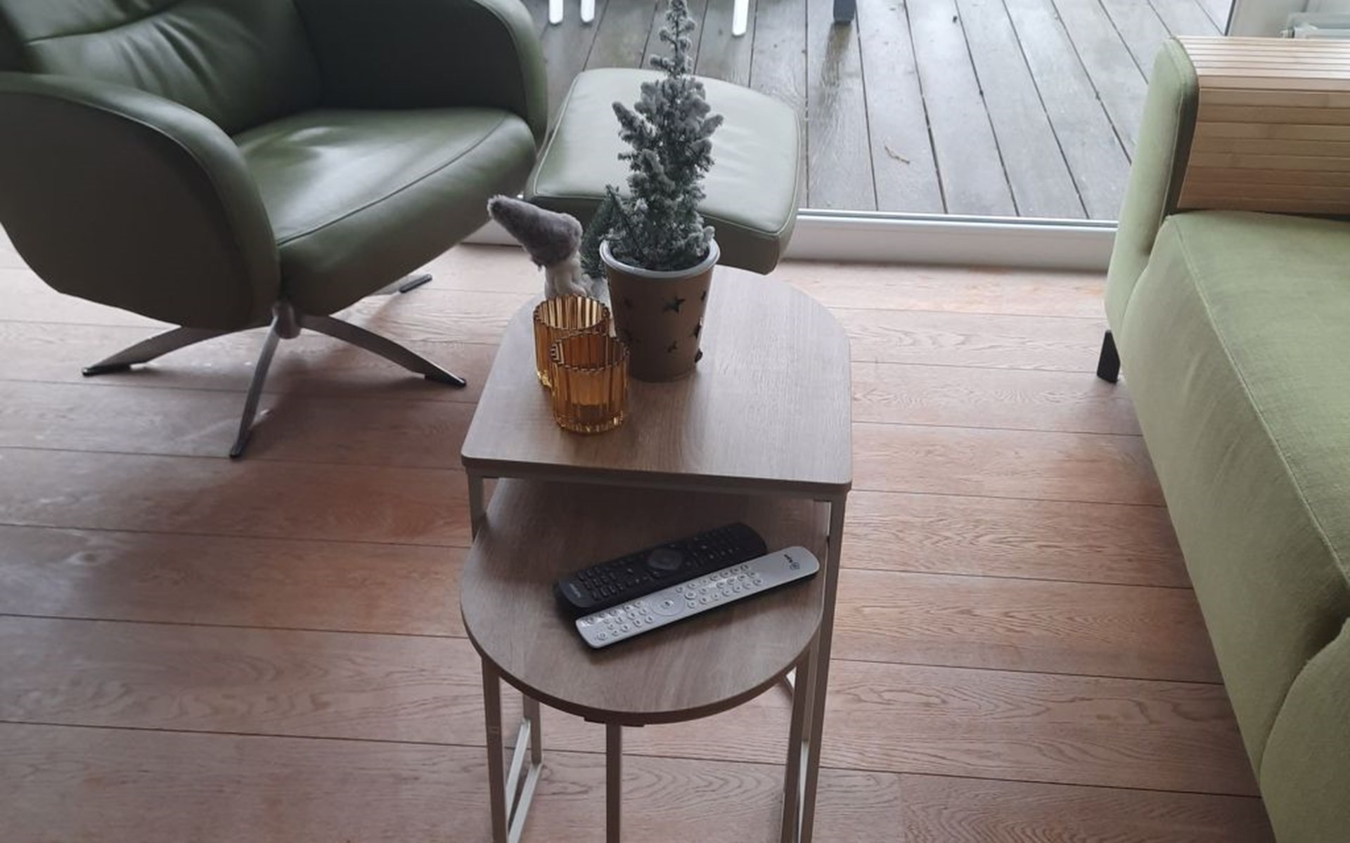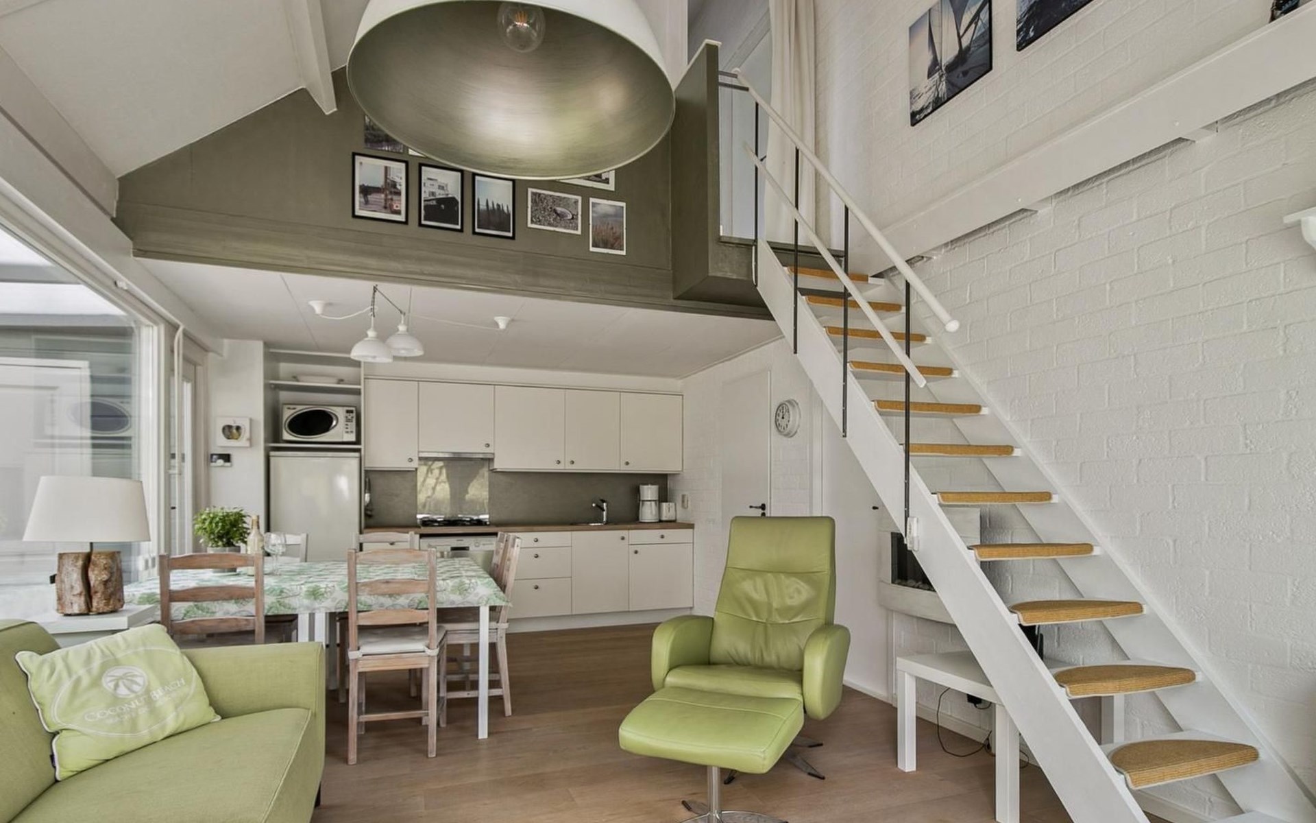 Das Erdgeschoss ist mit einem gemütlichen Wohnzimmer eingerichtet. Hier finden Sie ein Sofa mit Fernseher und einen Esstisch.