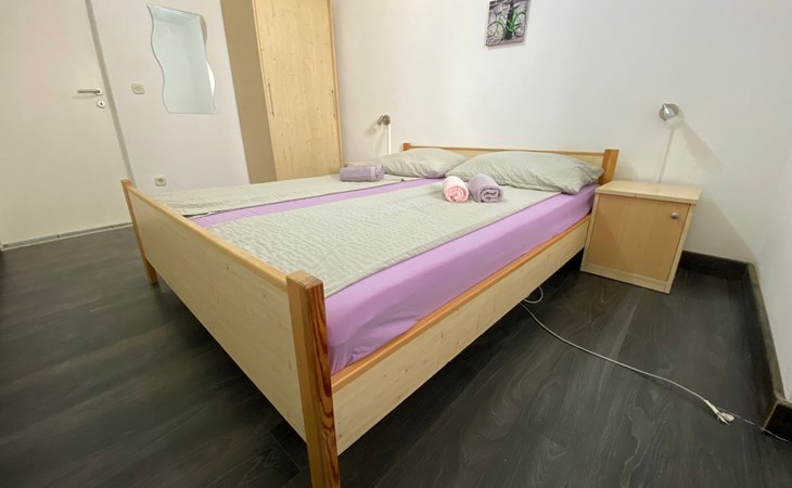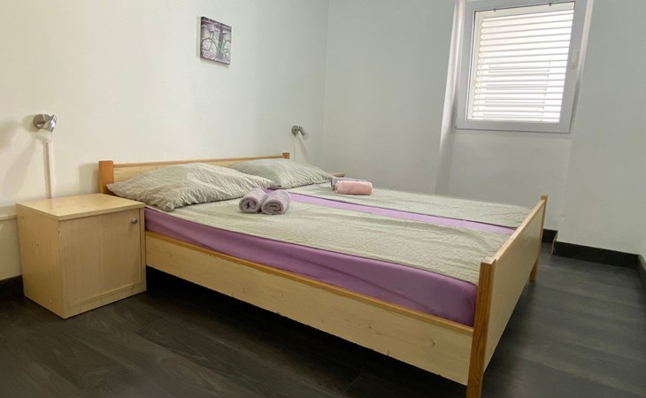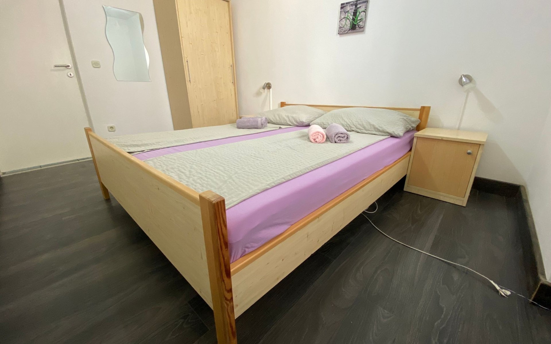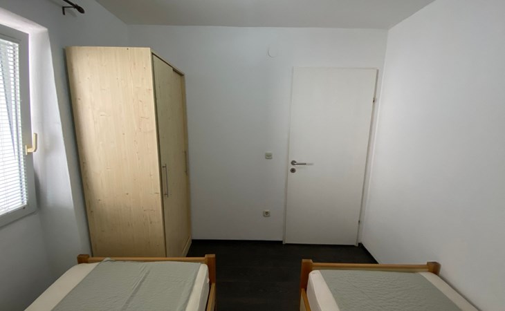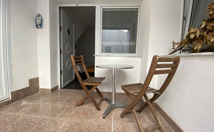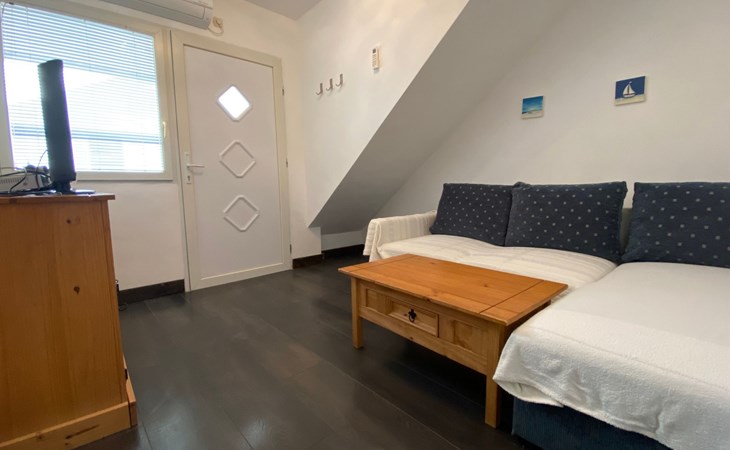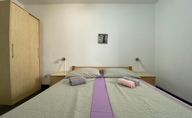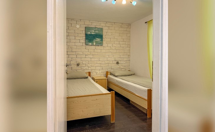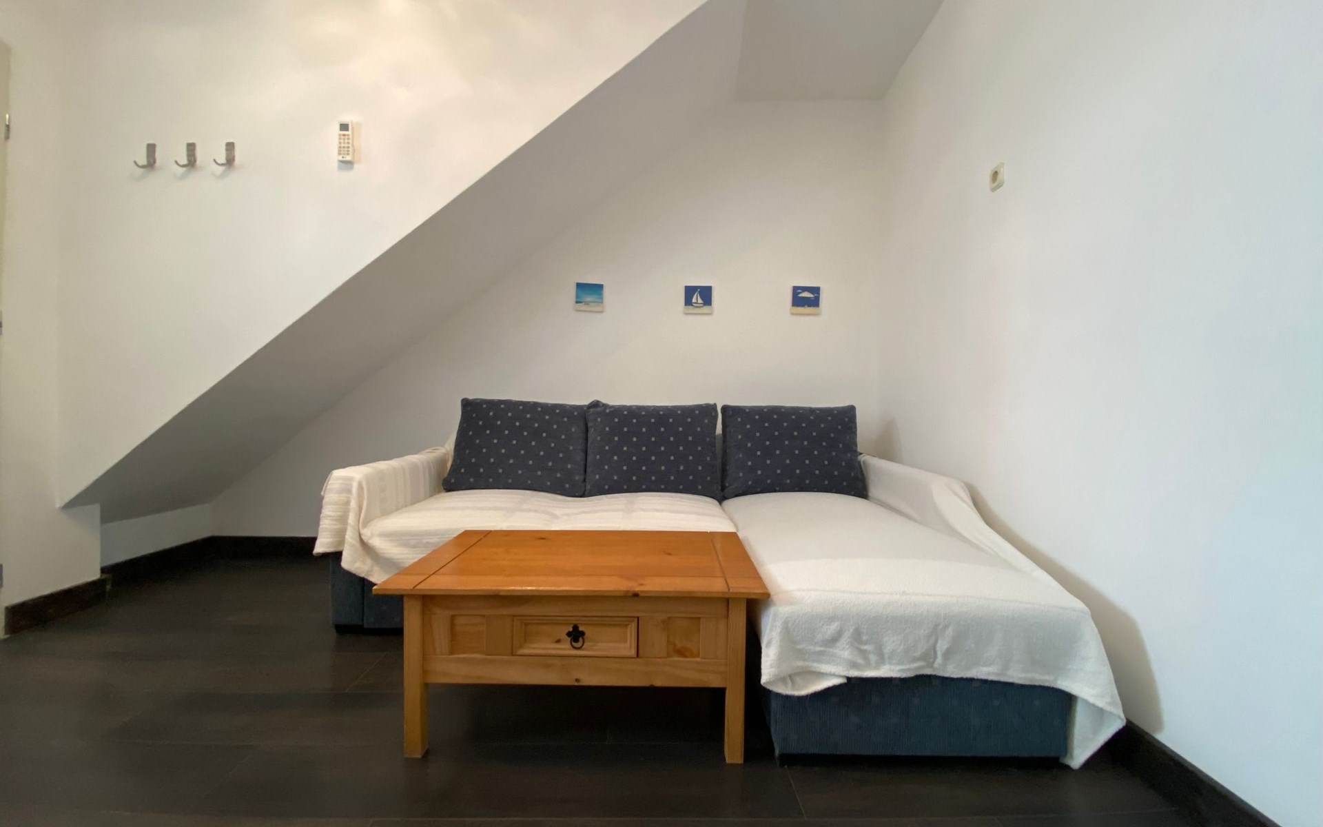 Die Wohnung verfügt über ein separat zugängliches Schlafzimmer mit einem Doppelbett und ein weiteres Schlafzimmer mit zwei Einzelbetten, ein Bad/WC sowie einen großzügigen Wohnraum mit einer Schlafcouch, die eine zusätzliche Schlafmöglichkeit von circa 150 x 200 cm bietet. Die Küche ist mit allen grundlegenden Kochutensilien sowie einem Backofen, Kühlschrank, Tiefkühlschrank und einem Herd ausgestattet, damit Sie sich während Ihres Aufenthalts ganz wie zu Hause fühlen können. Für gemütliche Abendessen im Freien steht direkt vor der Wohnung ein Tisch mit Stühlen bereit.