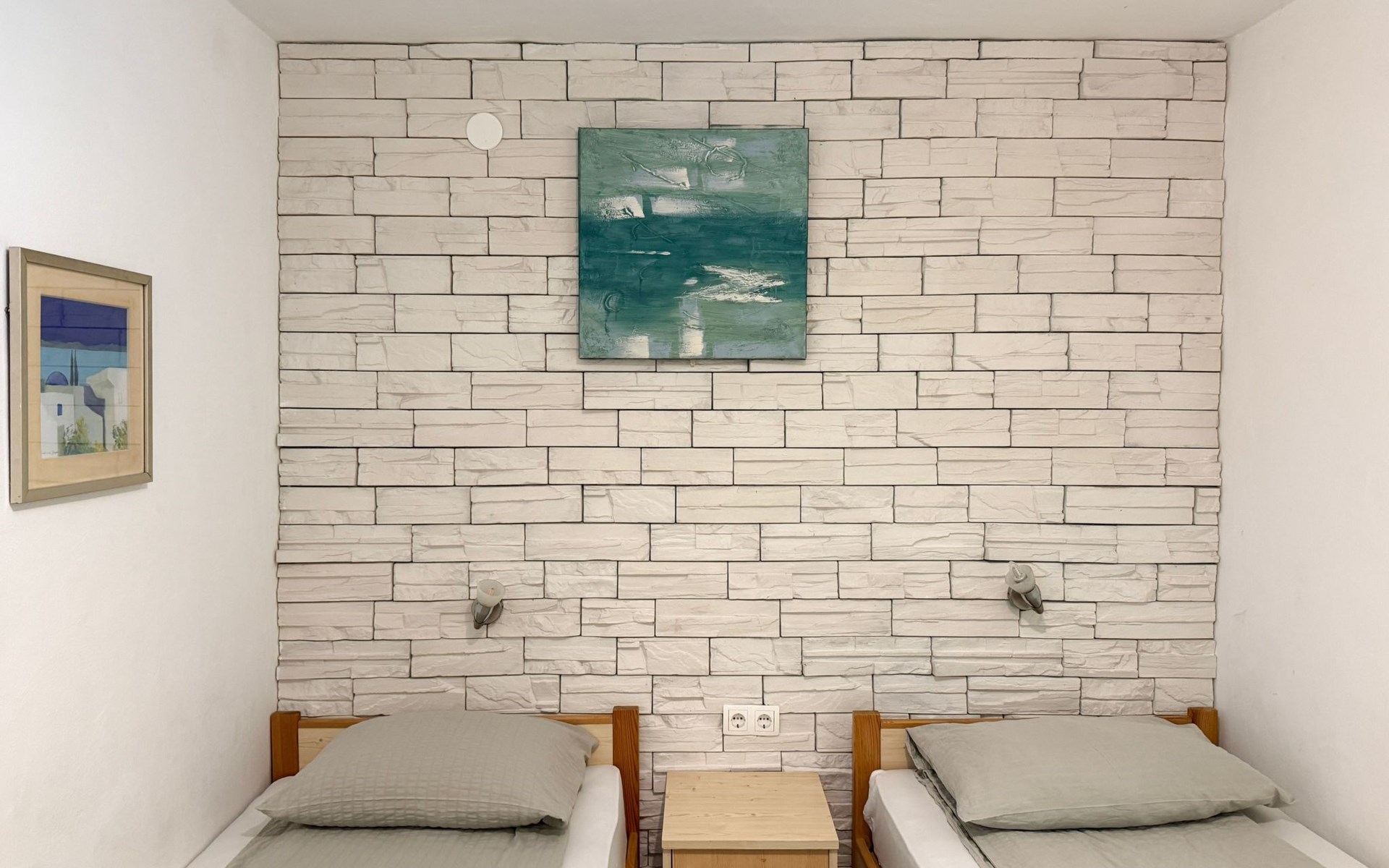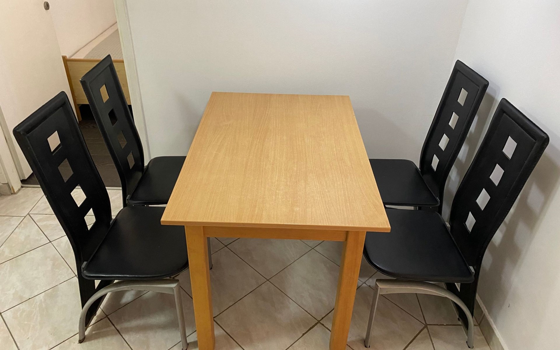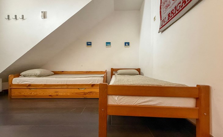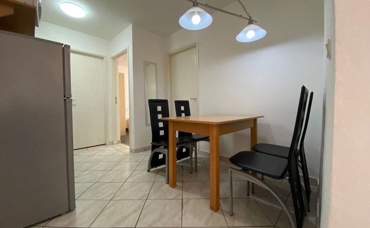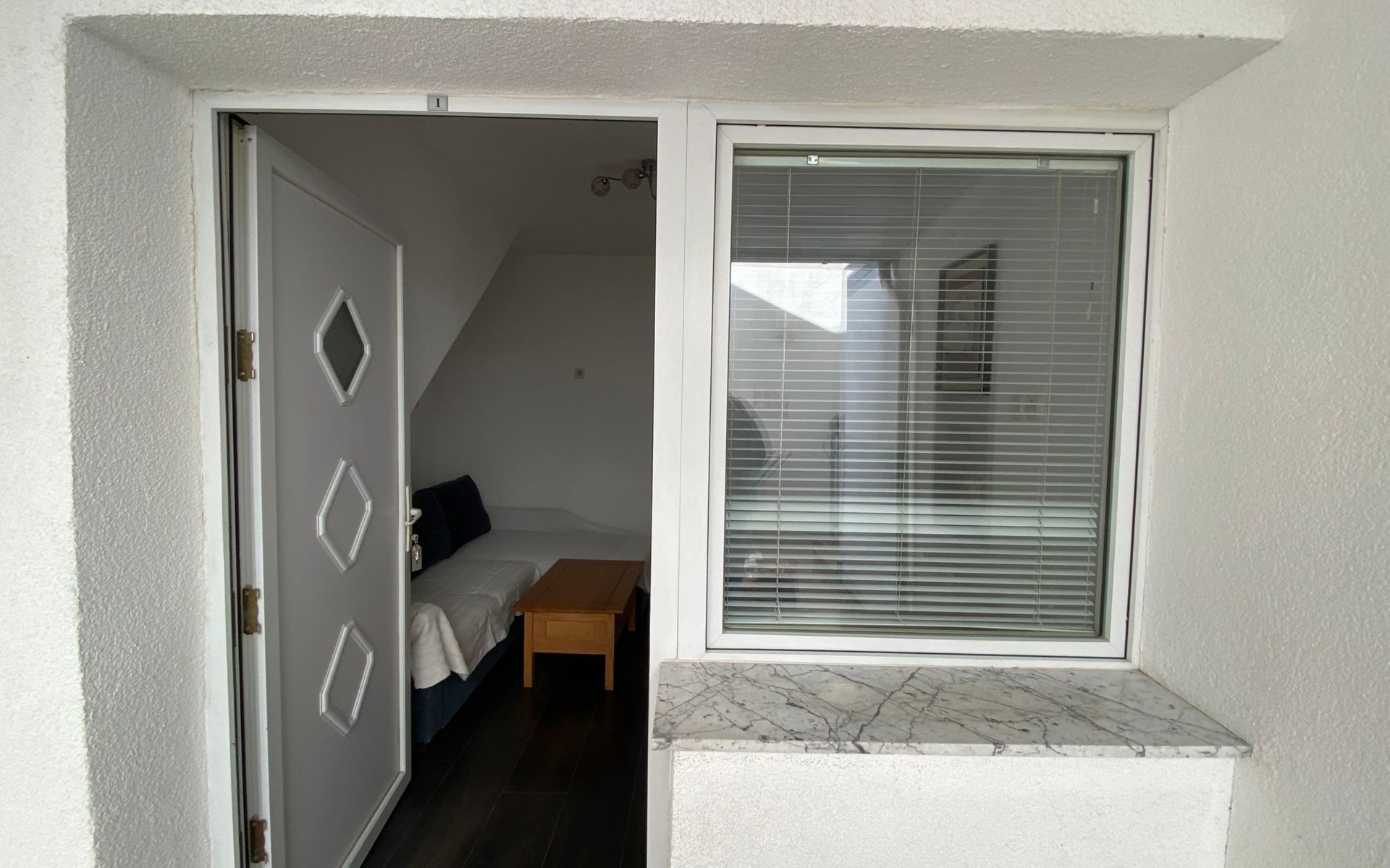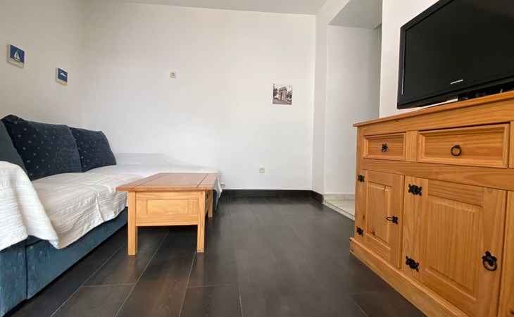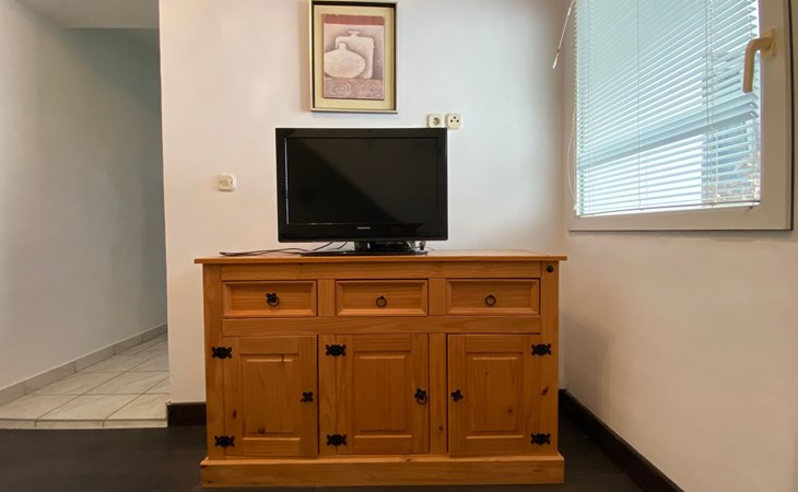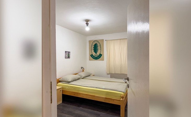 Die Wohnung verfügt über ein separat zugängliches Schlafzimmer mit einem Doppelbett und ein weiteres Schlafzimmer mit zwei Einzelbetten, ein Bad/WC sowie einen großzügigen Wohnraum mit einer Schlafcouch, die eine zusätzliche Schlafmöglichkeit von circa 150 x 200 cm bietet. Die Küche ist mit allen grundlegenden Kochutensilien sowie einem Backofen, Kühlschrank, Tiefkühlschrank und einem Herd ausgestattet, damit Sie sich während Ihres Aufenthalts ganz wie zu Hause fühlen können. Für gemütliche Abendessen im Freien steht direkt vor der Wohnung ein Tisch mit Stühlen bereit.