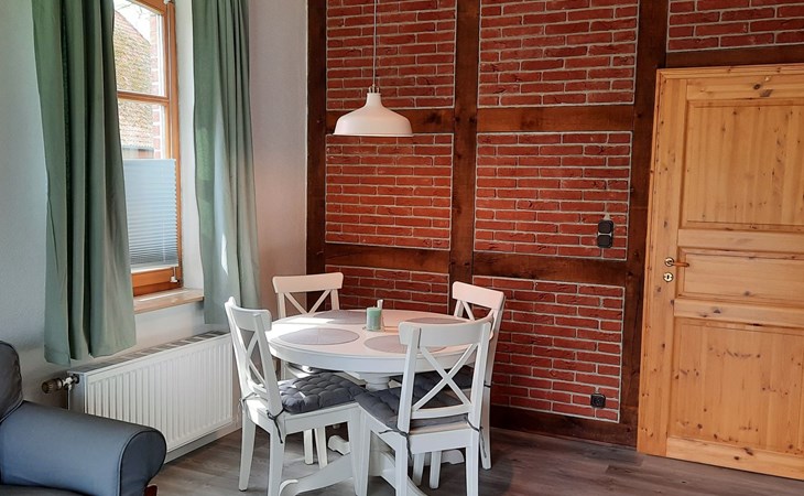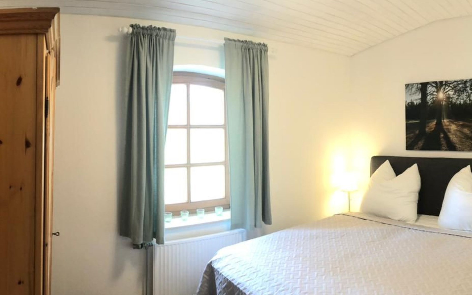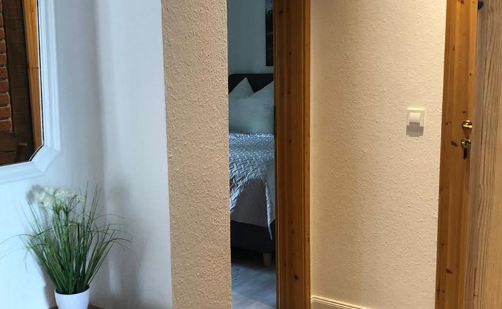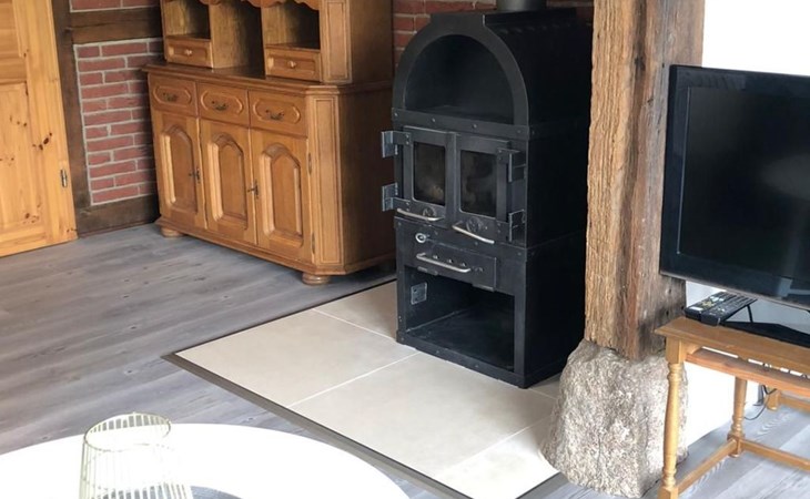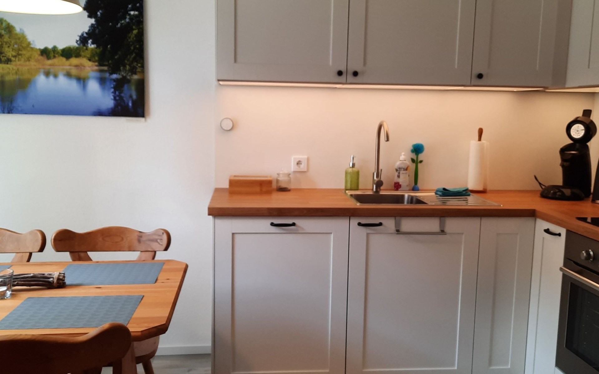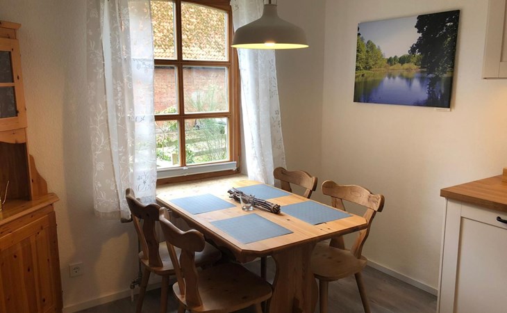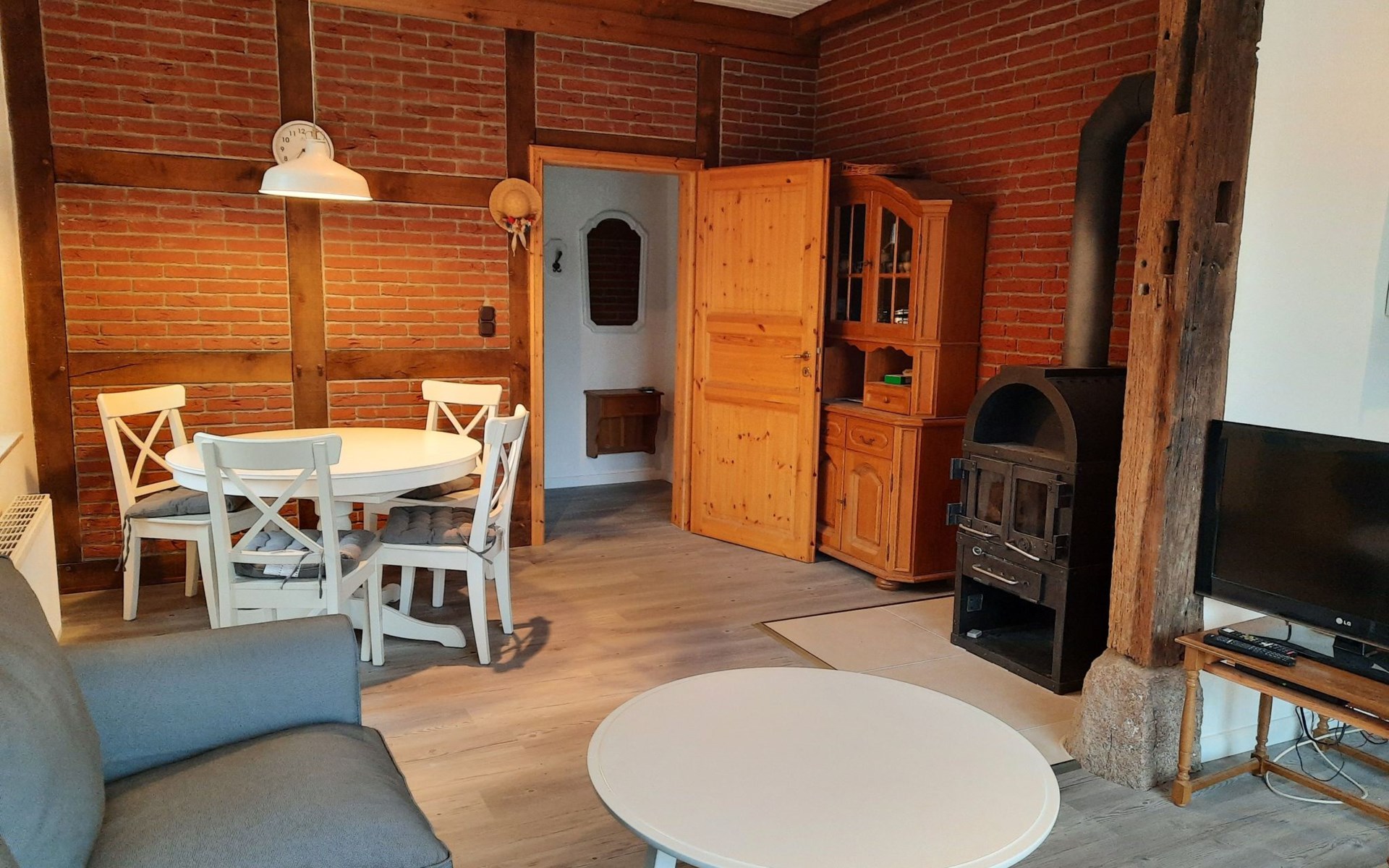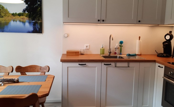 Ausstattung: Gemütlicher Wohnraum mit Kaminofen, Sat-TV und Stereoanlage und eine separate, geräumige Küche mit gemütlicher Essecke, erstklassig ausgestattet mit Geschirrspüler, Kühlschrank mit Gefrierfach, Herd mit Backofen, Toaster, Kaffeemaschine und elektrischem Handrührgerät. Weiterhin gibt es einen separaten Schlafraum mit Doppelbett und ein Kinderbett auf Anfrage. Das Duschbad mit WC, eigener Sauna und Sitzplätzen bis vier Personen bietet Wellnessfeeling. Es gibt eine Gaszentralheizung in allen Räumen, im Duschbad Fußbodenheizung. Ein Regal mit interessanter Literatur und Gesellschaftsspielen ist vorhanden. WLAN steht auch zur Verfügung.