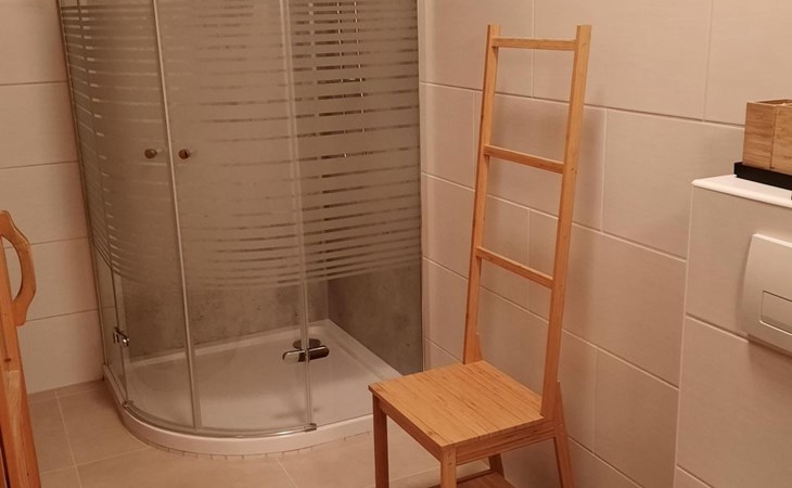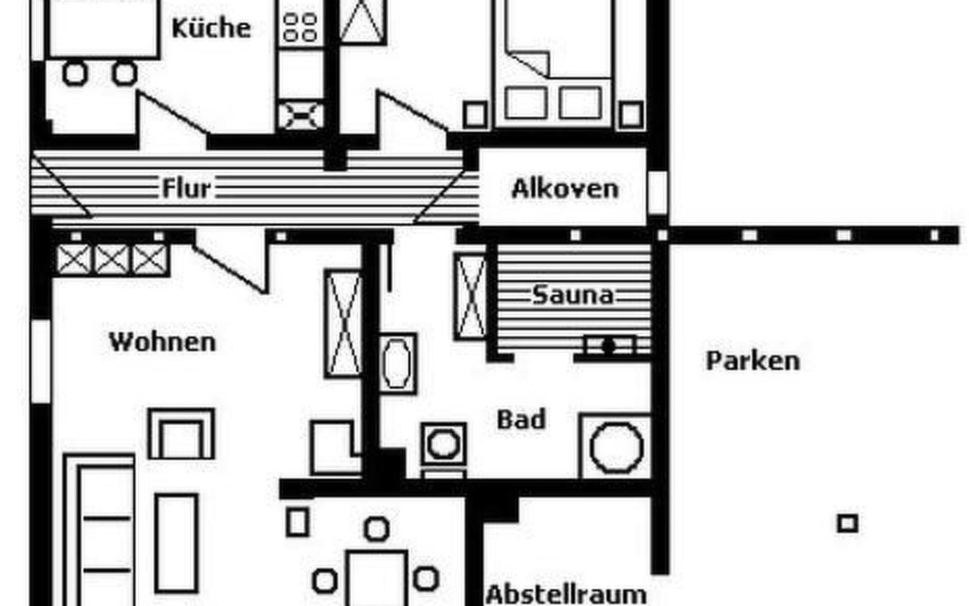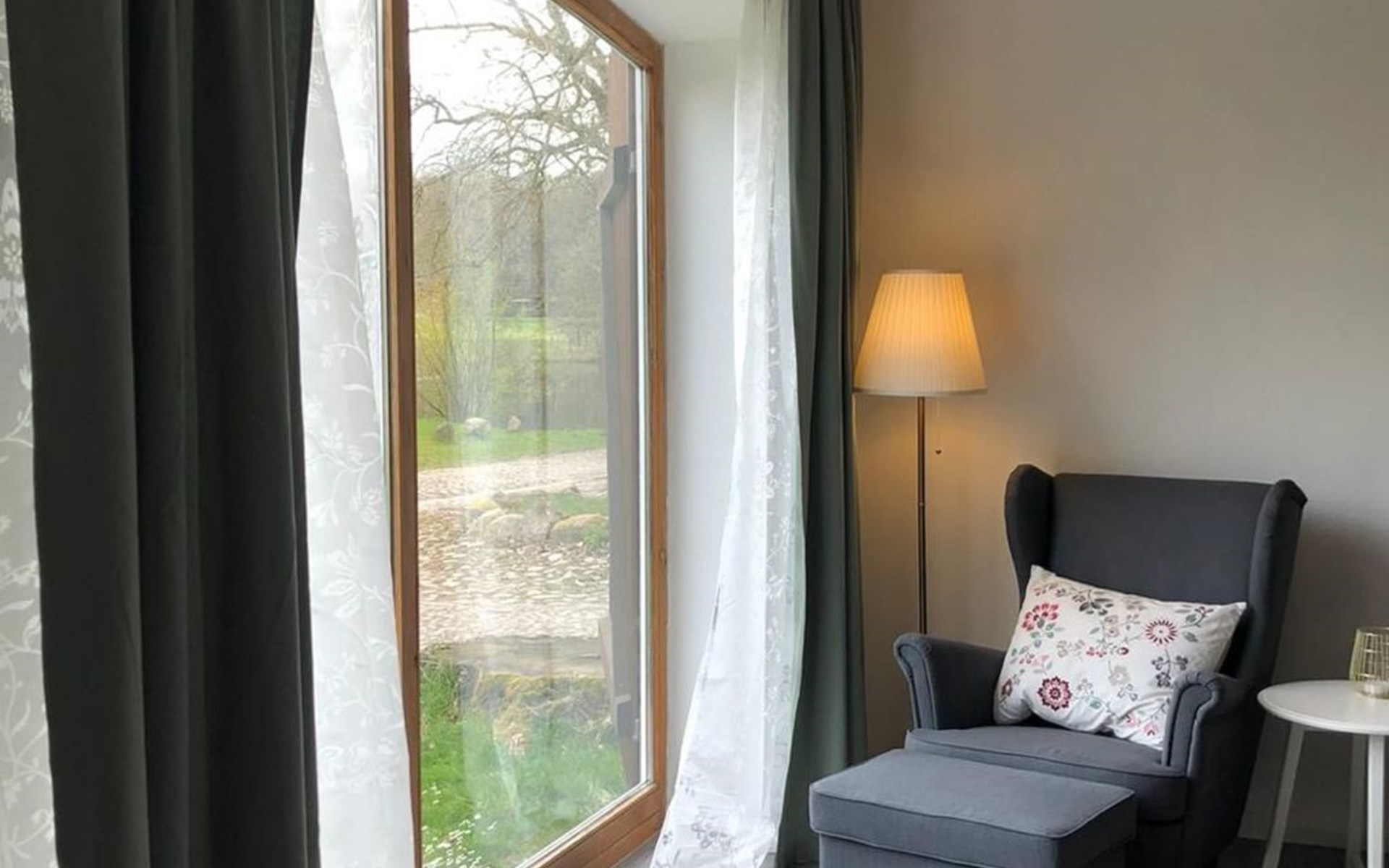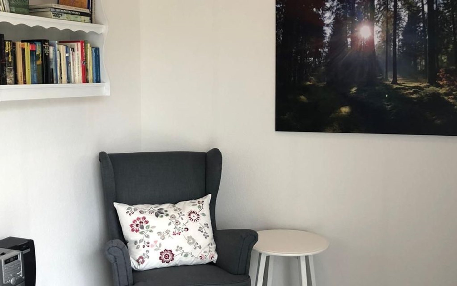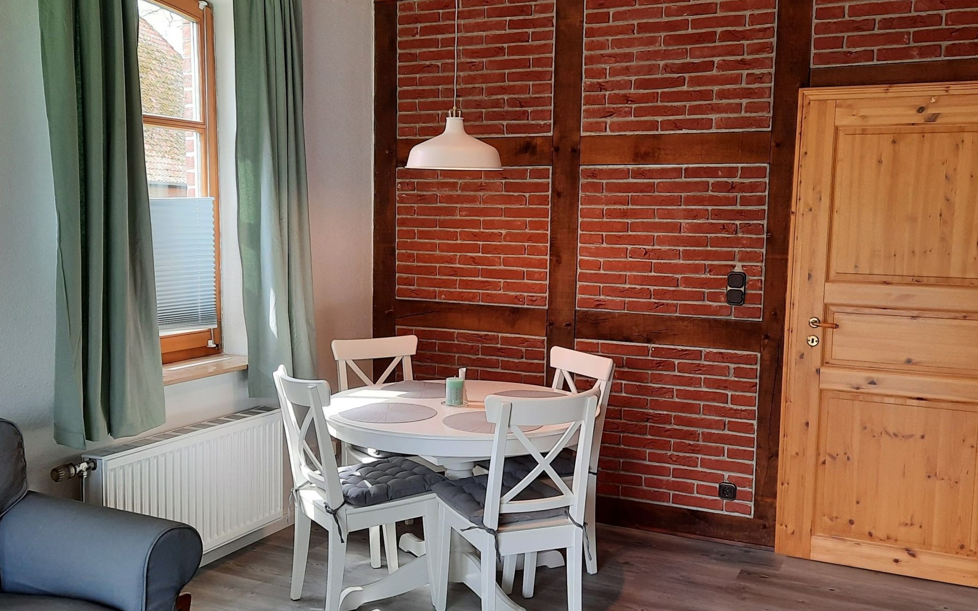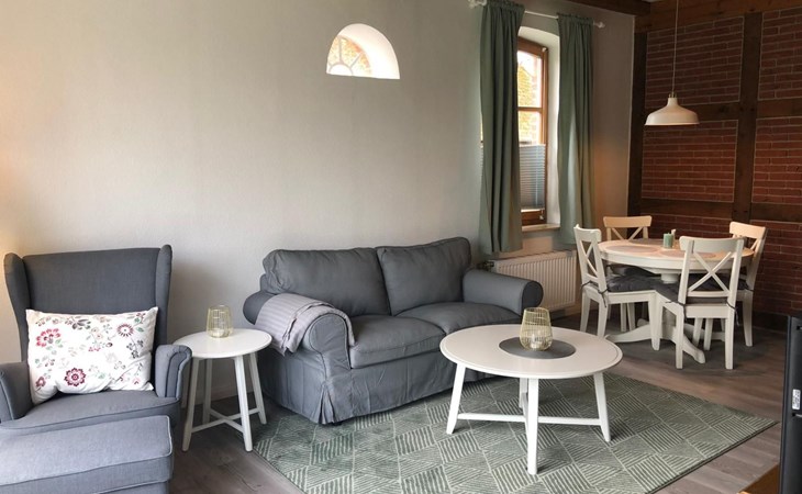 Ausstattung: Gemütlicher Wohnraum mit Kaminofen, Sat-TV und Stereoanlage und eine separate, geräumige Küche mit gemütlicher Essecke, erstklassig ausgestattet mit Geschirrspüler, Kühlschrank mit Gefrierfach, Herd mit Backofen, Toaster, Kaffeemaschine und elektrischem Handrührgerät. Weiterhin gibt es einen separaten Schlafraum mit Doppelbett und ein Kinderbett auf Anfrage. Das Duschbad mit WC, eigener Sauna und Sitzplätzen bis vier Personen bietet Wellnessfeeling. Es gibt eine Gaszentralheizung in allen Räumen, im Duschbad Fußbodenheizung. Ein Regal mit interessanter Literatur und Gesellschaftsspielen ist vorhanden. WLAN steht auch zur Verfügung.