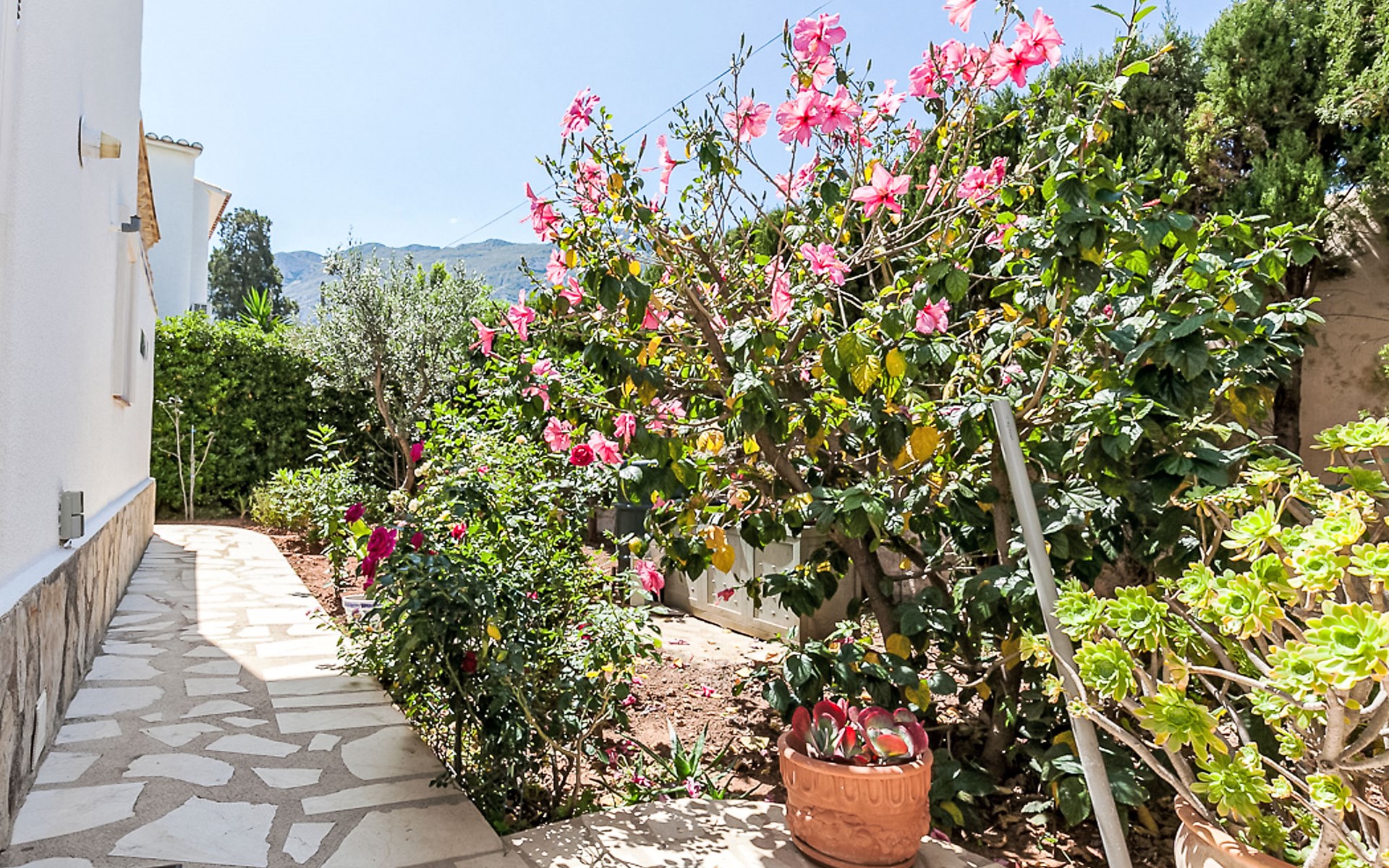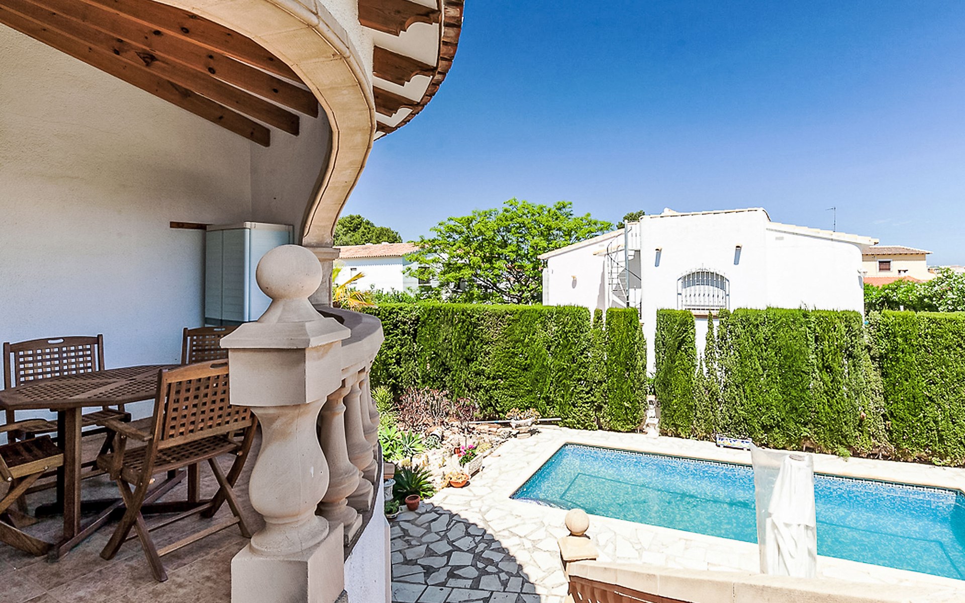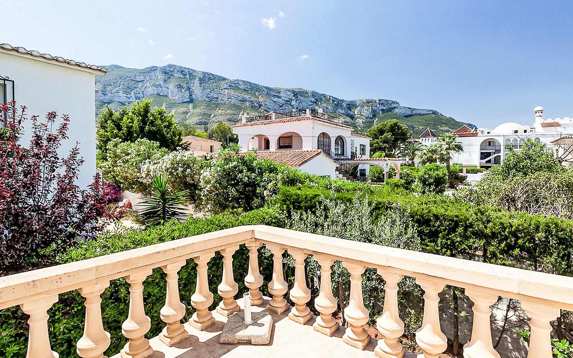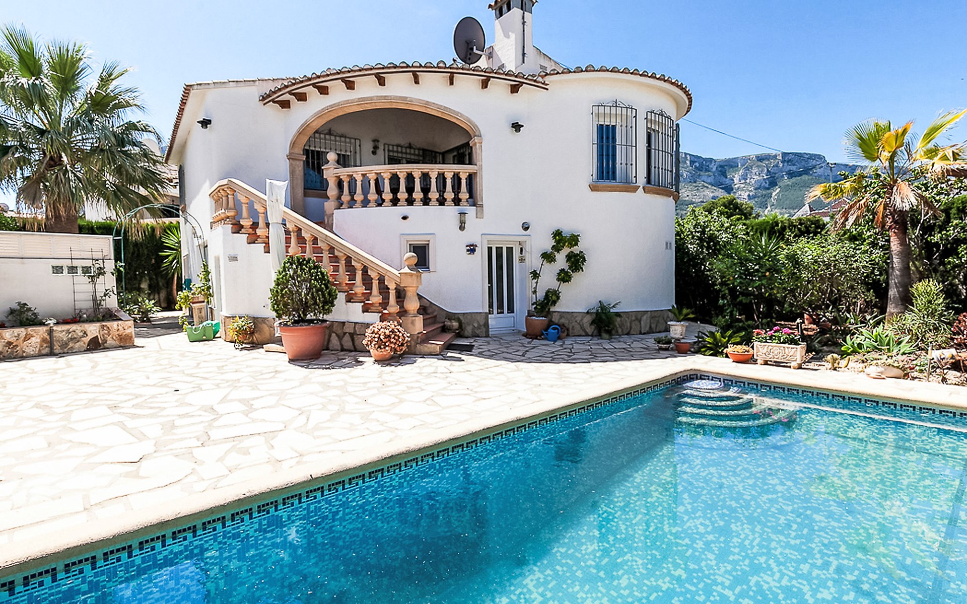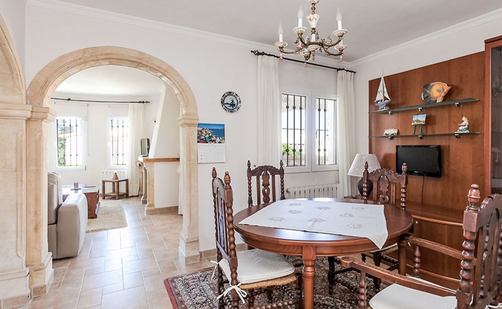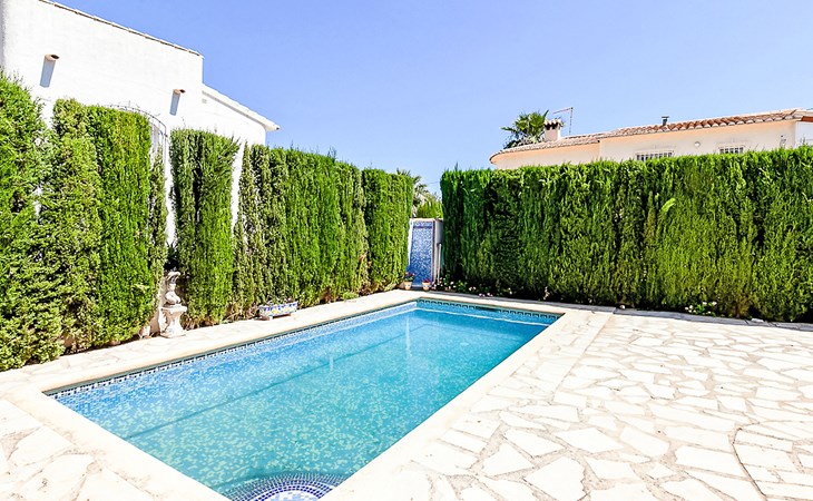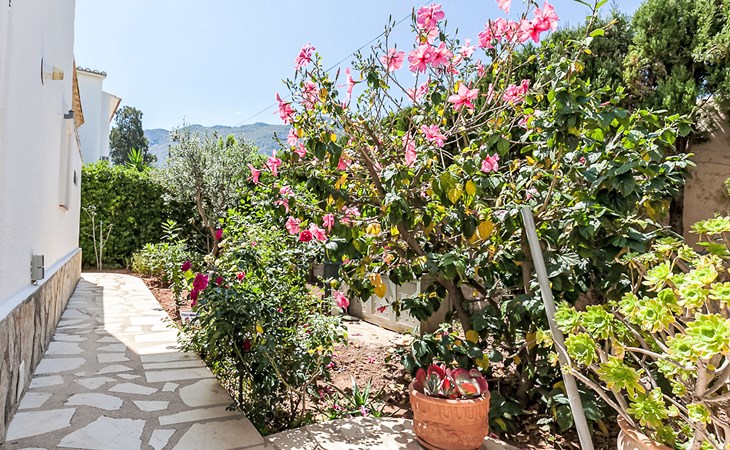 Gemütliche, sehr komfortable Villa "Tulipanes". Im Ort, 500 m vom Zentrum von de Dënia, ruhige, sonnige Lage im Villenviertel. Zur Alleinbenutzung: schöner, gepflegter Garten (eingezäunt) mit Blumen und Bäumen, Schwimmbad eckig (4 x 8 m, 180 cm tief, saisonale Verfügbarkeit: 01.Jan. - 31.Dez.). Aussendusche, Laube, Gartenmöbel, Poolpflege durch den Besitzer/Gärtner. Treppenweg (13 Stufen) bis zum Haus. Parkplatz auf dem Grundstück, Einzelgarage. Supermarkt, Einkaufszentrum, Restaurant, Bar 300 m, Bushaltestelle 1.8 km, Bahnstation 1.8 km, Fähre 3.6 km. Sporthafen 800 m, Surfschule, Segelschule. Der Besitzer akzeptiert keine Jugendgruppen.