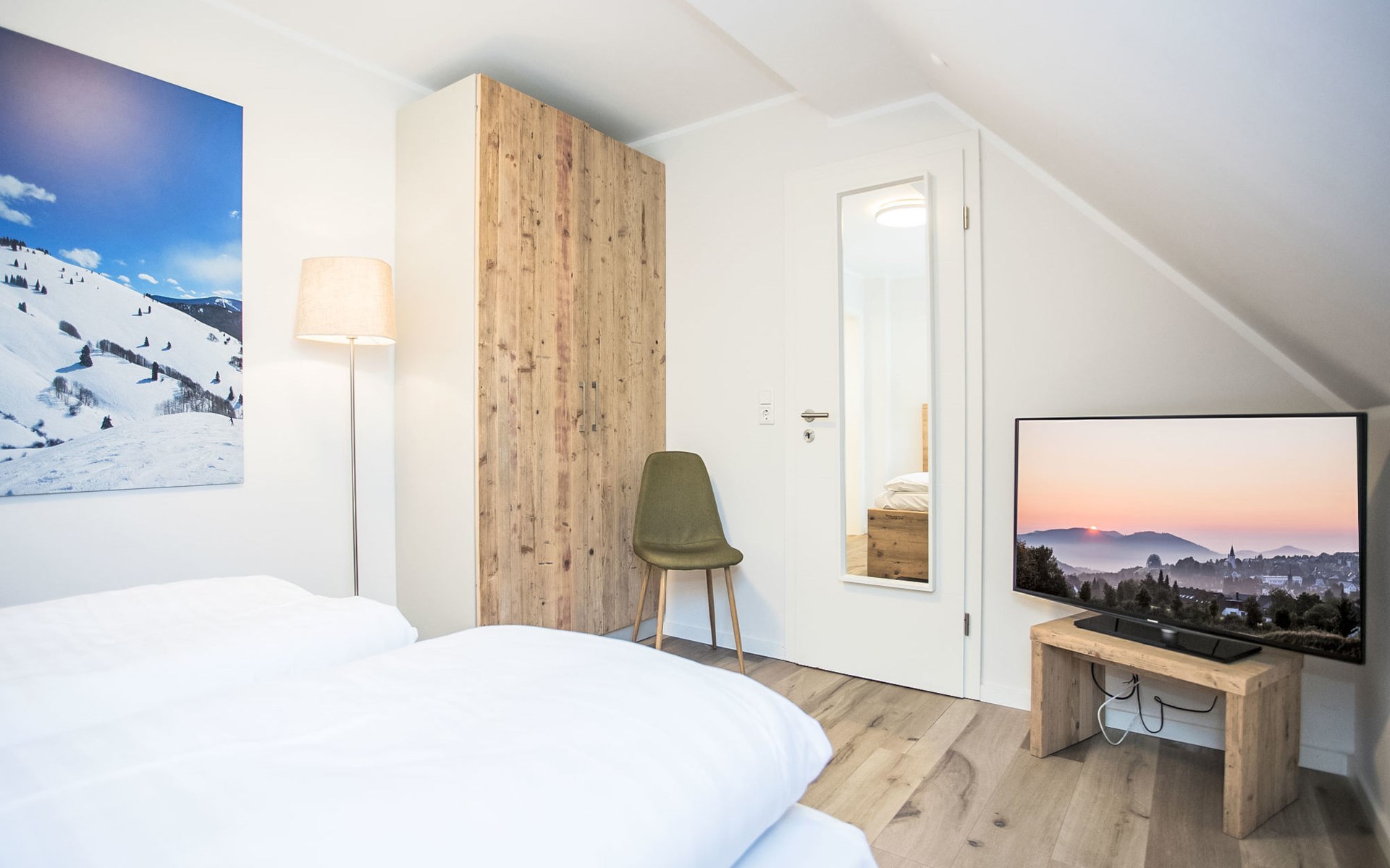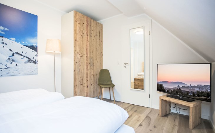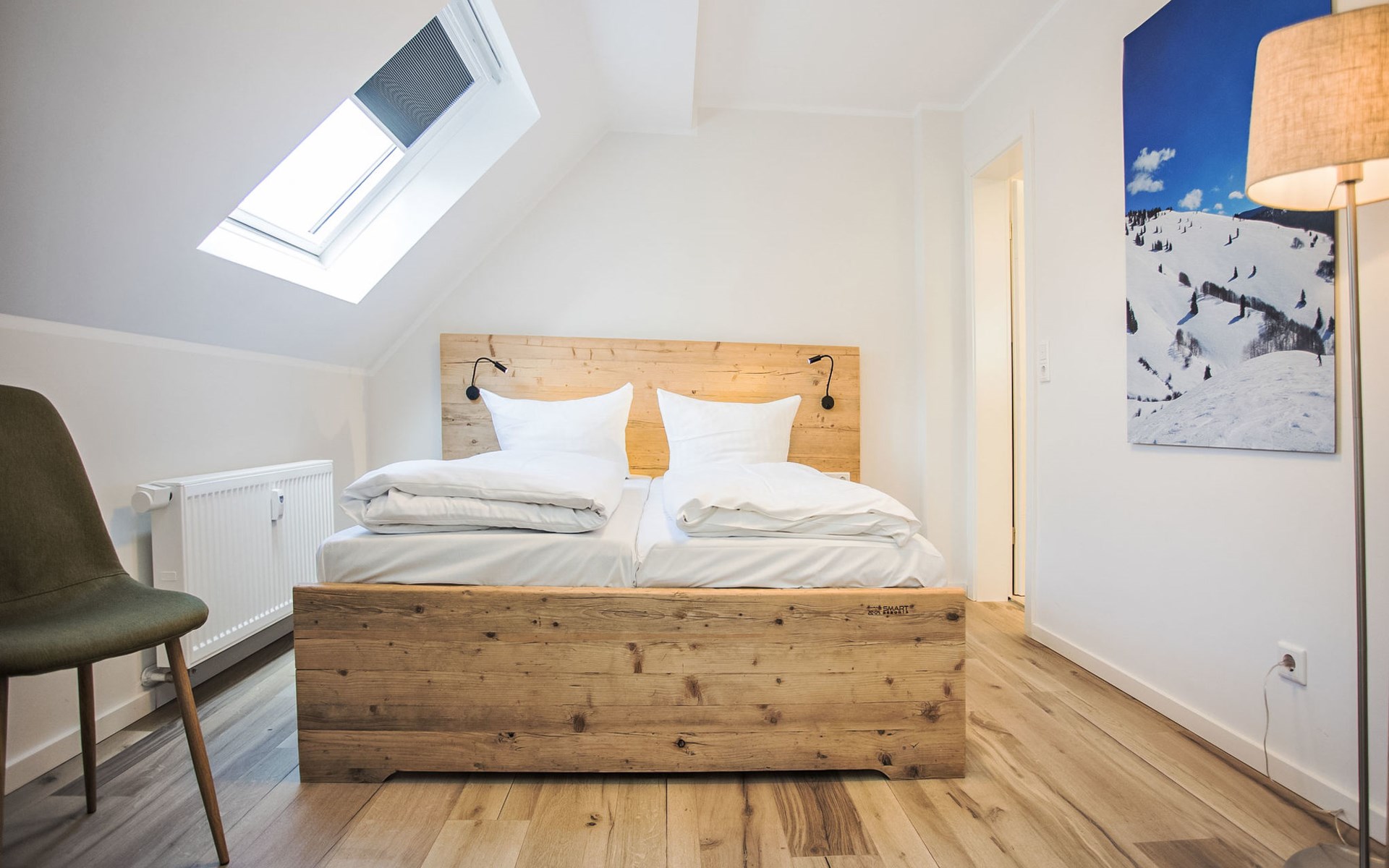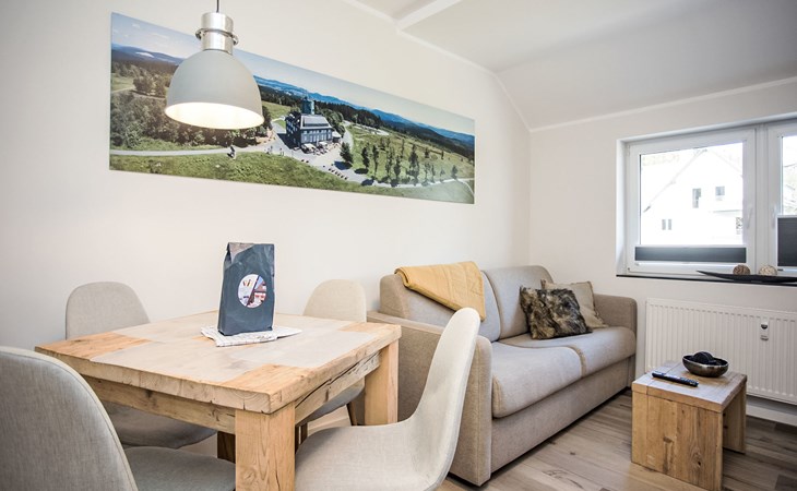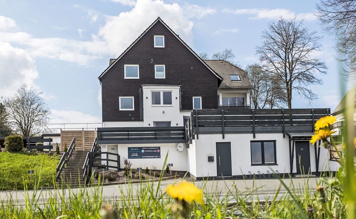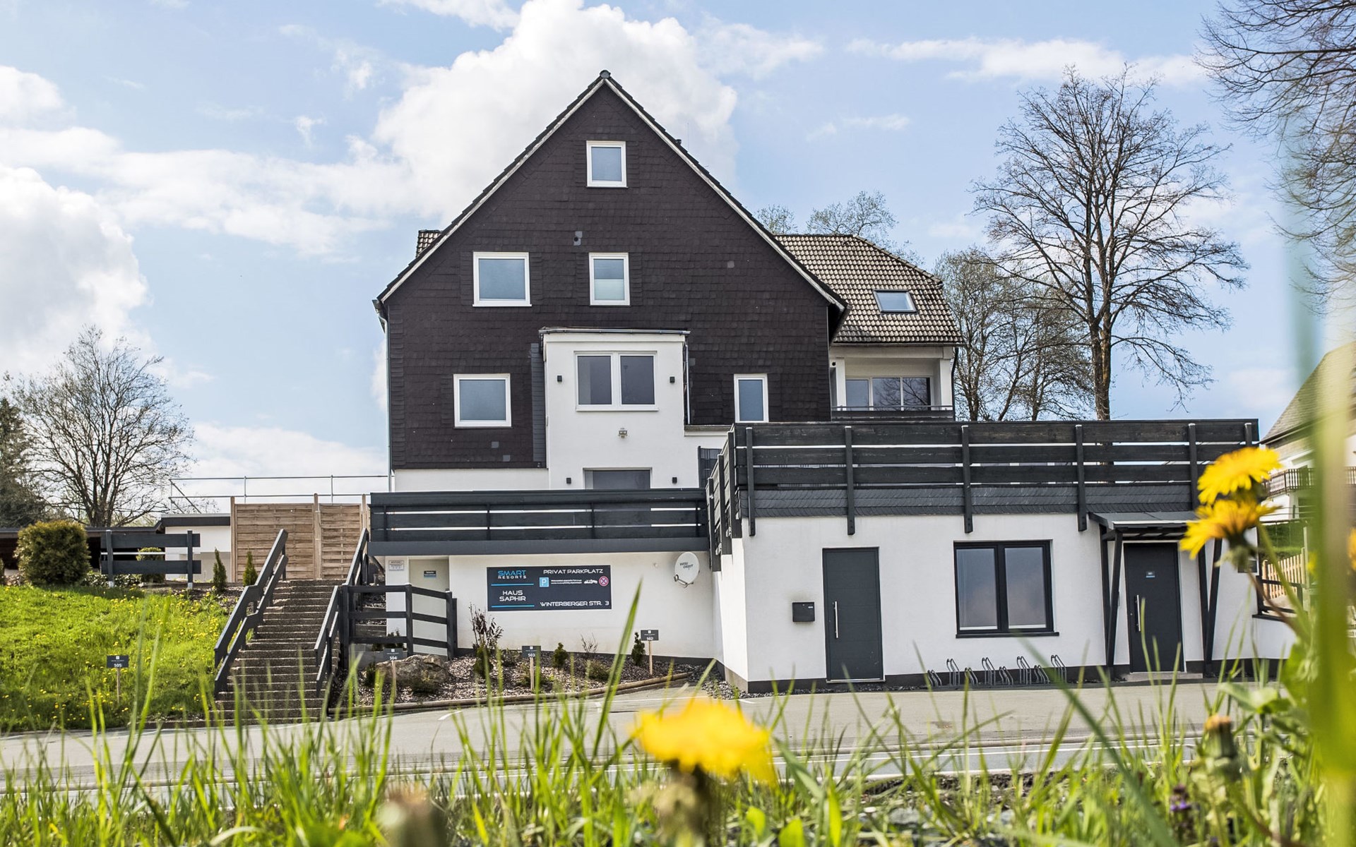 Neuastenberg 6 km von Winterberg: Gemütliches Appartementhaus auf 3 Stockwerken. Am Ortsrand, sonnige Lage. Im Hause: Einstellraum für Fahrräder, Skiraum, Waschmaschine (zur Mitbenutzung). Parkplatz beim Haus. Supermarkt 6 km, Restaurant, Bäckerei 550 m, Bushaltestelle 400 m, Bahnstation "Winterberg" 6.3 km. Skipisten 1.4 km. Bekannte Skigebiete sind gut erreichbar: Skiarena Winterberg 6 km.