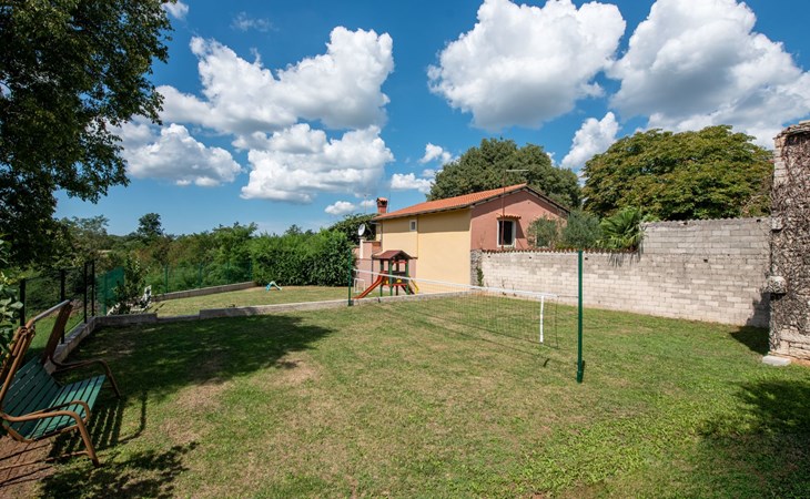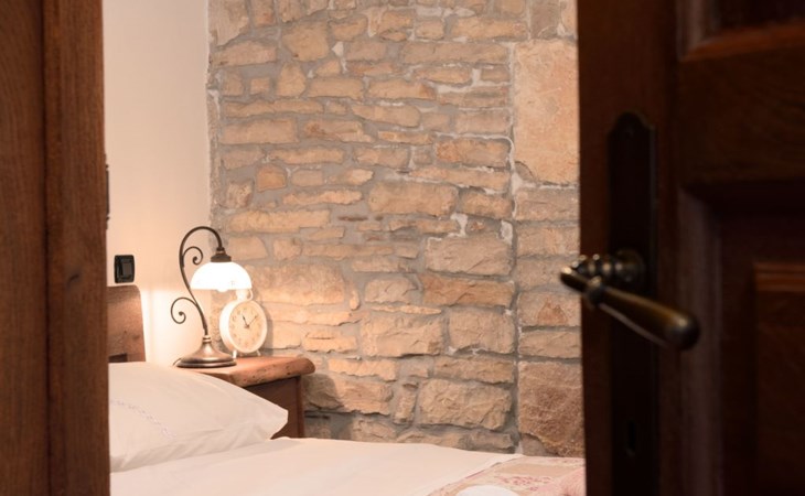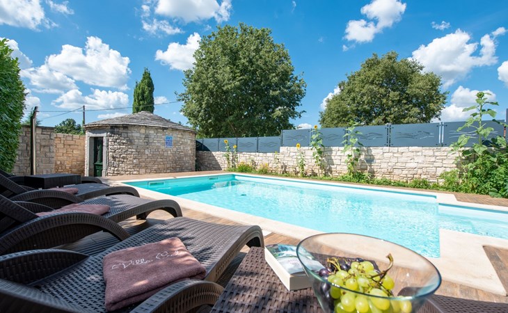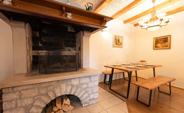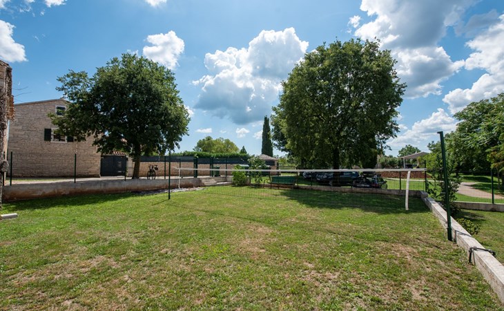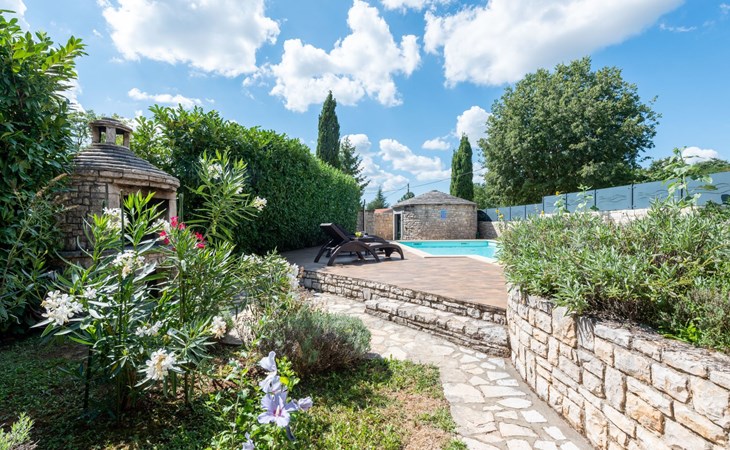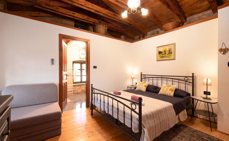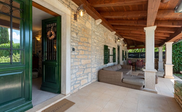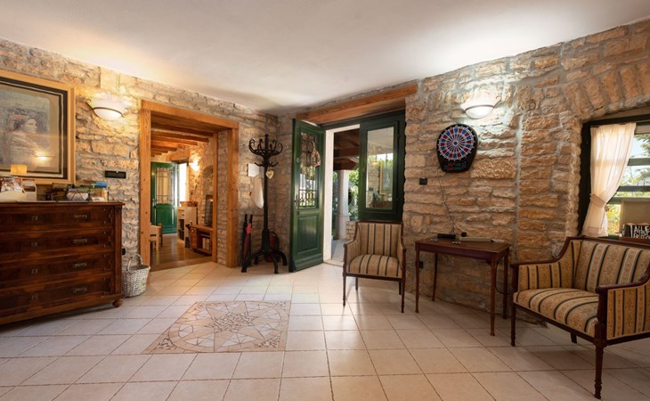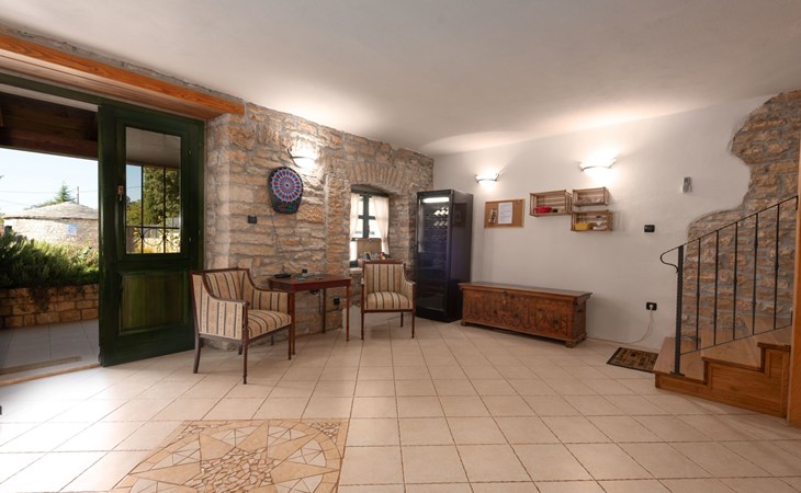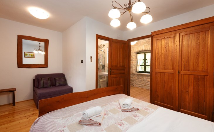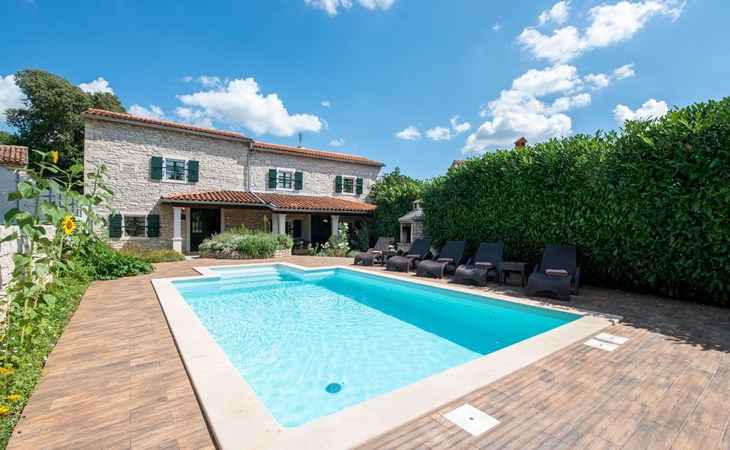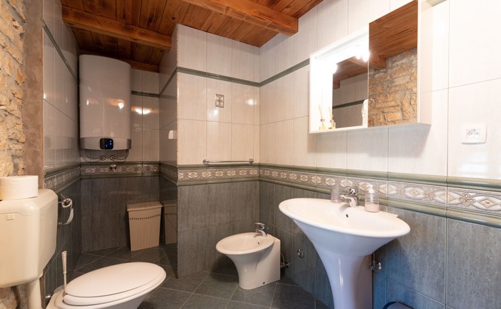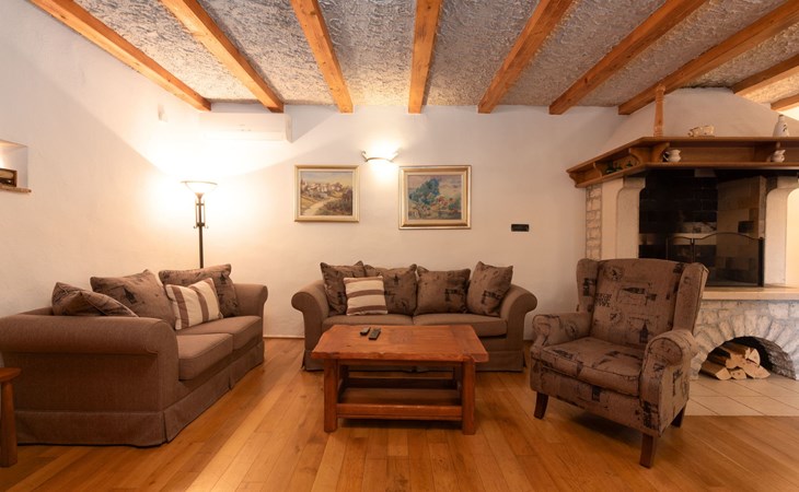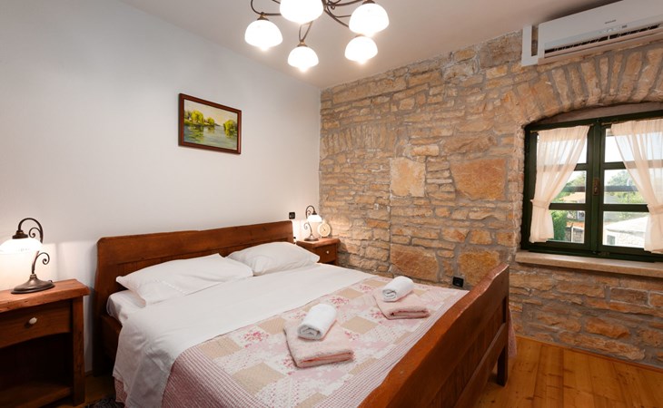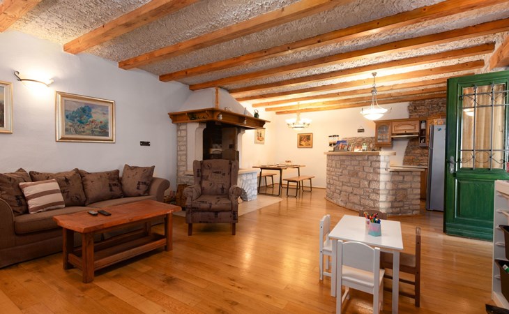 Das 170 m² große traditionelle Steinhaus wurde im Jahre 1905 erbaut und erst kürzlich im Jahre 2007 vollständig renoviert und mit allen modernen Annehmlichkeiten ausgestattet. Während der Renovierungsarbeiten wurde viel Wert darauf gelegt, den ursprünglichen gemütlichen Charakter des typisch istrisches Landhauses beizubehalten. Die vollständig klimatisierte (Kühlung und Heizung) Villa verteilt sich über zwei Etagen und bietet einen großen Wohn- und Essbereich mit integrierter offener Küche, drei Schlafzimmer mit drei en Suite Badezimmern und eine Gästetoilette. Die soliden Holzbalken an den Decken, Eichenparkett Fußböden und die handgefertigten Möbel im Wohnbereich unterstreichen die rustikale Landhausatmosphäre. Hier finden Sie zwei gemütliche Sofas, einen Sessel, Beistelltisch, Fernseher mit Satellitenempfang und USB Anschluss, DVD und CD Spieler, ein Radio und einen Safe, in dem Sie Ihre Wertsachen aufbewahren können. Der große offene Kamin aus istrischem Stein sorgt für angenehme Wärme an kühleren Abenden. Auf der anderen Seite des Raumes befindet sich ein Esstisch aus schwerem Holz mit passender Holzbank und Stühlen. Eine großzügige Frühstücksbar trennt den Essbereich von der Küche, die mit einer Spülmaschine, einem Herd, Ofen, Kühlschrank mit Gefrierfach, Kaffeemaschine und einem Toaster ausgestattet ist. Zudem befindet sich im Erdgeschoss noch die Gästetoilette. Eine breite Holztreppe führt in die obere Etage mit den drei en Suite Schlafzimmern. Die ersten beiden Schlafzimmer sind jeweils mit einem 160 cm x 200 cm großen Doppelbett und einem Sofabett ausgestattet, das sich in ein 90 cm x 190 cm großes Einzelbett umfunktionieren läßt und somit einen Schlafplatz für ein Kind bietet. Im dritten Schlafzimmer finden Sie zwei 90 cm x 190 cm große Einzelbetten, die sich auch zu einem Doppelbett zusammenschieben lassen. Alle drei Schlafzimmer verfügen über große Schränke mit ausreichend Platz für Ihre Kleidung und Gepäck und neben allen Betten befinden sich Nachttische mit Leselampen. Die en Suite Badezimmer bieten eine große Duschkabine, ein Waschbecken mit Wandspiegel, einen Föhn und eine Toilette. Auch stehen Ihnen eine Waschmaschine und ein Babybett zur Verfügung. Zuverlässiger WiFi Internetzugang wird in der Villa kostenlos geboten.