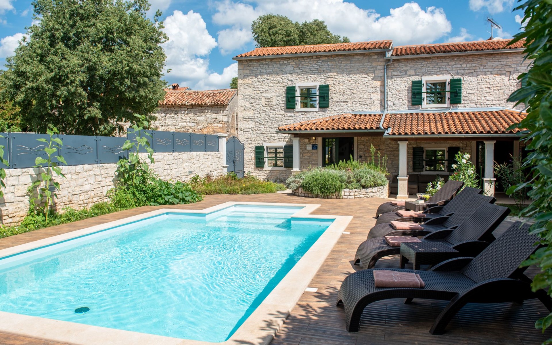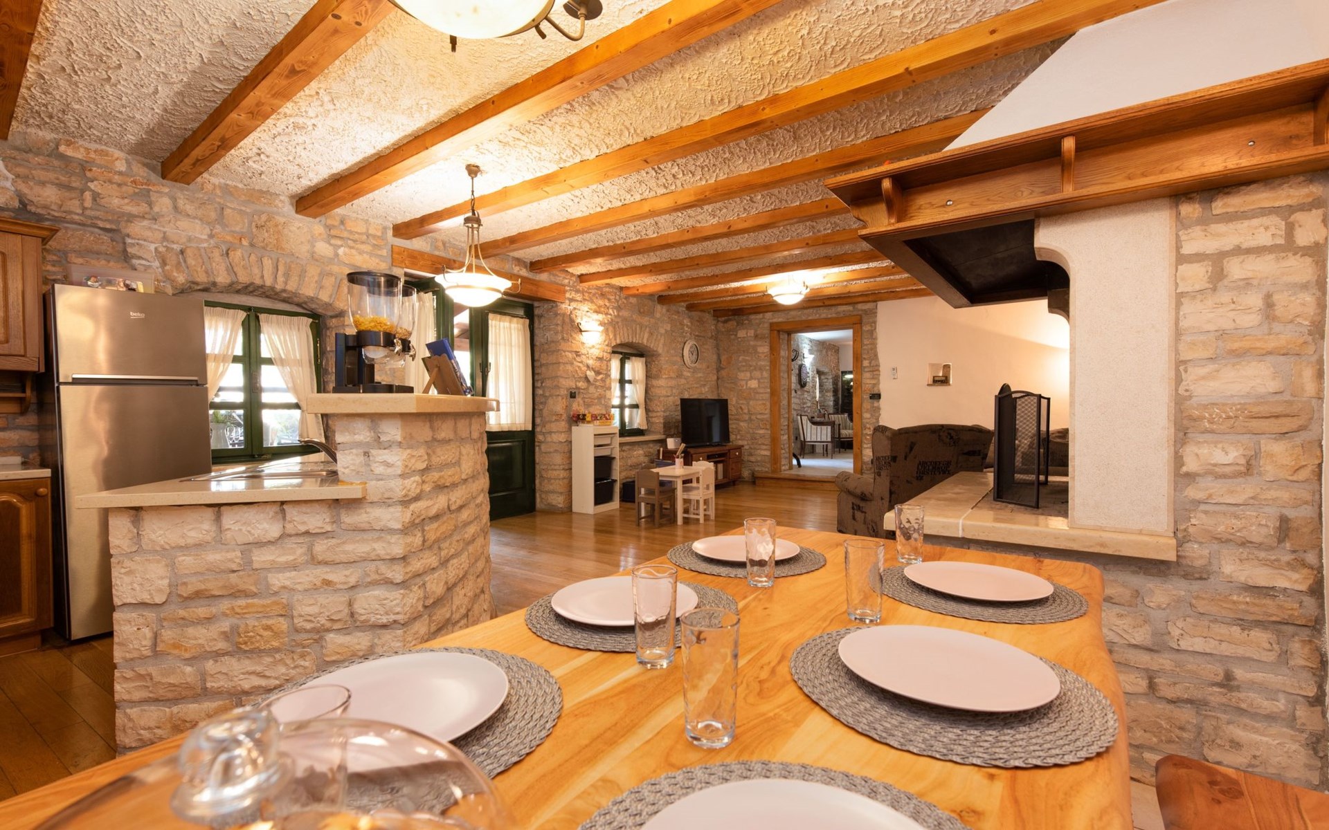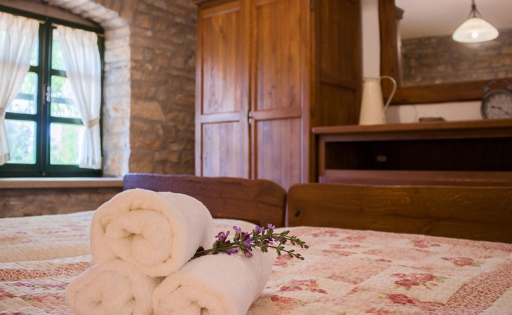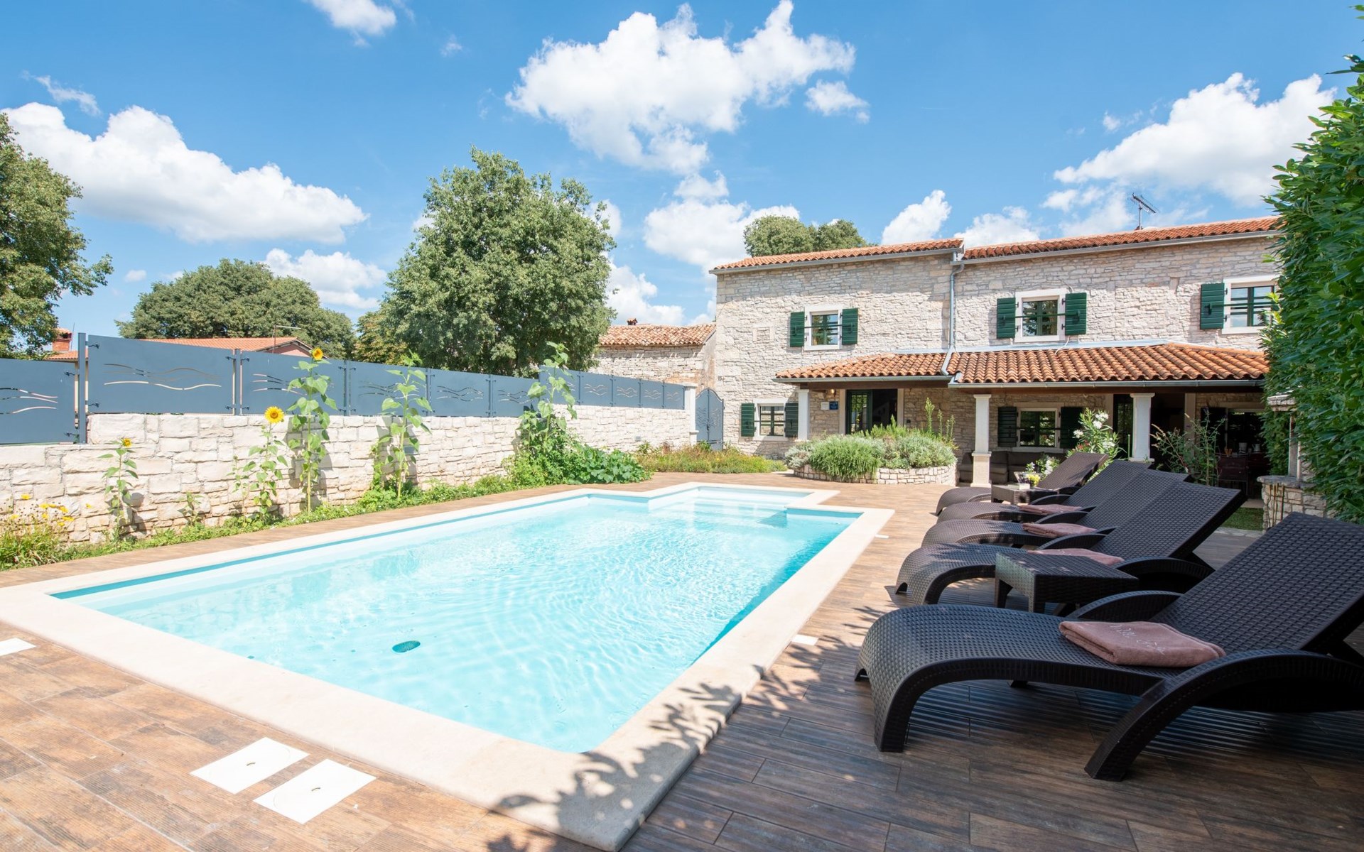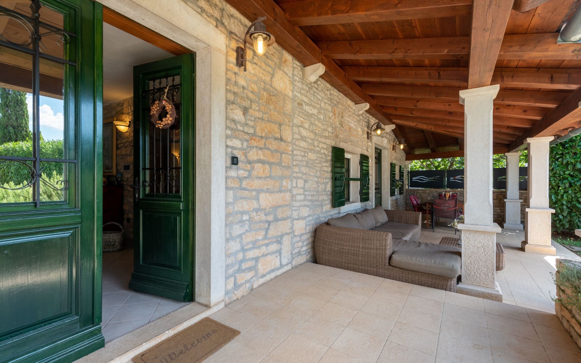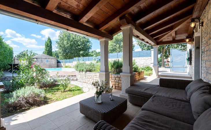 Das 170 m² große traditionelle Steinhaus wurde im Jahre 1905 erbaut und erst kürzlich im Jahre 2007 vollständig renoviert und mit allen modernen Annehmlichkeiten ausgestattet. Während der Renovierungsarbeiten wurde viel Wert darauf gelegt, den ursprünglichen gemütlichen Charakter des typisch istrisches Landhauses beizubehalten. Die vollständig klimatisierte (Kühlung und Heizung) Villa verteilt sich über zwei Etagen und bietet einen großen Wohn- und Essbereich mit integrierter offener Küche, drei Schlafzimmer mit drei en Suite Badezimmern und eine Gästetoilette. Die soliden Holzbalken an den Decken, Eichenparkett Fußböden und die handgefertigten Möbel im Wohnbereich unterstreichen die rustikale Landhausatmosphäre. Hier finden Sie zwei gemütliche Sofas, einen Sessel, Beistelltisch, Fernseher mit Satellitenempfang und USB Anschluss, DVD und CD Spieler, ein Radio und einen Safe, in dem Sie Ihre Wertsachen aufbewahren können. Der große offene Kamin aus istrischem Stein sorgt für angenehme Wärme an kühleren Abenden. Auf der anderen Seite des Raumes befindet sich ein Esstisch aus schwerem Holz mit passender Holzbank und Stühlen. Eine großzügige Frühstücksbar trennt den Essbereich von der Küche, die mit einer Spülmaschine, einem Herd, Ofen, Kühlschrank mit Gefrierfach, Kaffeemaschine und einem Toaster ausgestattet ist. Zudem befindet sich im Erdgeschoss noch die Gästetoilette. Eine breite Holztreppe führt in die obere Etage mit den drei en Suite Schlafzimmern. Die ersten beiden Schlafzimmer sind jeweils mit einem 160 cm x 200 cm großen Doppelbett und einem Sofabett ausgestattet, das sich in ein 90 cm x 190 cm großes Einzelbett umfunktionieren läßt und somit einen Schlafplatz für ein Kind bietet. Im dritten Schlafzimmer finden Sie zwei 90 cm x 190 cm große Einzelbetten, die sich auch zu einem Doppelbett zusammenschieben lassen. Alle drei Schlafzimmer verfügen über große Schränke mit ausreichend Platz für Ihre Kleidung und Gepäck und neben allen Betten befinden sich Nachttische mit Leselampen. Die en Suite Badezimmer bieten eine große Duschkabine, ein Waschbecken mit Wandspiegel, einen Föhn und eine Toilette. Auch stehen Ihnen eine Waschmaschine und ein Babybett zur Verfügung. Zuverlässiger WiFi Internetzugang wird in der Villa kostenlos geboten.