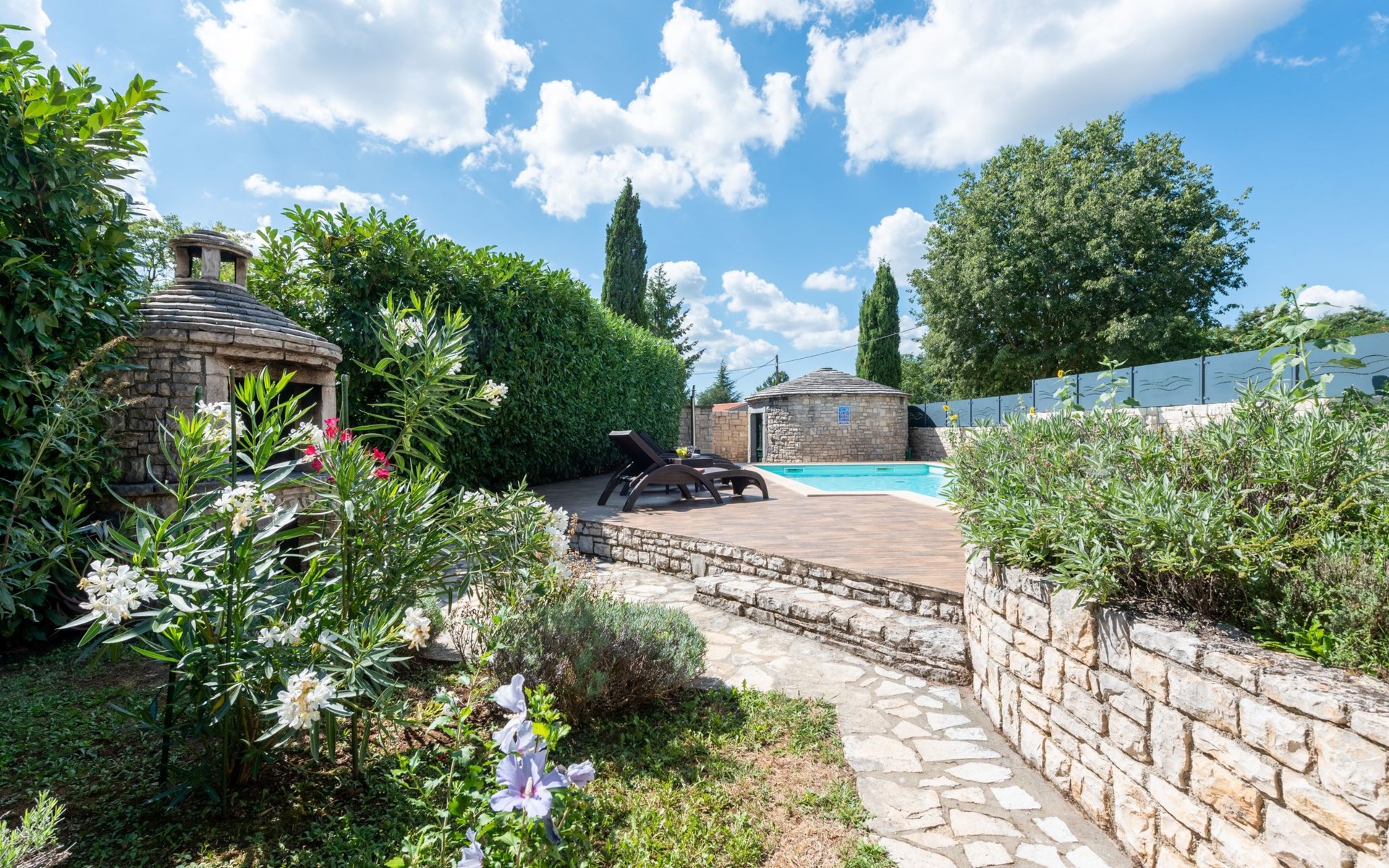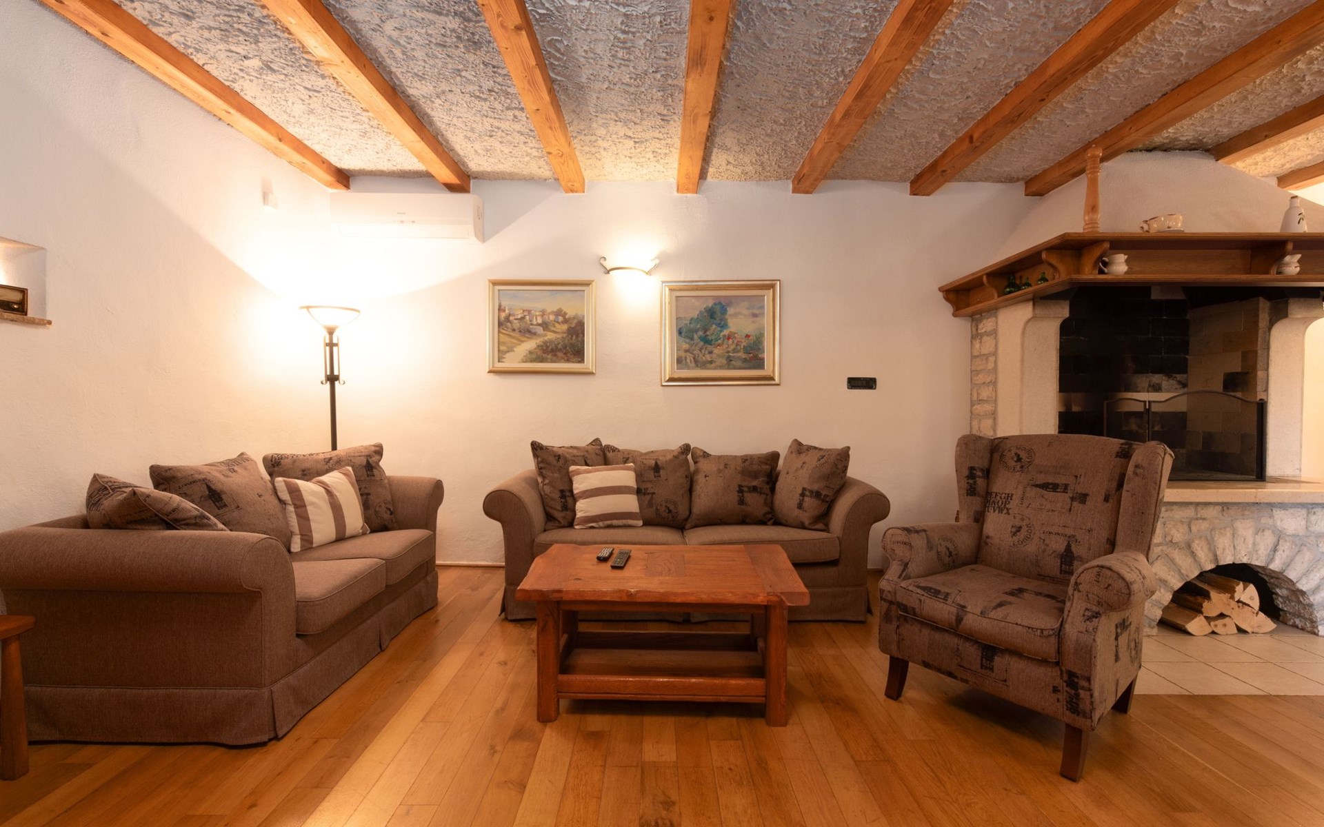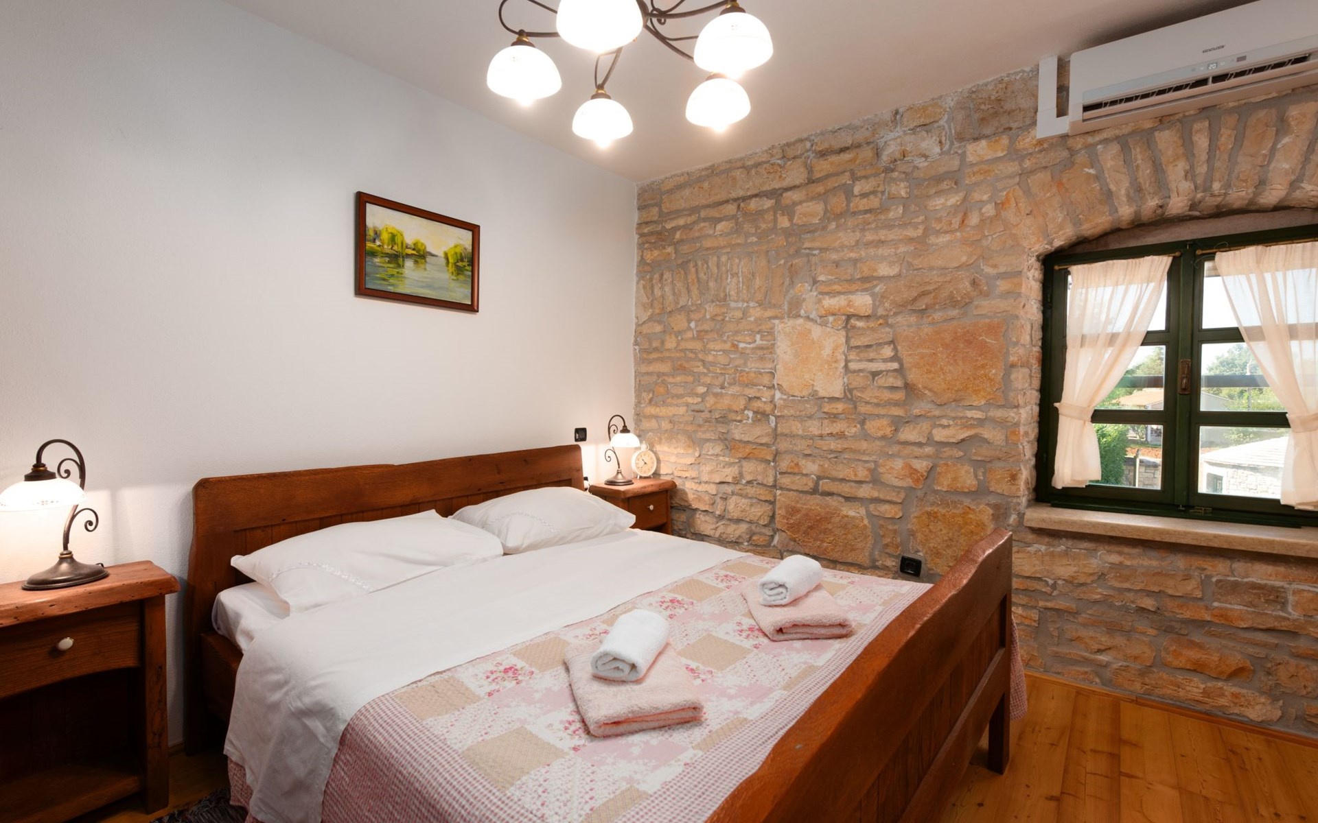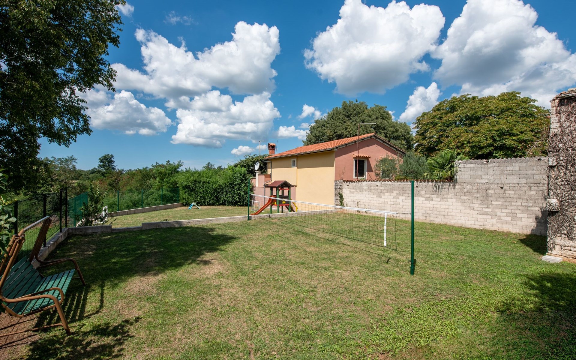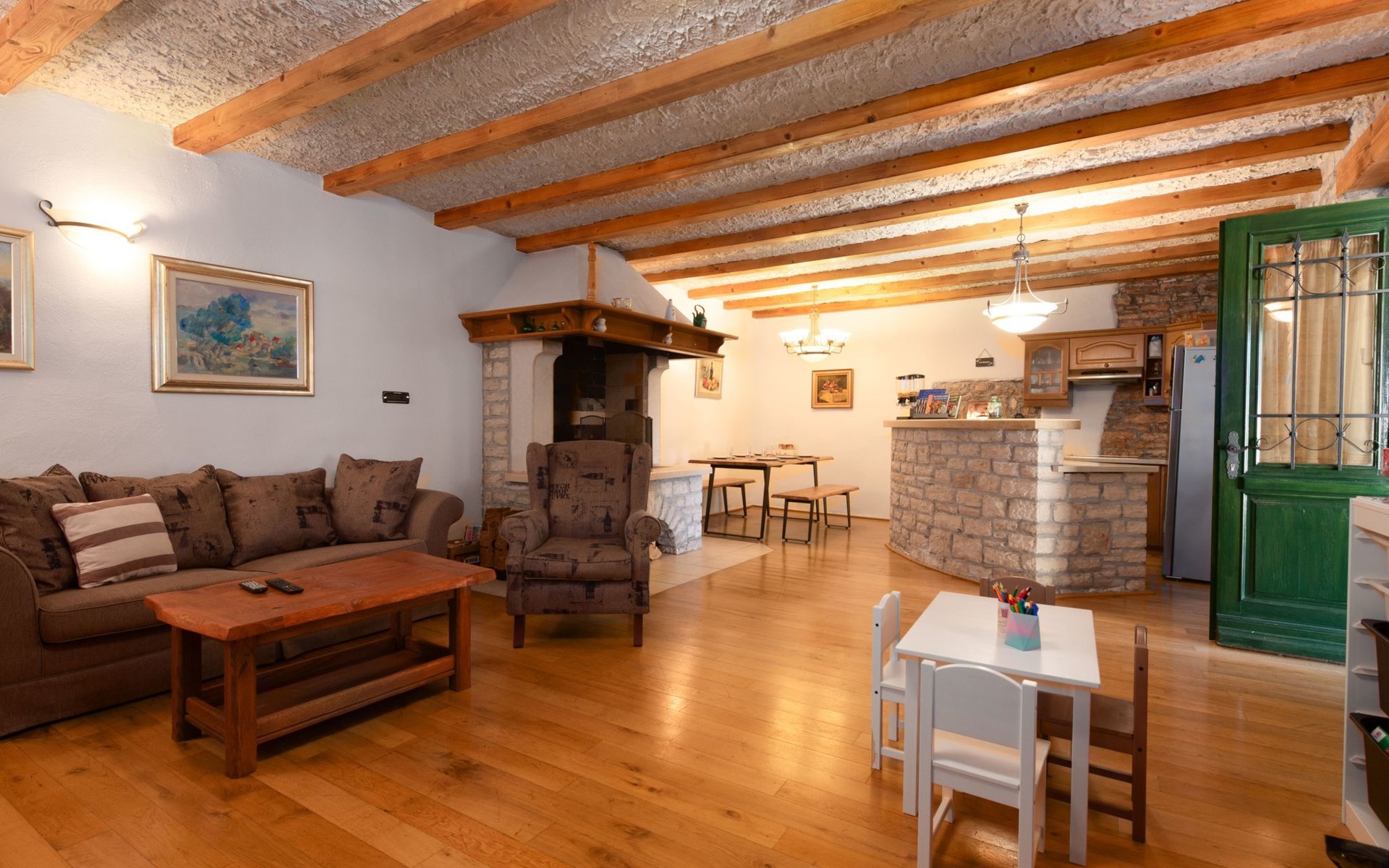 Das 170 m² große traditionelle Steinhaus wurde im Jahre 1905 erbaut und erst kürzlich im Jahre 2007 vollständig renoviert und mit allen modernen Annehmlichkeiten ausgestattet. Während der Renovierungsarbeiten wurde viel Wert darauf gelegt, den ursprünglichen gemütlichen Charakter des typisch istrisches Landhauses beizubehalten. Die vollständig klimatisierte (Kühlung und Heizung) Villa verteilt sich über zwei Etagen und bietet einen großen Wohn- und Essbereich mit integrierter offener Küche, drei Schlafzimmer mit drei en Suite Badezimmern und eine Gästetoilette. Die soliden Holzbalken an den Decken, Eichenparkett Fußböden und die handgefertigten Möbel im Wohnbereich unterstreichen die rustikale Landhausatmosphäre. Hier finden Sie zwei gemütliche Sofas, einen Sessel, Beistelltisch, Fernseher mit Satellitenempfang und USB Anschluss, DVD und CD Spieler, ein Radio und einen Safe, in dem Sie Ihre Wertsachen aufbewahren können. Der große offene Kamin aus istrischem Stein sorgt für angenehme Wärme an kühleren Abenden. Auf der anderen Seite des Raumes befindet sich ein Esstisch aus schwerem Holz mit passender Holzbank und Stühlen. Eine großzügige Frühstücksbar trennt den Essbereich von der Küche, die mit einer Spülmaschine, einem Herd, Ofen, Kühlschrank mit Gefrierfach, Kaffeemaschine und einem Toaster ausgestattet ist. Zudem befindet sich im Erdgeschoss noch die Gästetoilette. Eine breite Holztreppe führt in die obere Etage mit den drei en Suite Schlafzimmern. Die ersten beiden Schlafzimmer sind jeweils mit einem 160 cm x 200 cm großen Doppelbett und einem Sofabett ausgestattet, das sich in ein 90 cm x 190 cm großes Einzelbett umfunktionieren läßt und somit einen Schlafplatz für ein Kind bietet. Im dritten Schlafzimmer finden Sie zwei 90 cm x 190 cm große Einzelbetten, die sich auch zu einem Doppelbett zusammenschieben lassen. Alle drei Schlafzimmer verfügen über große Schränke mit ausreichend Platz für Ihre Kleidung und Gepäck und neben allen Betten befinden sich Nachttische mit Leselampen. Die en Suite Badezimmer bieten eine große Duschkabine, ein Waschbecken mit Wandspiegel, einen Föhn und eine Toilette. Auch stehen Ihnen eine Waschmaschine und ein Babybett zur Verfügung. Zuverlässiger WiFi Internetzugang wird in der Villa kostenlos geboten.