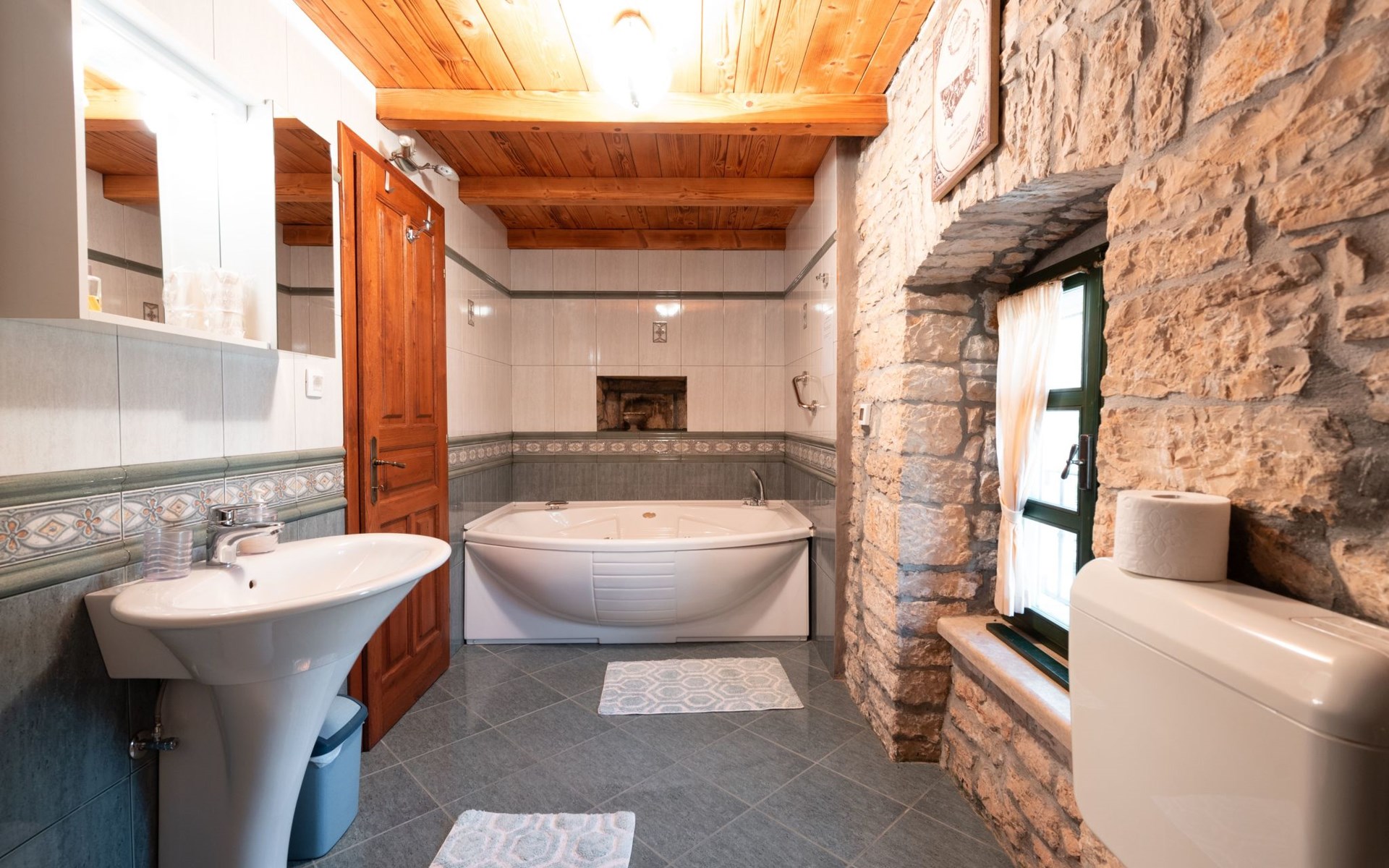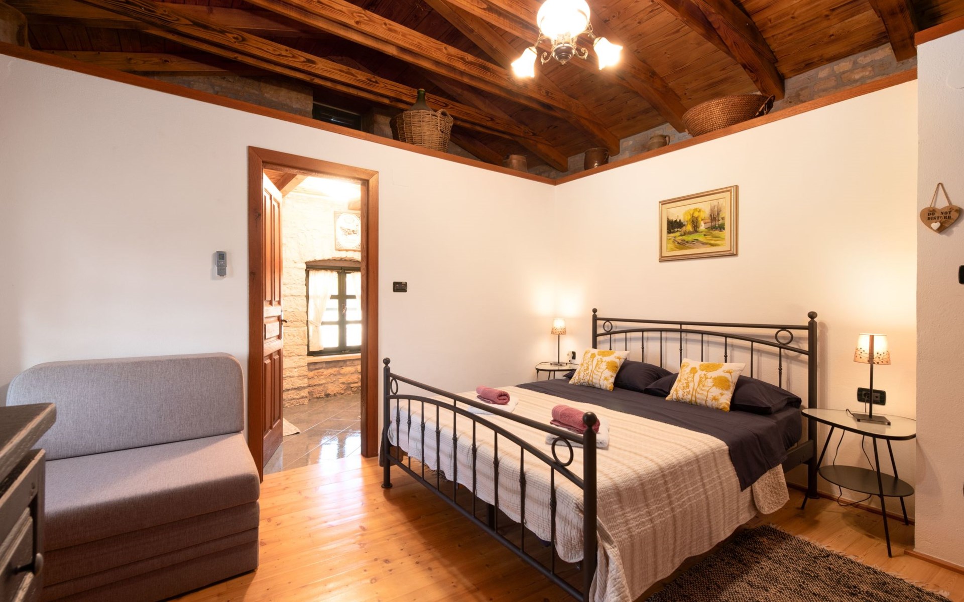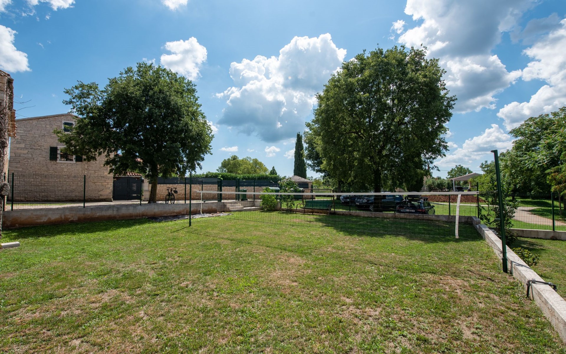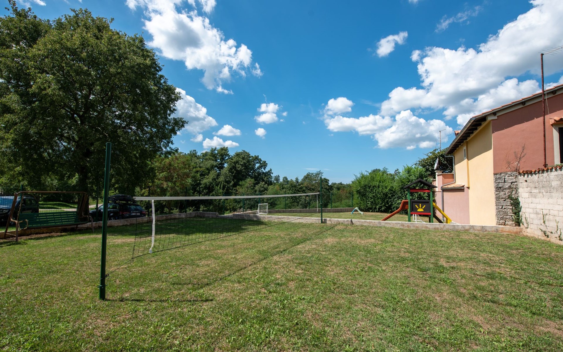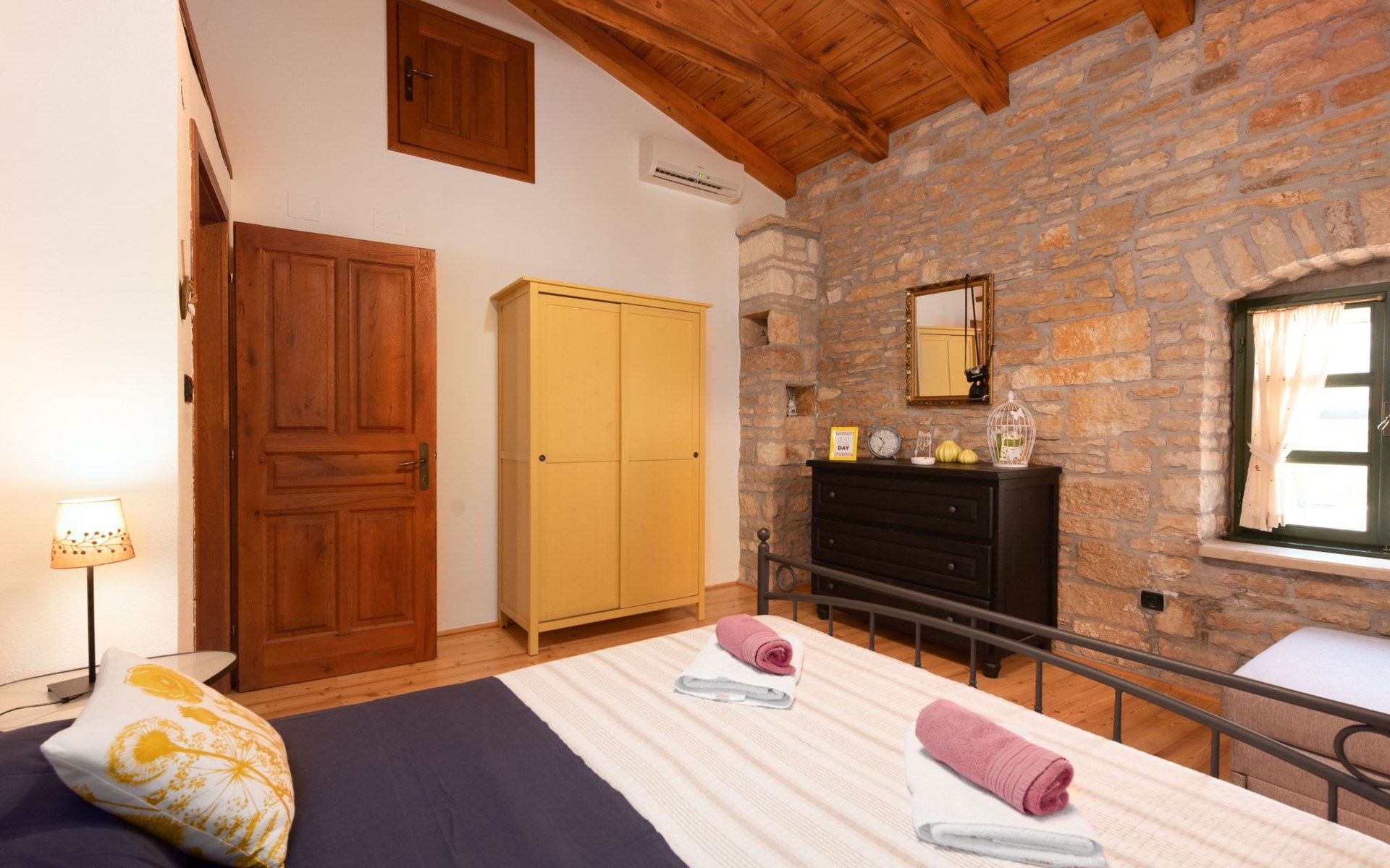 Das 170 m² große traditionelle Steinhaus wurde im Jahre 1905 erbaut und erst kürzlich im Jahre 2007 vollständig renoviert und mit allen modernen Annehmlichkeiten ausgestattet. Während der Renovierungsarbeiten wurde viel Wert darauf gelegt, den ursprünglichen gemütlichen Charakter des typisch istrisches Landhauses beizubehalten. Die vollständig klimatisierte (Kühlung und Heizung) Villa verteilt sich über zwei Etagen und bietet einen großen Wohn- und Essbereich mit integrierter offener Küche, drei Schlafzimmer mit drei en Suite Badezimmern und eine Gästetoilette. Die soliden Holzbalken an den Decken, Eichenparkett Fußböden und die handgefertigten Möbel im Wohnbereich unterstreichen die rustikale Landhausatmosphäre. Hier finden Sie zwei gemütliche Sofas, einen Sessel, Beistelltisch, Fernseher mit Satellitenempfang und USB Anschluss, DVD und CD Spieler, ein Radio und einen Safe, in dem Sie Ihre Wertsachen aufbewahren können. Der große offene Kamin aus istrischem Stein sorgt für angenehme Wärme an kühleren Abenden. Auf der anderen Seite des Raumes befindet sich ein Esstisch aus schwerem Holz mit passender Holzbank und Stühlen. Eine großzügige Frühstücksbar trennt den Essbereich von der Küche, die mit einer Spülmaschine, einem Herd, Ofen, Kühlschrank mit Gefrierfach, Kaffeemaschine und einem Toaster ausgestattet ist. Zudem befindet sich im Erdgeschoss noch die Gästetoilette. Eine breite Holztreppe führt in die obere Etage mit den drei en Suite Schlafzimmern. Die ersten beiden Schlafzimmer sind jeweils mit einem 160 cm x 200 cm großen Doppelbett und einem Sofabett ausgestattet, das sich in ein 90 cm x 190 cm großes Einzelbett umfunktionieren läßt und somit einen Schlafplatz für ein Kind bietet. Im dritten Schlafzimmer finden Sie zwei 90 cm x 190 cm große Einzelbetten, die sich auch zu einem Doppelbett zusammenschieben lassen. Alle drei Schlafzimmer verfügen über große Schränke mit ausreichend Platz für Ihre Kleidung und Gepäck und neben allen Betten befinden sich Nachttische mit Leselampen. Die en Suite Badezimmer bieten eine große Duschkabine, ein Waschbecken mit Wandspiegel, einen Föhn und eine Toilette. Auch stehen Ihnen eine Waschmaschine und ein Babybett zur Verfügung. Zuverlässiger WiFi Internetzugang wird in der Villa kostenlos geboten.
