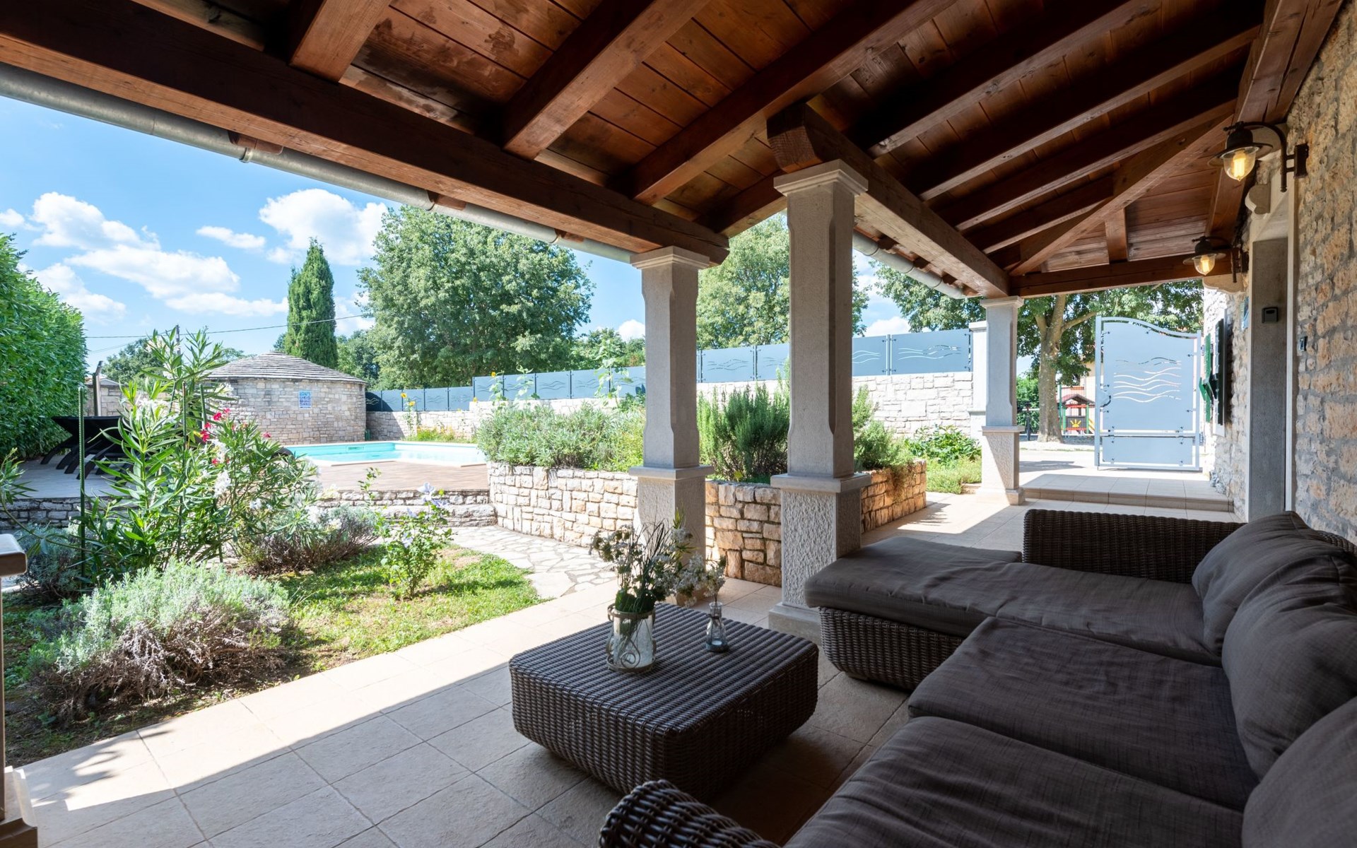 Die beiden großen Glastüren im Wohnbereich öffnen sich direkt auf die überdachte Terrasse mit einem Tisch und Stühlen, die den 1300 m² großen grünen Gartenbereich und Ihren von Sonnenliegen umgebenen 7m x 4m privaten Pool überblicken. Direkt neben der Terrasse lädt der traditionelle Steinofen zu langen Grillabenden unter dem Sternenhimmel neben dem erleuchteten Pool ein. Drei sichere Parkplätze stehen auf dem umfriedeten Gelände direkt vor der Villa zu Verfügung.