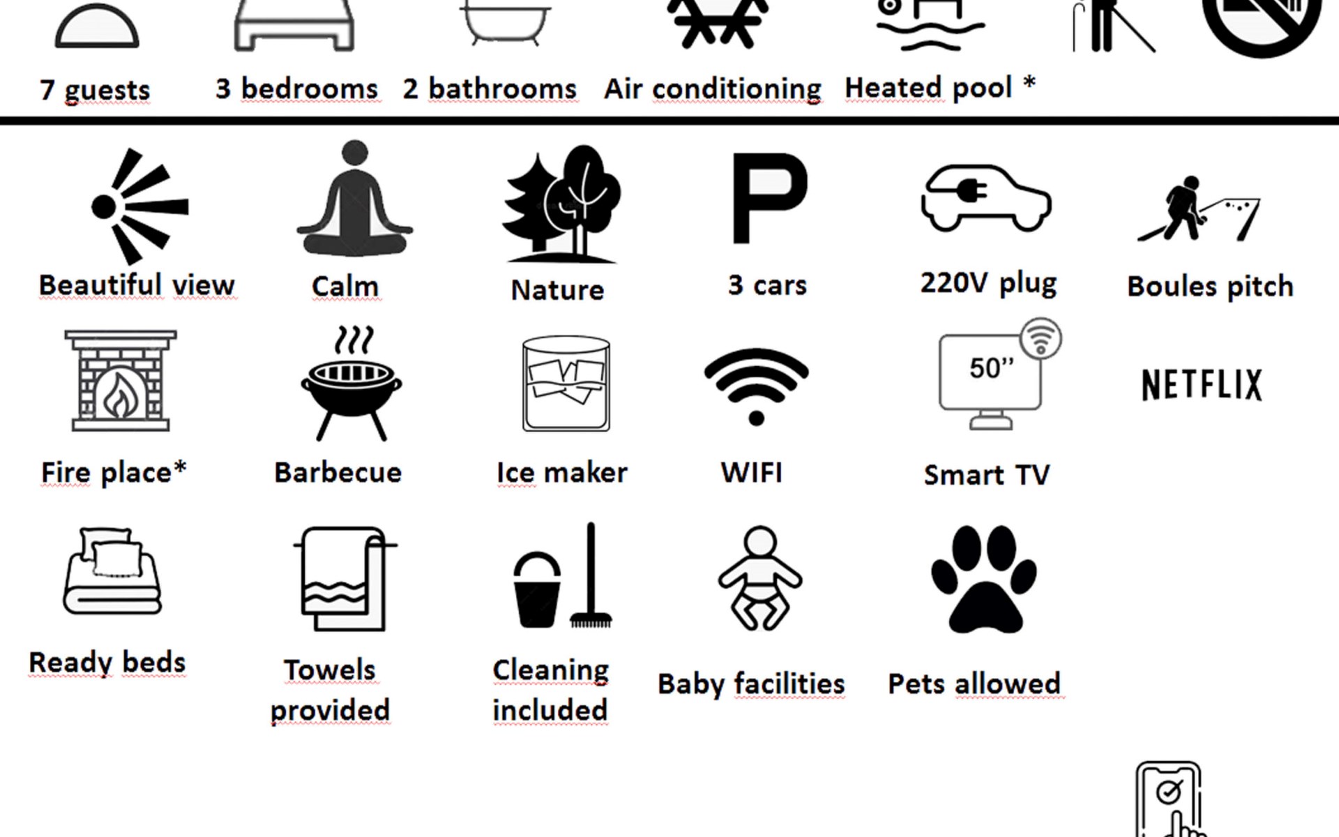 Im Außenbereich gehört das Anwesen ausschließlich Ihnen, mit einem beheizten Privatpool, der im Südlicht badet und absolute Privatsphäre verspricht, außer an den Weihnachtsfeiertagen. Der nicht eingezäunte Garten bietet verschiedene Terrassen und einen Grillplatz, um Familie und Freunde zusammenzubringen. Nicht zu vergessen der Bouleplatz für entspannende Momente und Spiele.