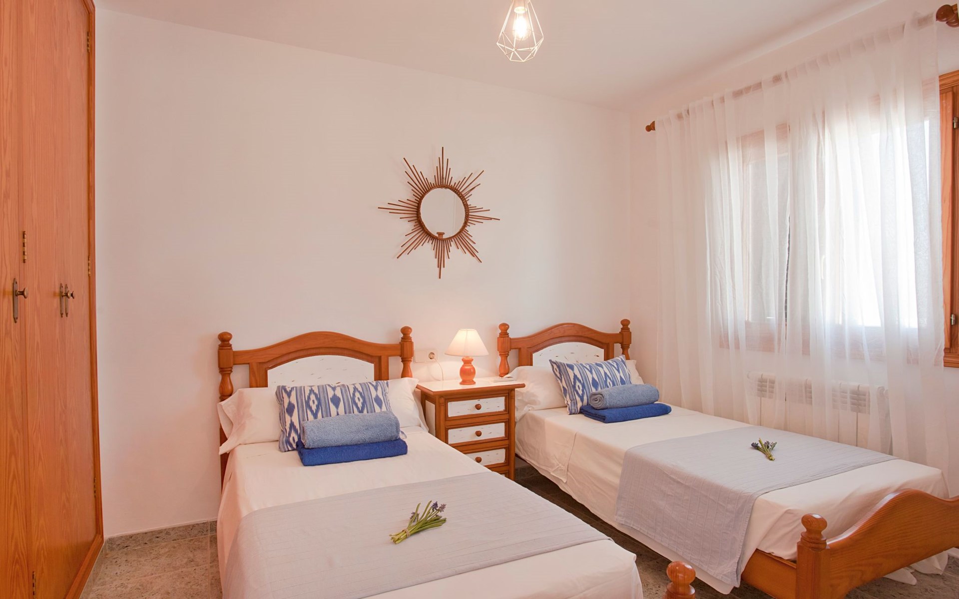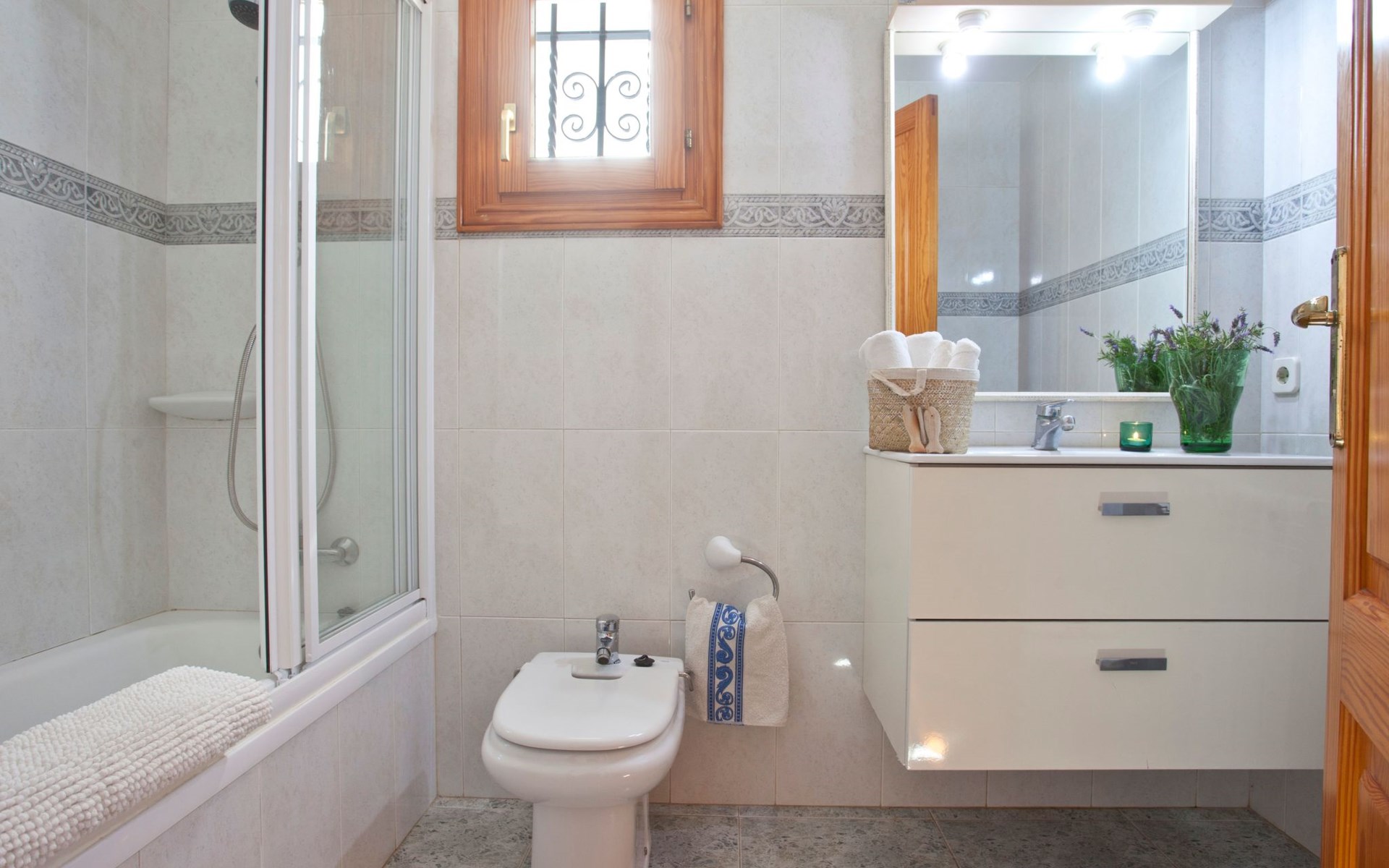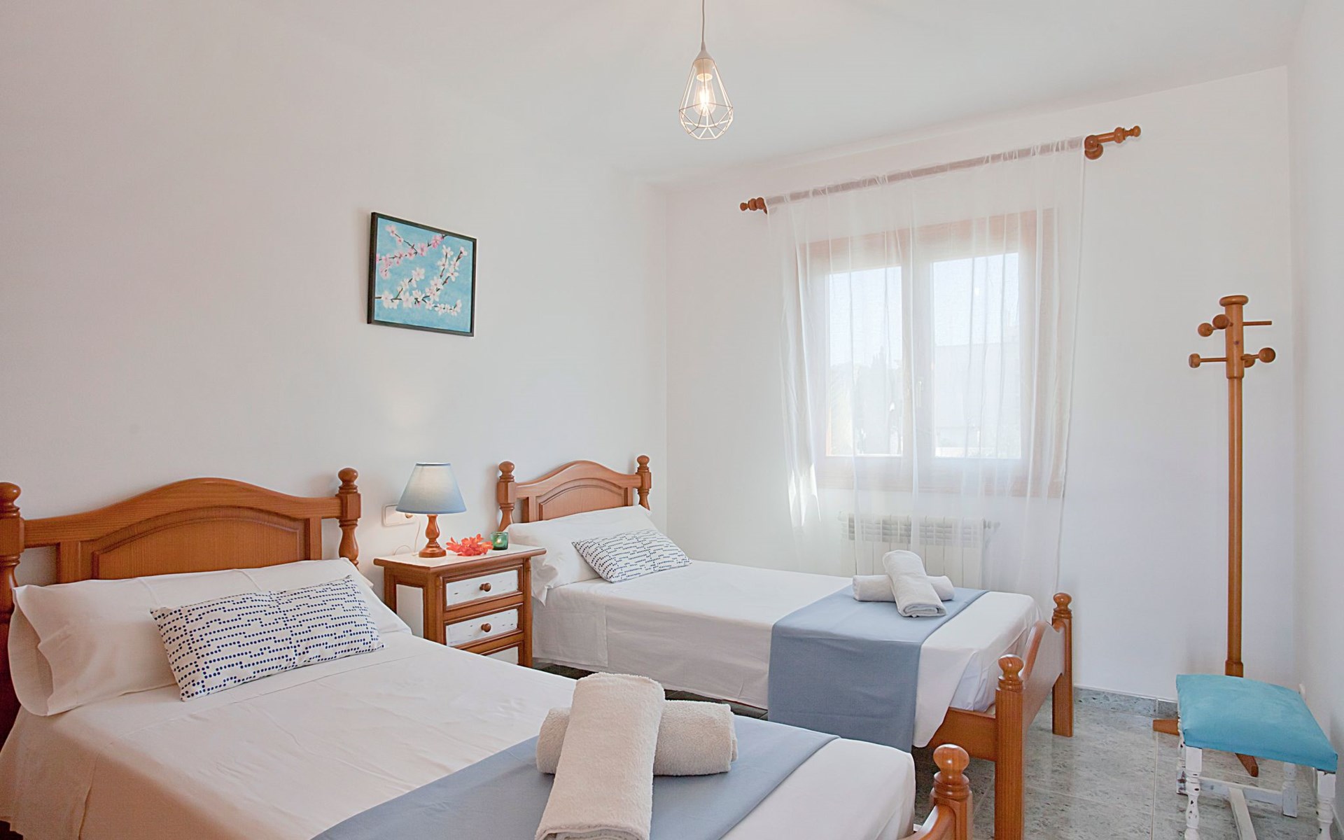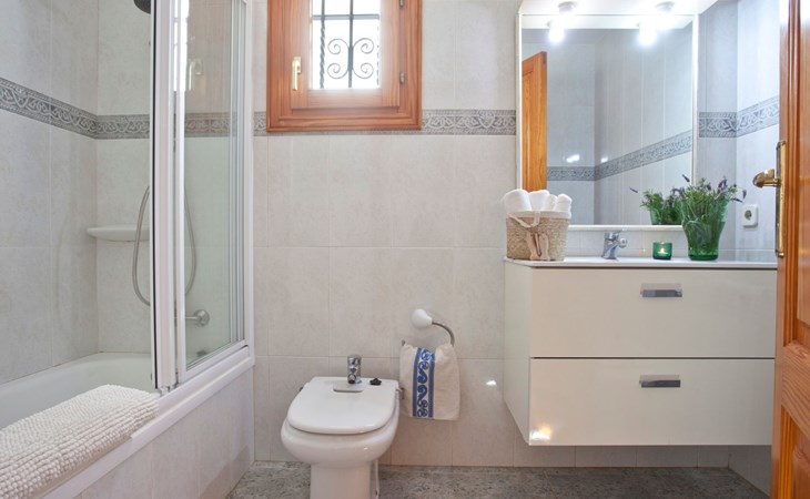 Das Innere der Villa zeigt ein Design, das auf das Wohlbefinden der Gäste ausgerichtet ist. Der Eingang führt in einen einladenden Flur, der zu einem offenen Wohn-/Esszimmer führt. Die Türen des Wohnzimmers führen auf eine teilweise überdachte Terrasse, die mit ihrem Grill ideal ist, um die Natur zu genießen. Die voll ausgestattete Küche mit Frühstückstisch bietet einen direkten Zugang zum Parkplatz. Der Komfort erstreckt sich auch auf die Schlafzimmer, wobei das Hauptschlafzimmer über ein eigenes Bad verfügt, während sich die beiden Zweibettzimmer ein Bad teilen. Alle sind mit Klimaanlage und Heizung ausgestattet.