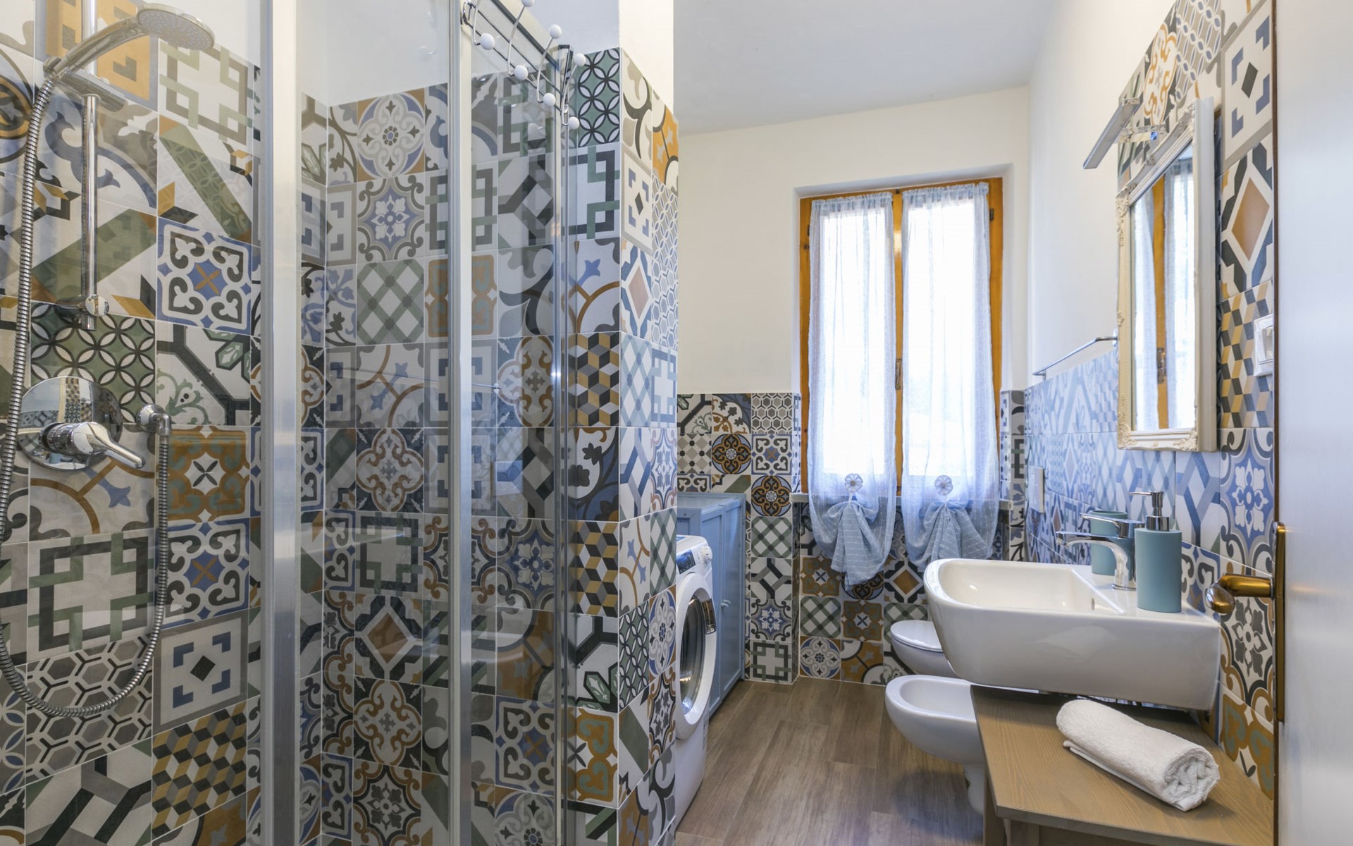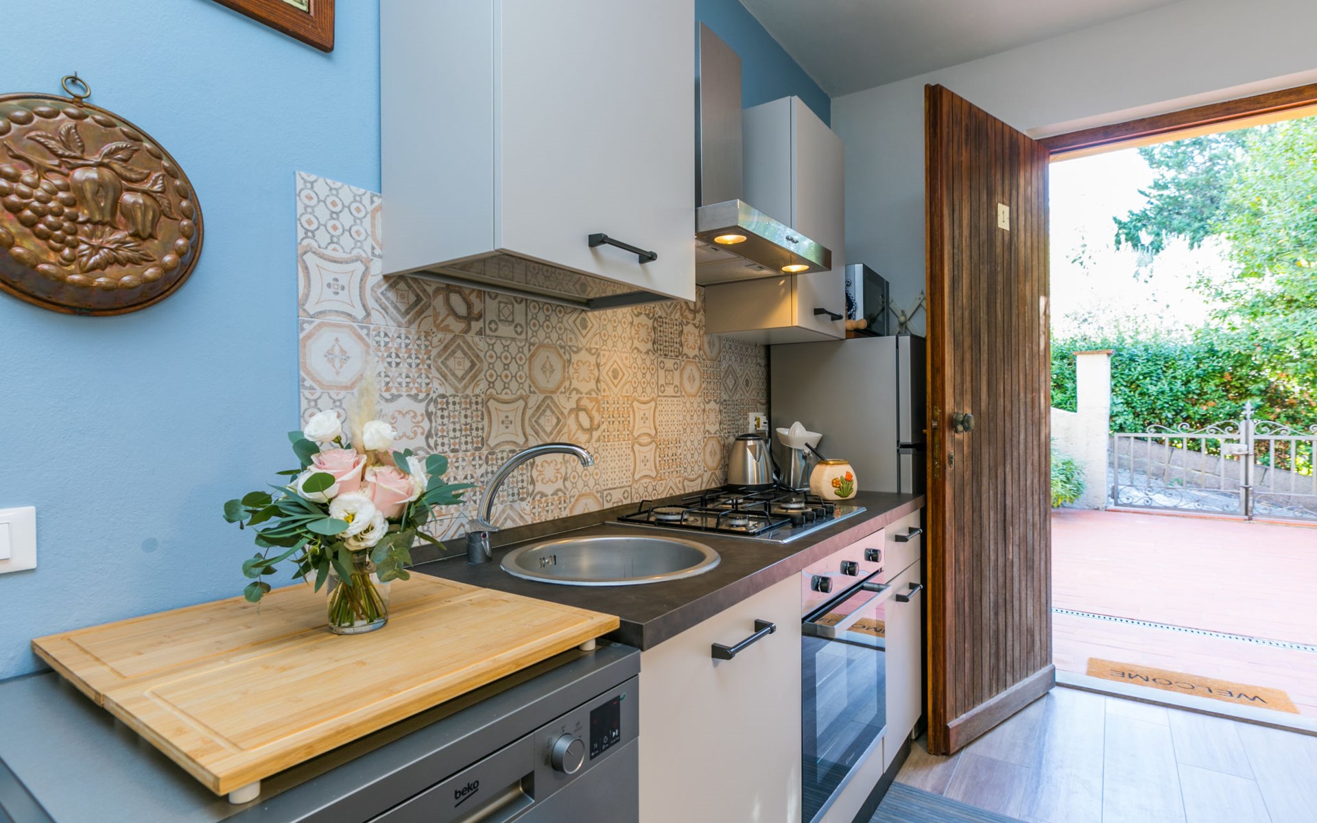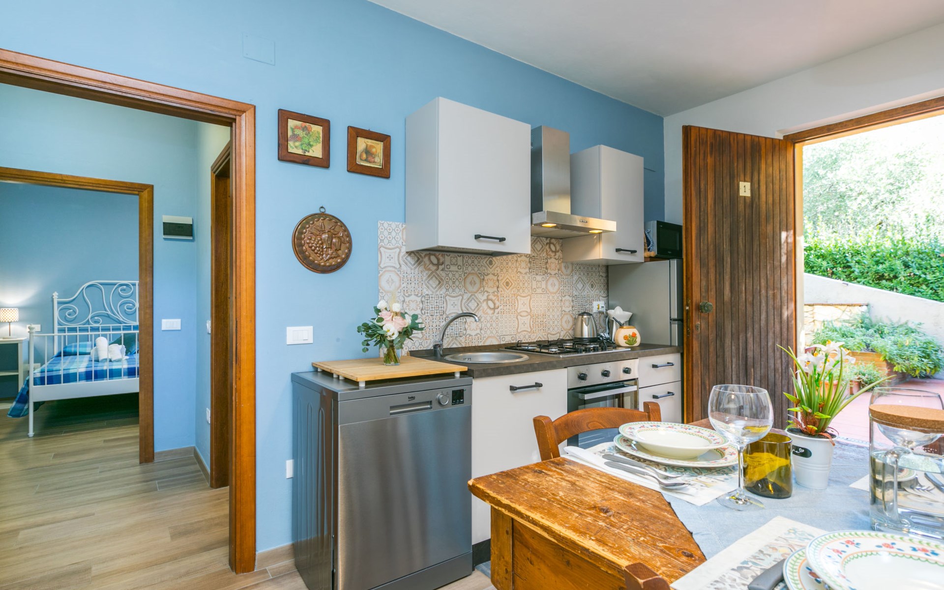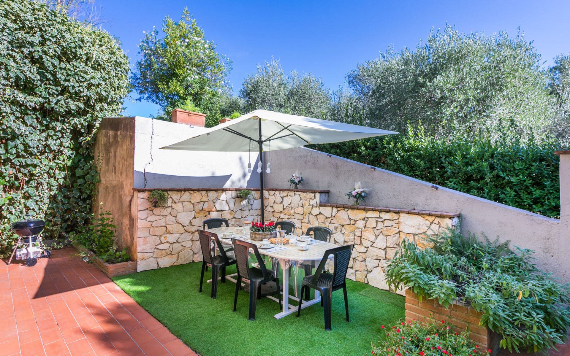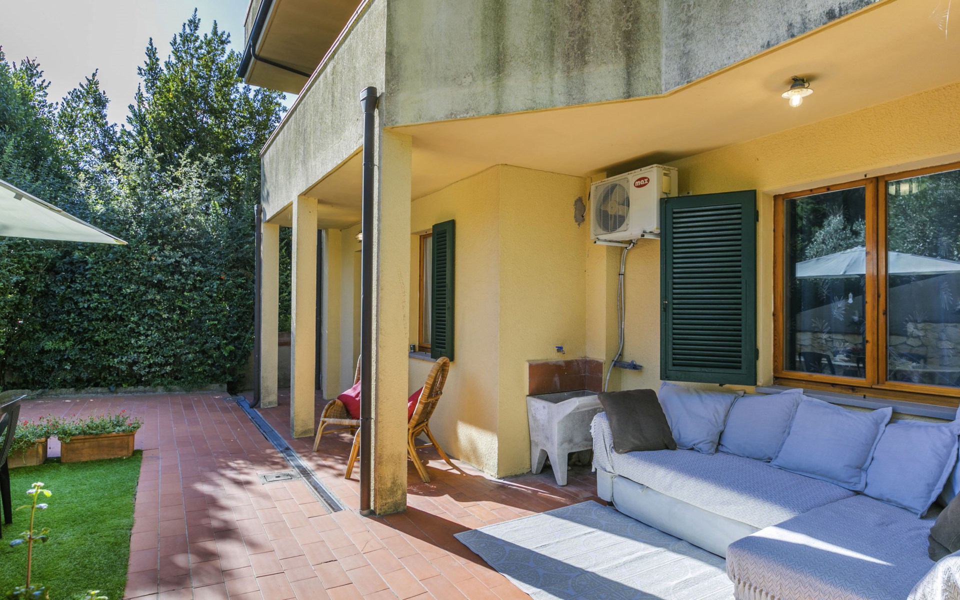 Residenz "Rio del sole", umgeben von Bäumen. 1.3 km vom Zentrum von Montescudaio, 12 km vom Meer. Zur Mitbenutzung: Park, Schwimmbad geschützt (saisonale Verfügbarkeit: 10.Jun. - 10.Sep.) mit Salzelektrolyse-Reinigungssystem. Öffentliche Parkplätze 50 m. Lebensmittelgeschäft 1.2 km, Supermarkt 9 km, Restaurant 350 m, Bushaltestelle "Podere Cerioni" 90 m, Sandstrand "Marina di Cecina" 12 km, Felsstrand "Castiglioncello" 24 km, Thermalbad "Calidario" 43 km. Nahe gelegene Sehenswürdigkeiten: Bolgheri 17 km, San Gimignano 60 km, Pisa 60 km, Lucca 80 km, Firenze 120 km. Bitte beachten: geeignet für Familien. Badekappenpflicht.