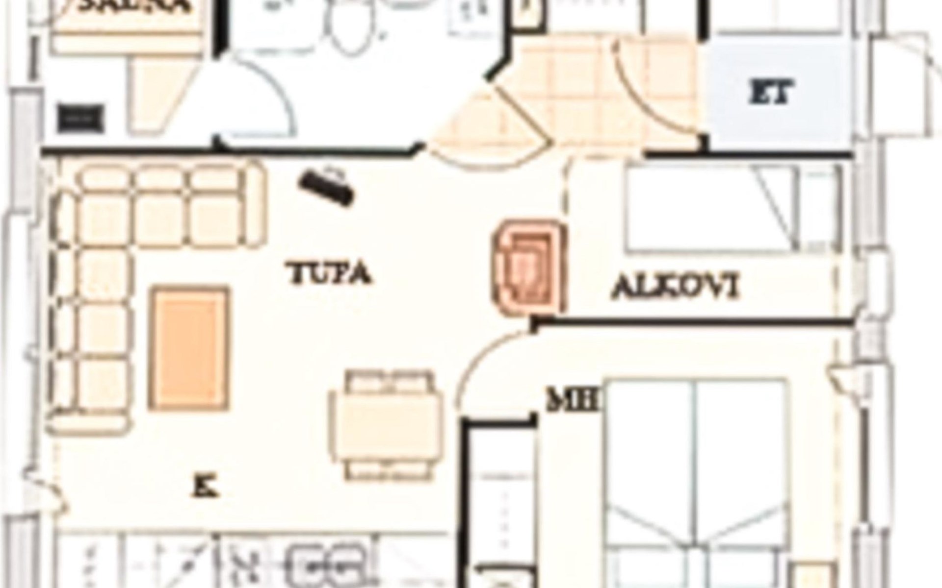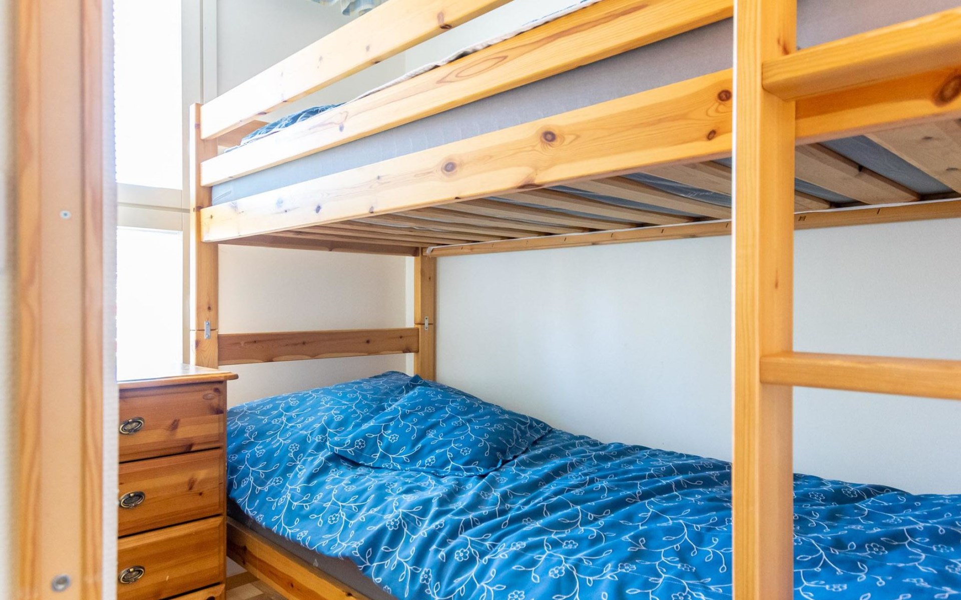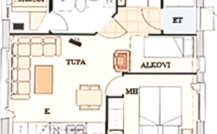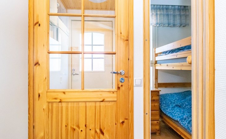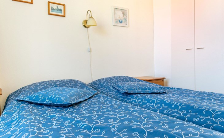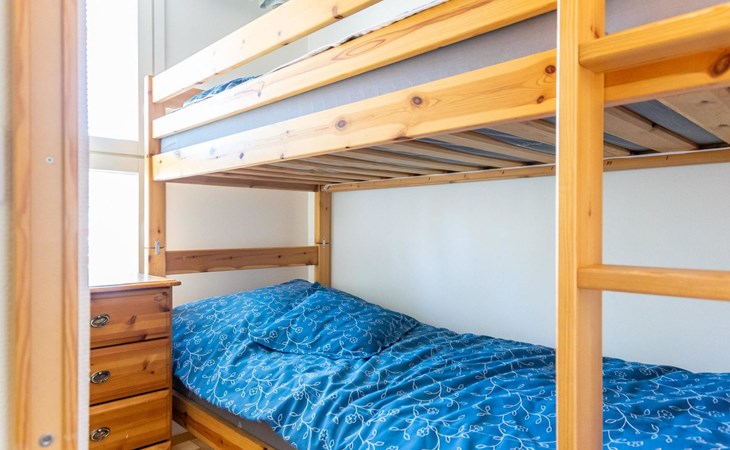 Restful sleep comes in the apartment's bedroom, which has two beds. In addition, there is a bunk bed in the alcove, which can be closed with a folding door, and a 140 cm wide sofa bed in the living room.