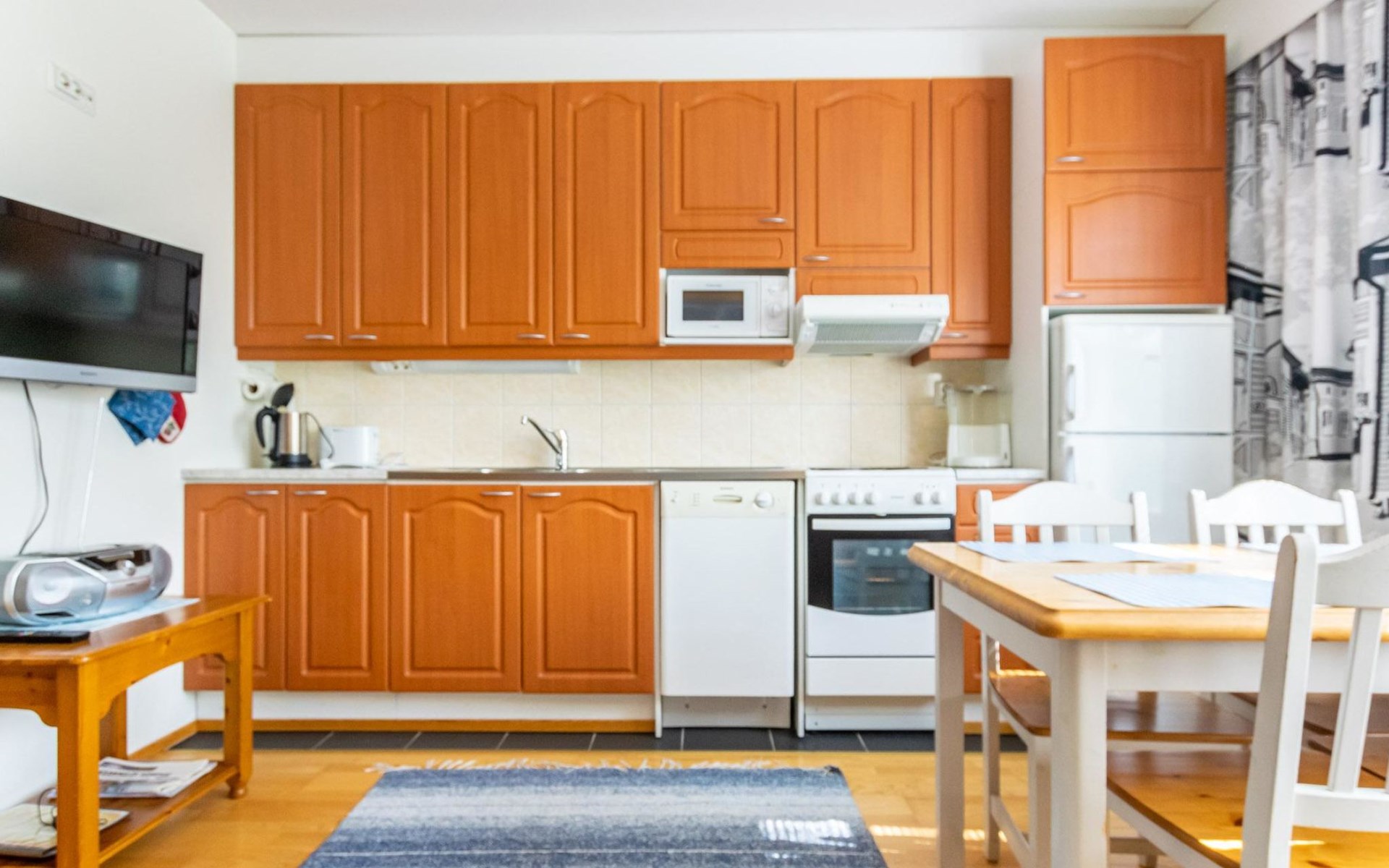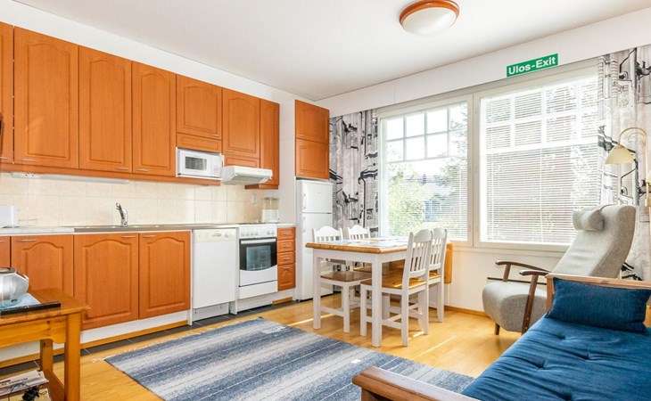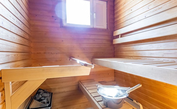 The kitchenette has everything you need for cooking and socialising. You can enjoy the warmth of the fireplace while dining, and the apartment's own sauna provides extra warmth after a day's excursions.
