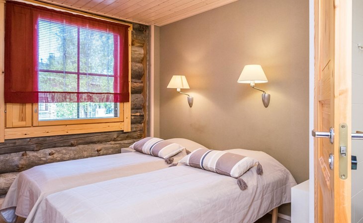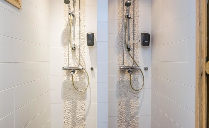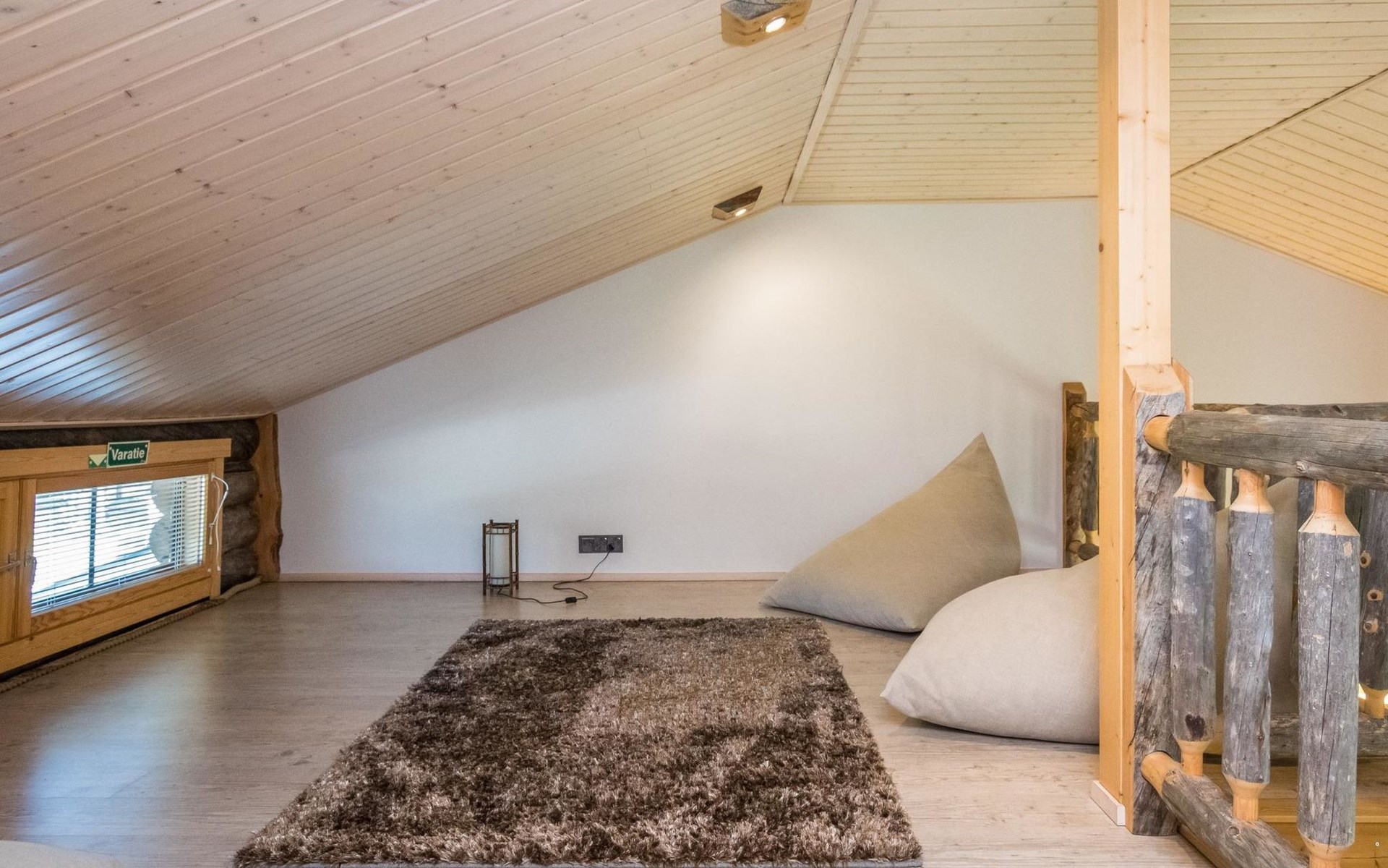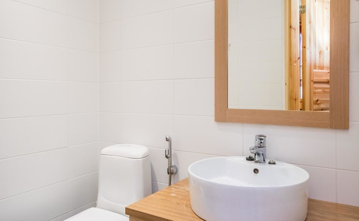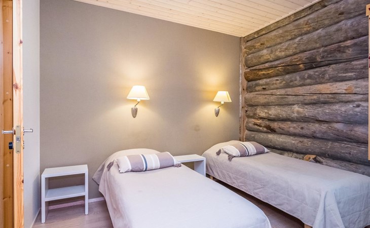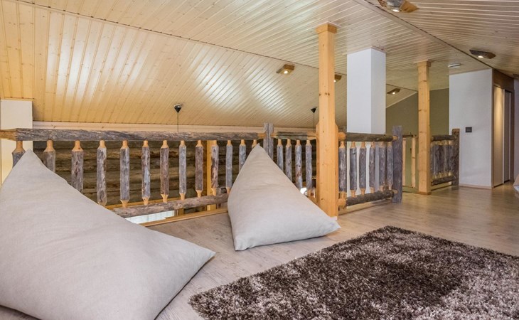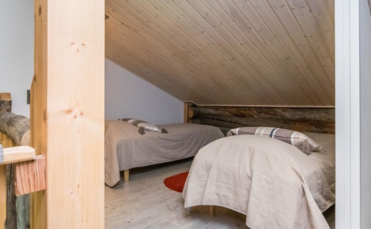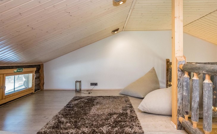 The bedrooms are located on the ground floor. Three bedrooms, each with two beds and a private toilet, provide plenty of private space and a peaceful place to sleep. From the living room there is a staircase to the loft with a lounge and an alcove with two beds.
