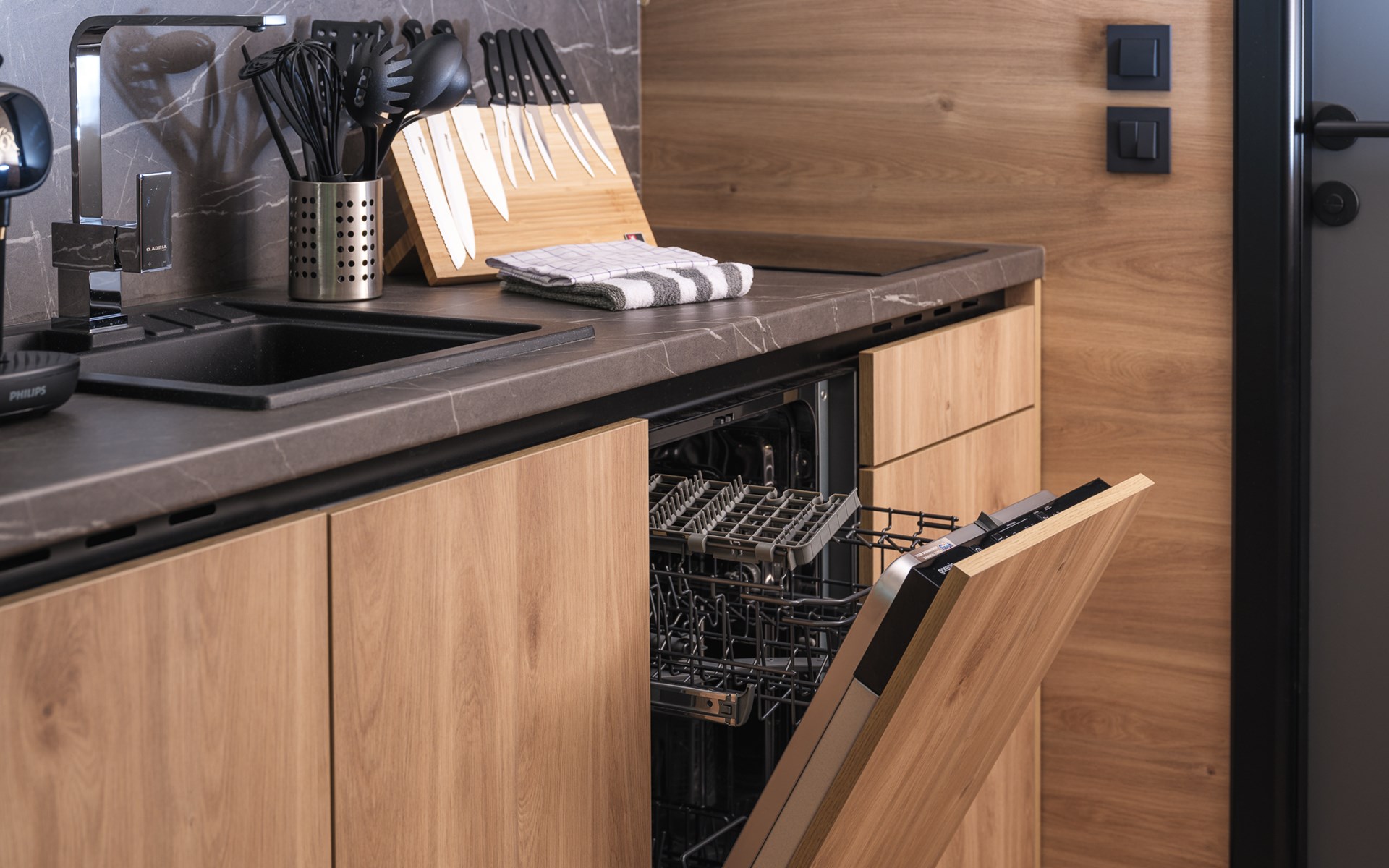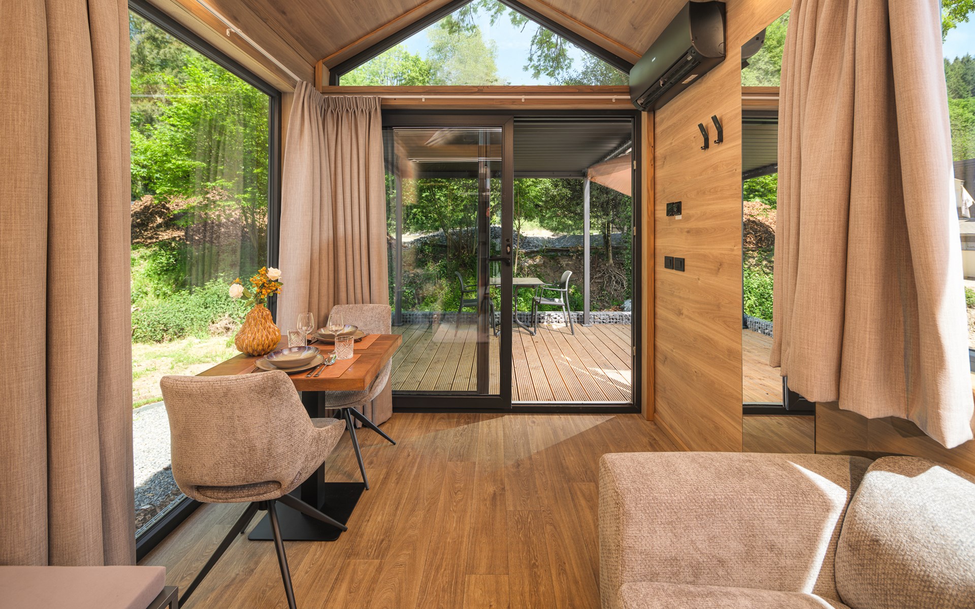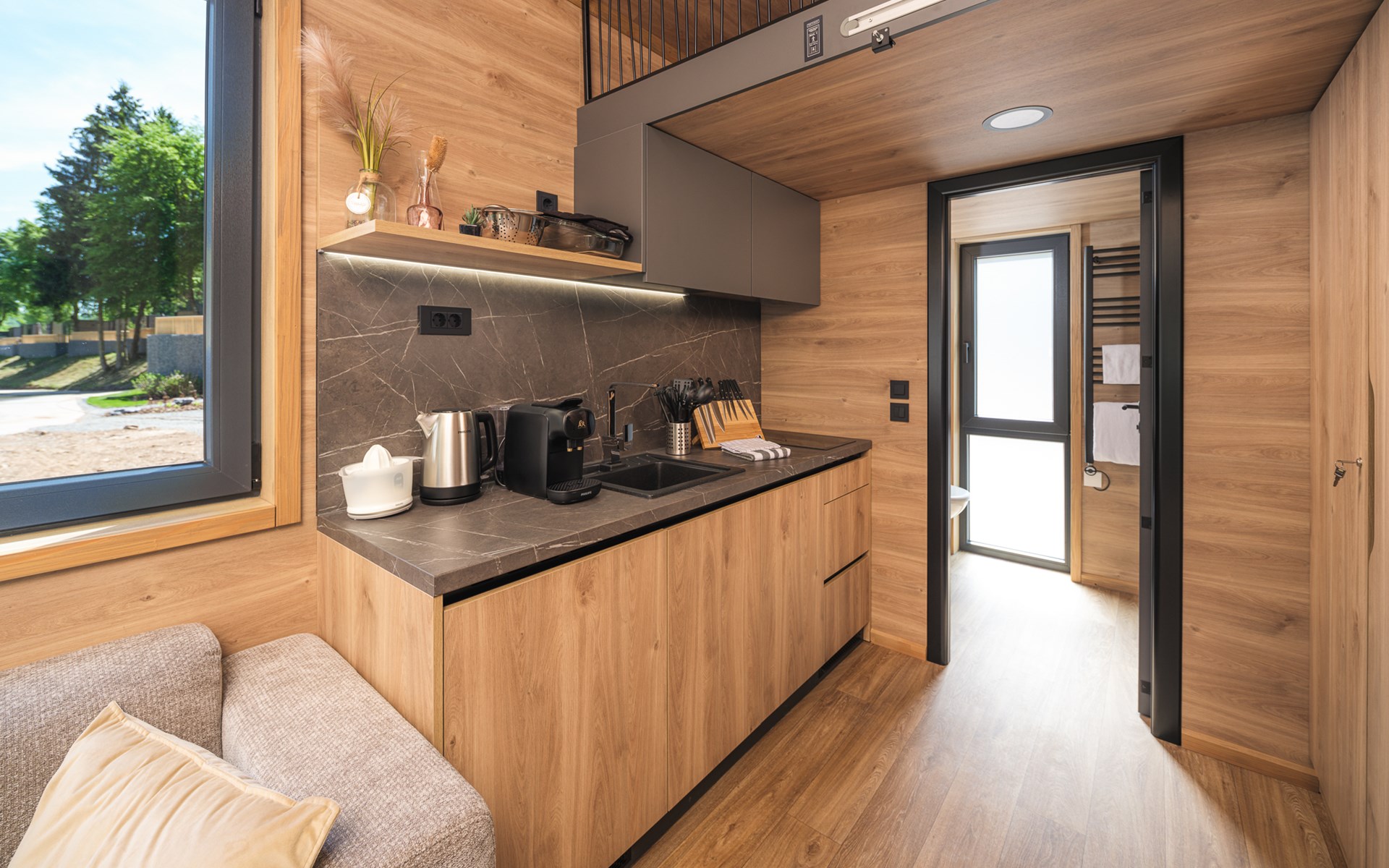 Das Tiny Loft ist clever gestaltet und strahlt Wärme und Gemütlichkeit aus. Die überdachte Veranda lädt dazu ein, auch bei weniger gutem Wetter die herrliche Aussicht auf die Hügel zu genießen. Im Inneren erwartet Sie ein gemütliches Wohnzimmer mit Klimaanlage, die zu jeder Jahreszeit für eine angenehme Temperatur sorgt. Die Terrassentüren schaffen einen nahtlosen Übergang zwischen drinnen und draußen, sodass Sie immer mit der ruhigen Natur verbunden bleiben. Die kompakte Küche bietet alles, was Sie brauchen, um eine einfache Mahlzeit zuzubereiten, während die Schlafempore einen einzigartigen und gemütlichen Ort zum Entspannen bietet. Das moderne Badezimmer ist komplett ausgestattet mit einer geräumigen Dusche, einer Toilette und einem stilvollen Waschtisch.
