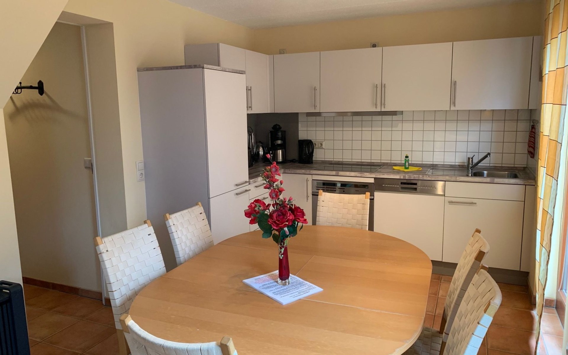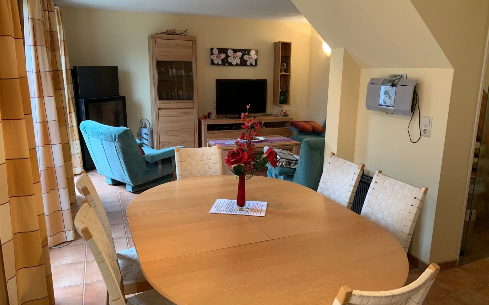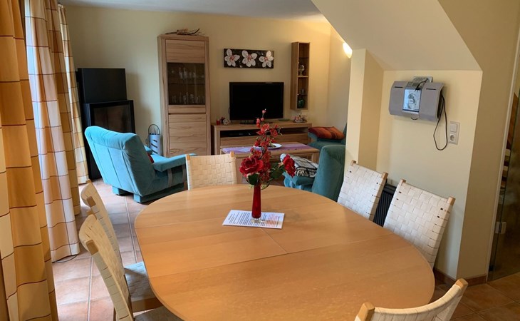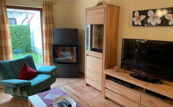 Sie betreten das komfortabel eingerichtete Ferienhaus über den Flur mit Garderobe. Von hier gehen Sie in das untere Bad mit eingelassener Badewanne und WC. Das Wohn- und Esszimmer mit offener Küche befindet sich auch auf dieser Etage. Hier steht Ihnen eine Einbauküche mit Backofen und Cerankochfeld, Geschirrspüler, Kühlschrank mit Gefrierfach, Radio, Kaffeemaschine, Wasserkocher, Mikrowelle, Toaster, Mixer und Eierkocher zur Verfügung. Neben der Küchezeile ist der Esstisch mit 6 Stühlen. Der Wohnbereich ist mit einer Couchgarnitur, einem Landhaus- TV- Schrank mit SAT-Fernseher/DVD und einem Radio/CD, sowie einem modernen Kamin ausgestattet. Im Haus gibt es drei Schlafzimmer. Eins ist unten, die zwei weiteren Schlaf- zimmer sind im Dachgeschoß.Ein Schlafzimmer im OG hat einen SAT-Fernseher/DVD und ein Radio/CD, Ins obere Stockwerk gelangen Sie über die Treppe im Flur. In allen drei Schlafzimmern stehen ein Doppelbett und ein Kleiderschrank. Das zweite Bad im Obergeschoss ist mit einer Dusche, WC und einer Waschmaschine ausgestattet. Kinderbett und Kinderstuhl sind auch vorhanden. Bei Bedarf kann über eine elektrische Heizung bzw. teilweise zusätzlich Fussbodenheizung und natürlich durch den Kaminofen die entsprechende Wärme erzeugt werden. Kaminholz ist vor Ort erhältlich.