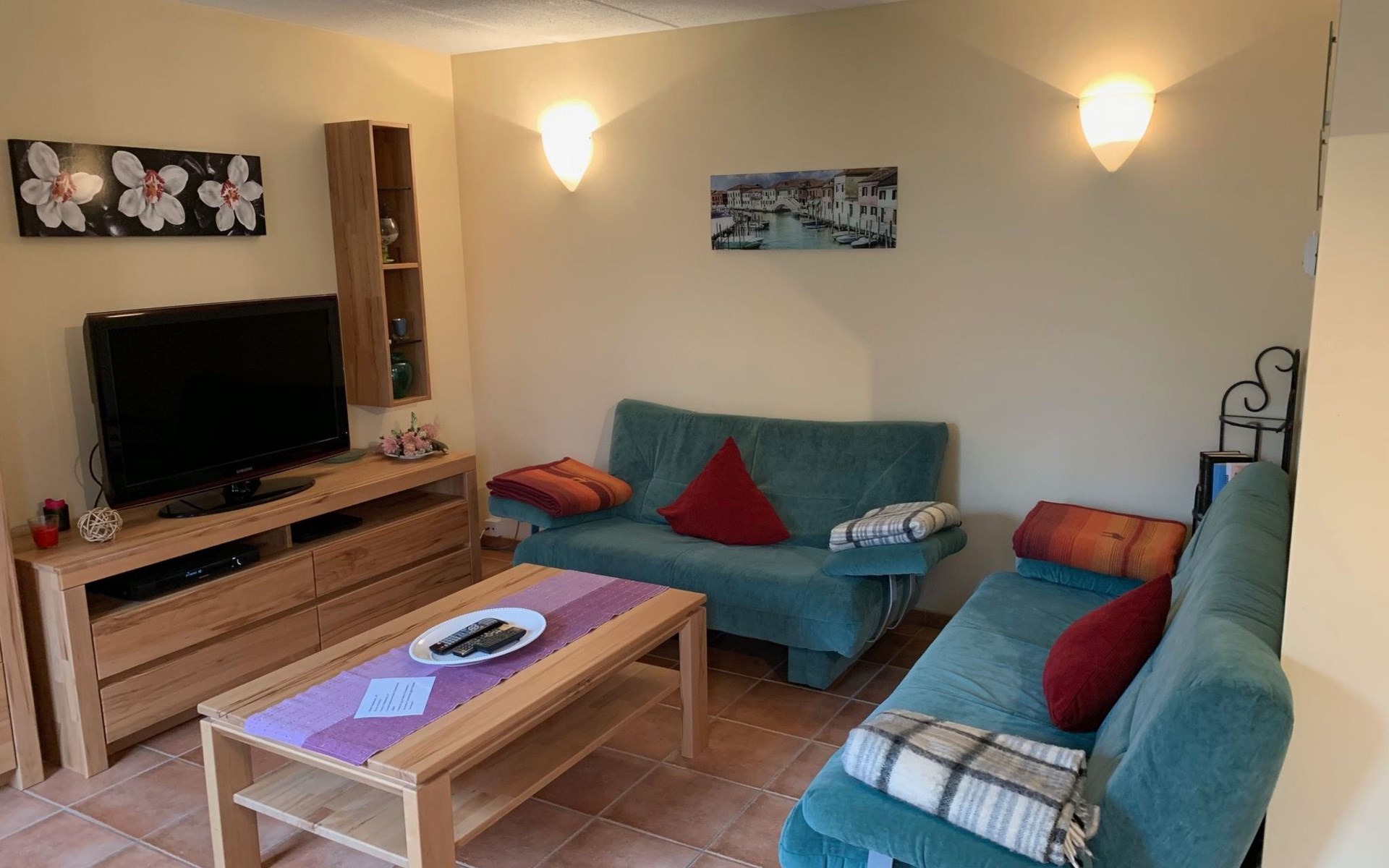 Die eigene Terrasse, von der aus Sie auch zum See schauen können, erreichen Sie über den Wohn - Essbereich. Gartenmöbel und ein Grill stehen in einem kleinen Anbau zur Verfügung. In diesen Anbau können Sie Ihre mitgebrachten oder ausgeliehenen Fahrräder einschließen. Zwei PKW Stellplätze befinden sich am Haus., Alle Fenster und die Terassentür sind mit Fliegenschutzgittern gegen ungebetene Insekten geschützt.