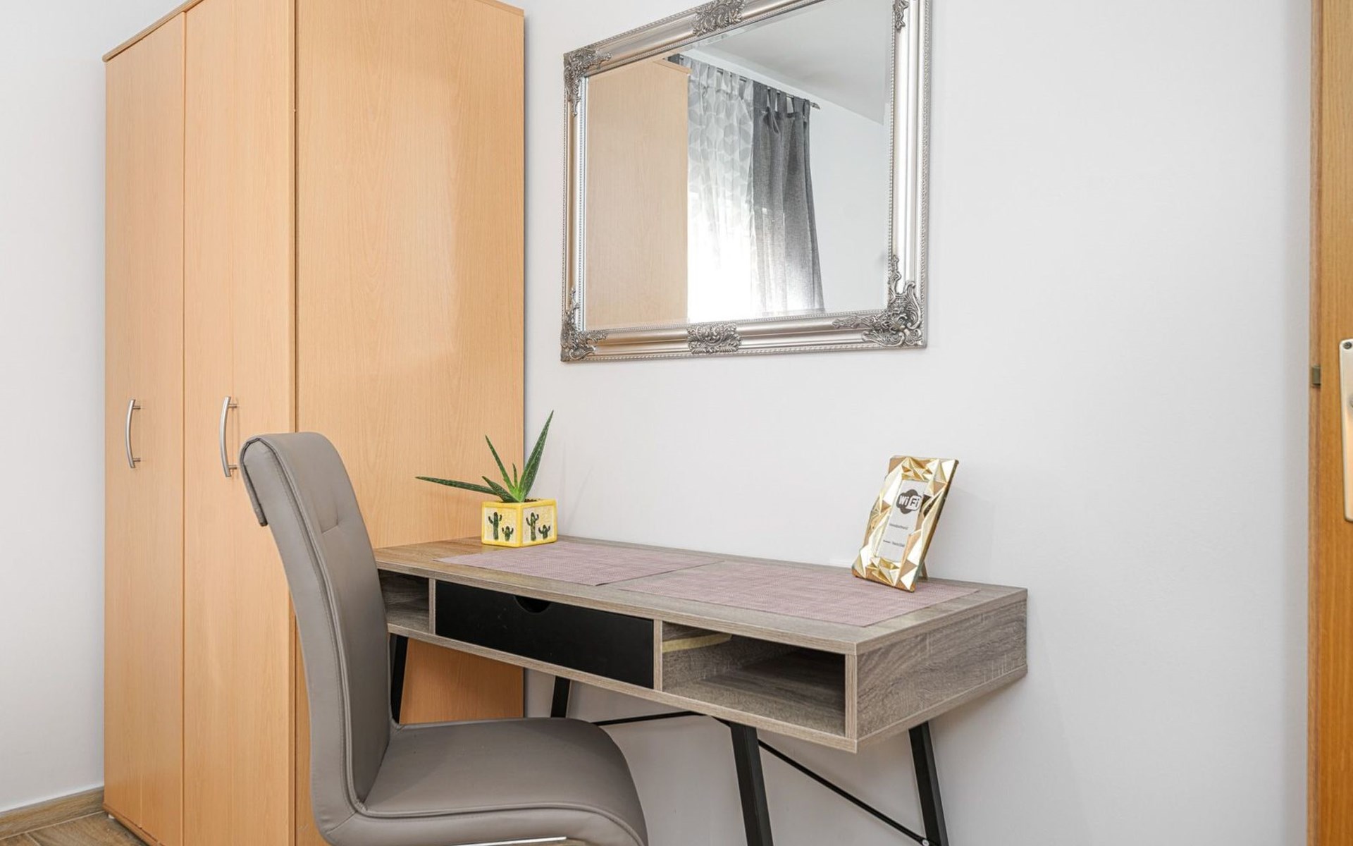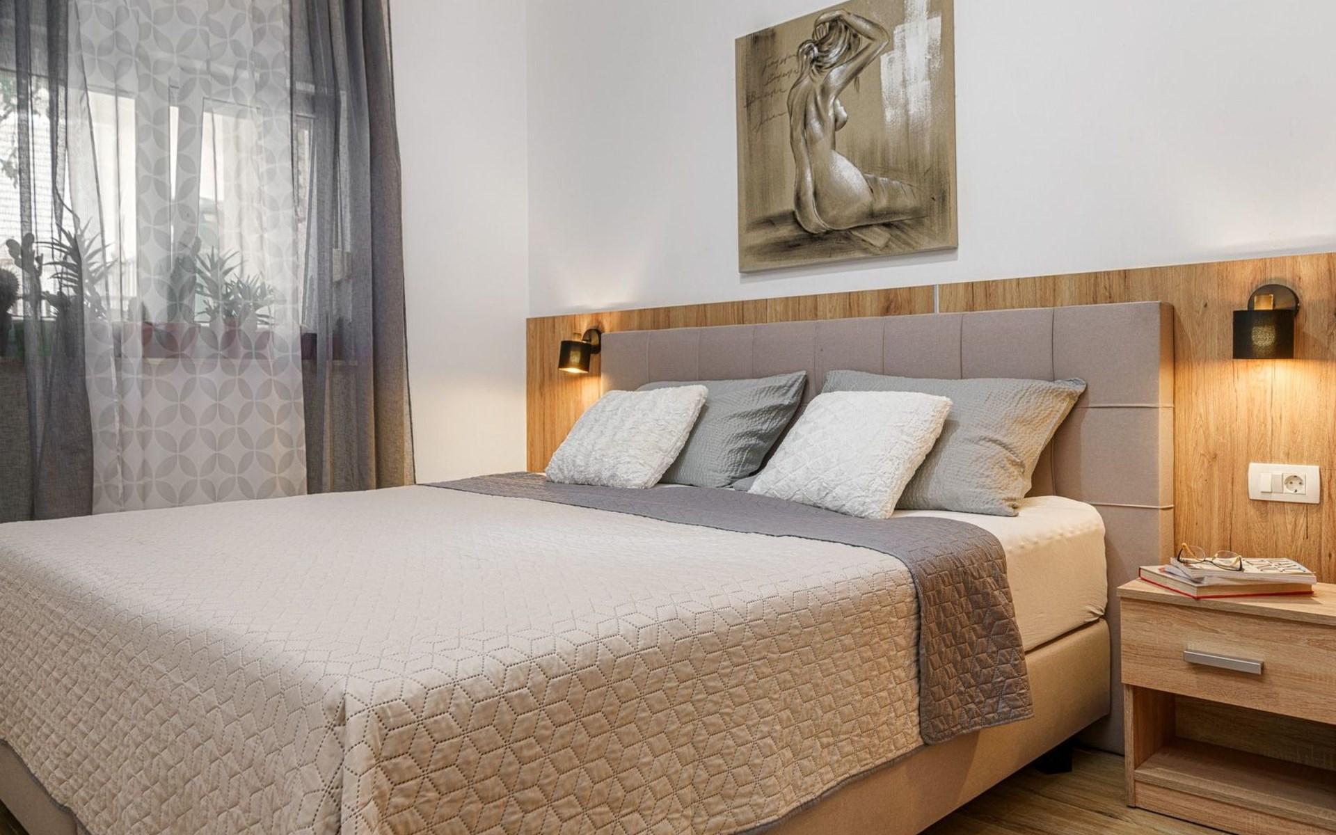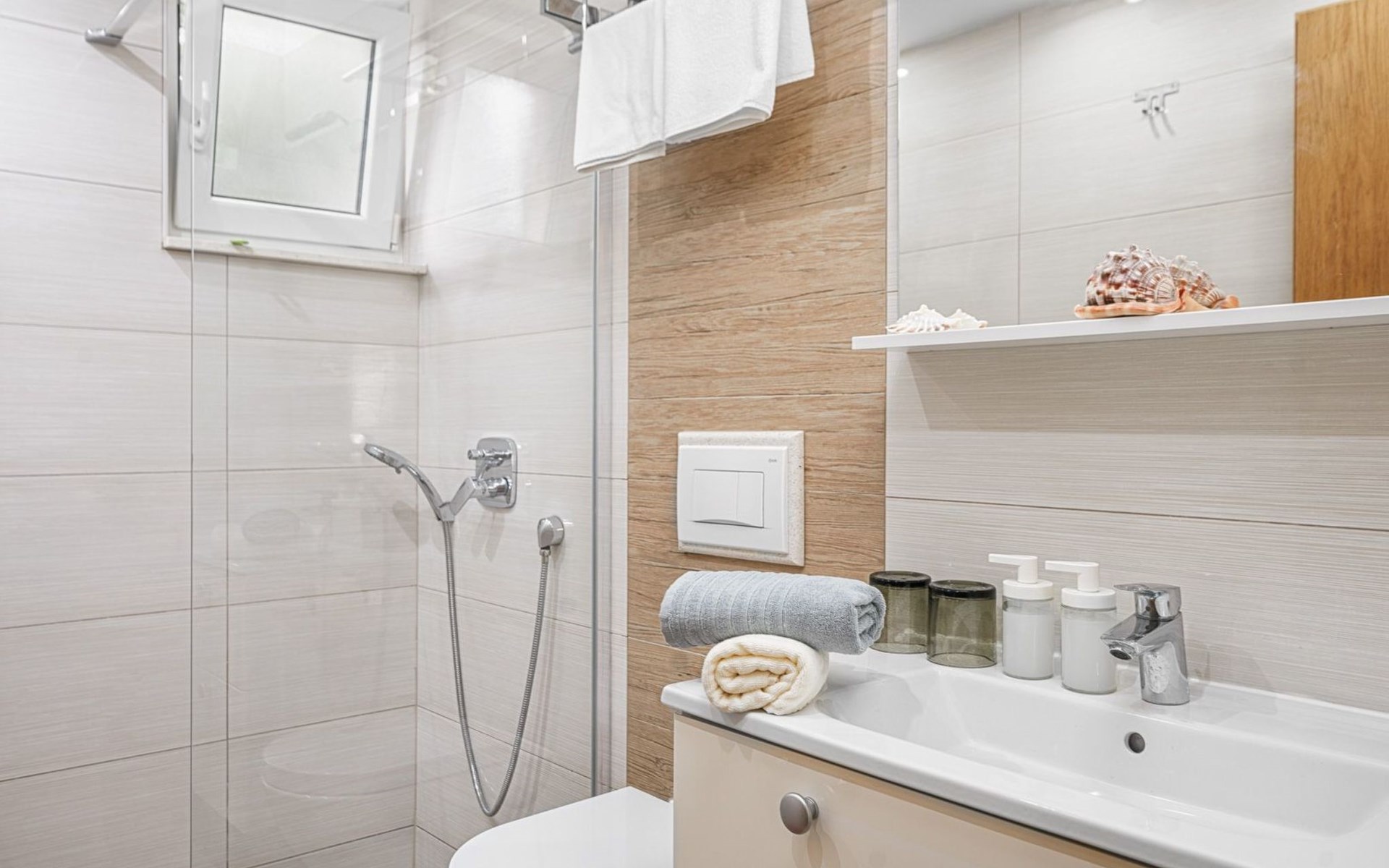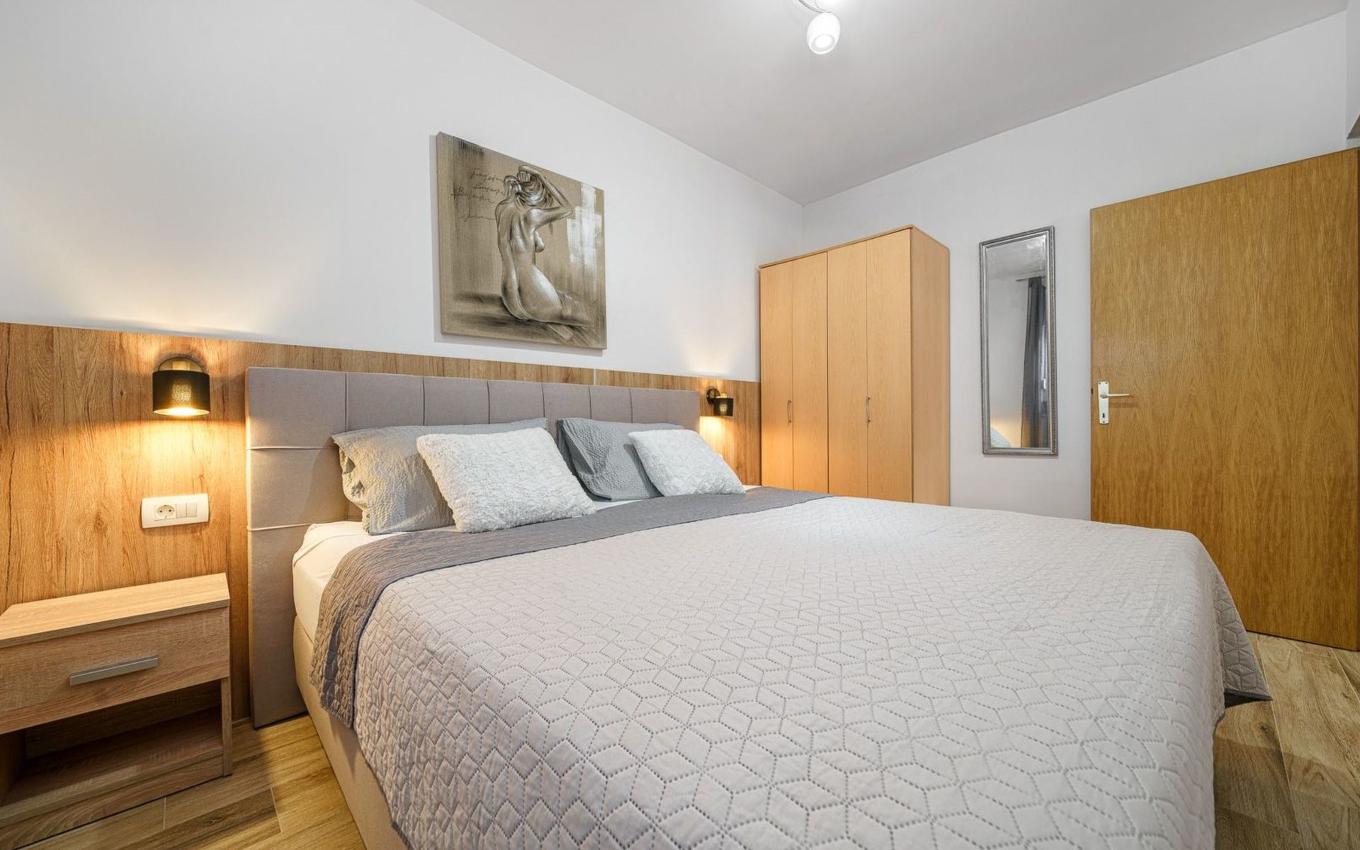 Im Inneren wartet die Wohnung mit einer modernen Ausstattung auf, die keine Wünsche offen lässt. Die klimatisierte Atmosphäre schafft auch an heißen Tagen ein angenehmes Raumklima. Zwei gemütliche Schlafzimmer mit großen Doppelbetten garantieren erholsamen Schlaf. Das großzügige Wohnzimmer mit integrierter Küche ist modern eingerichtet – hier finden Sie alles, was Sie für die Zubereitung von köstlichen Mahlzeiten benötigen: von umfangreichen Kochutensilien über einen Geschirrspüler und einen großen Kühlschrank bis hin zur Mikrowelle. Darüber hinaus gehören ein Badezimmer mit Dusche und ein separates WC zur Ausstattung der Wohnung.