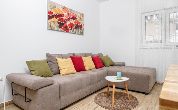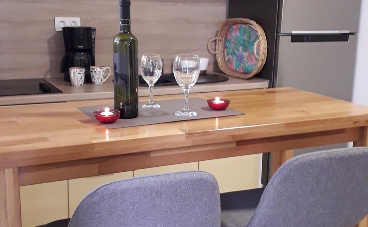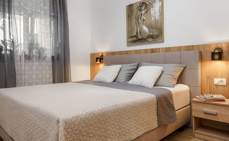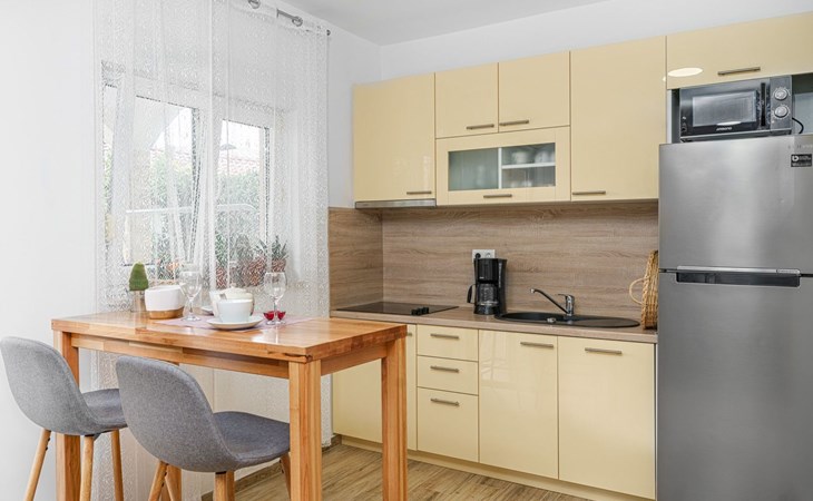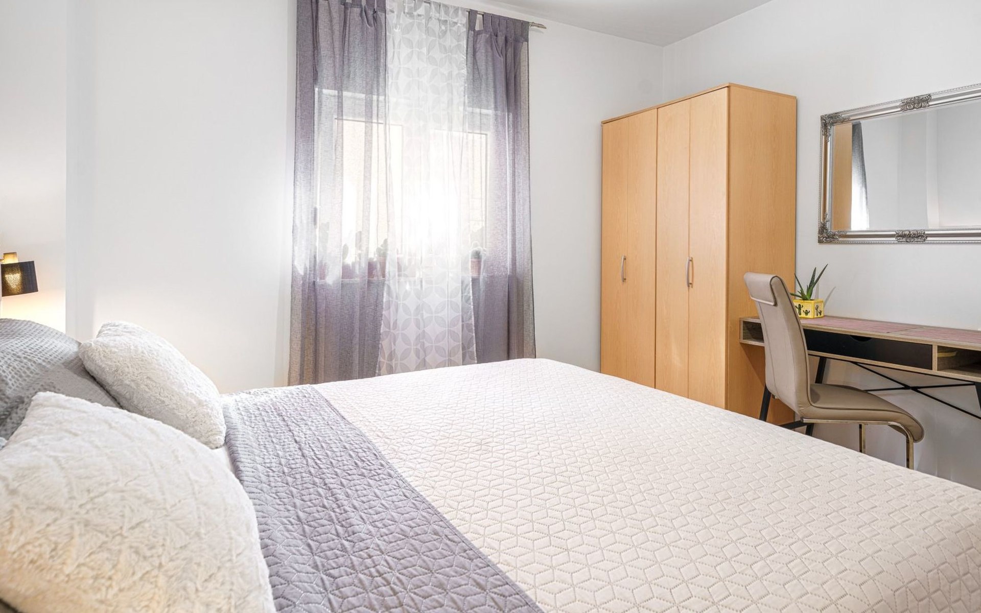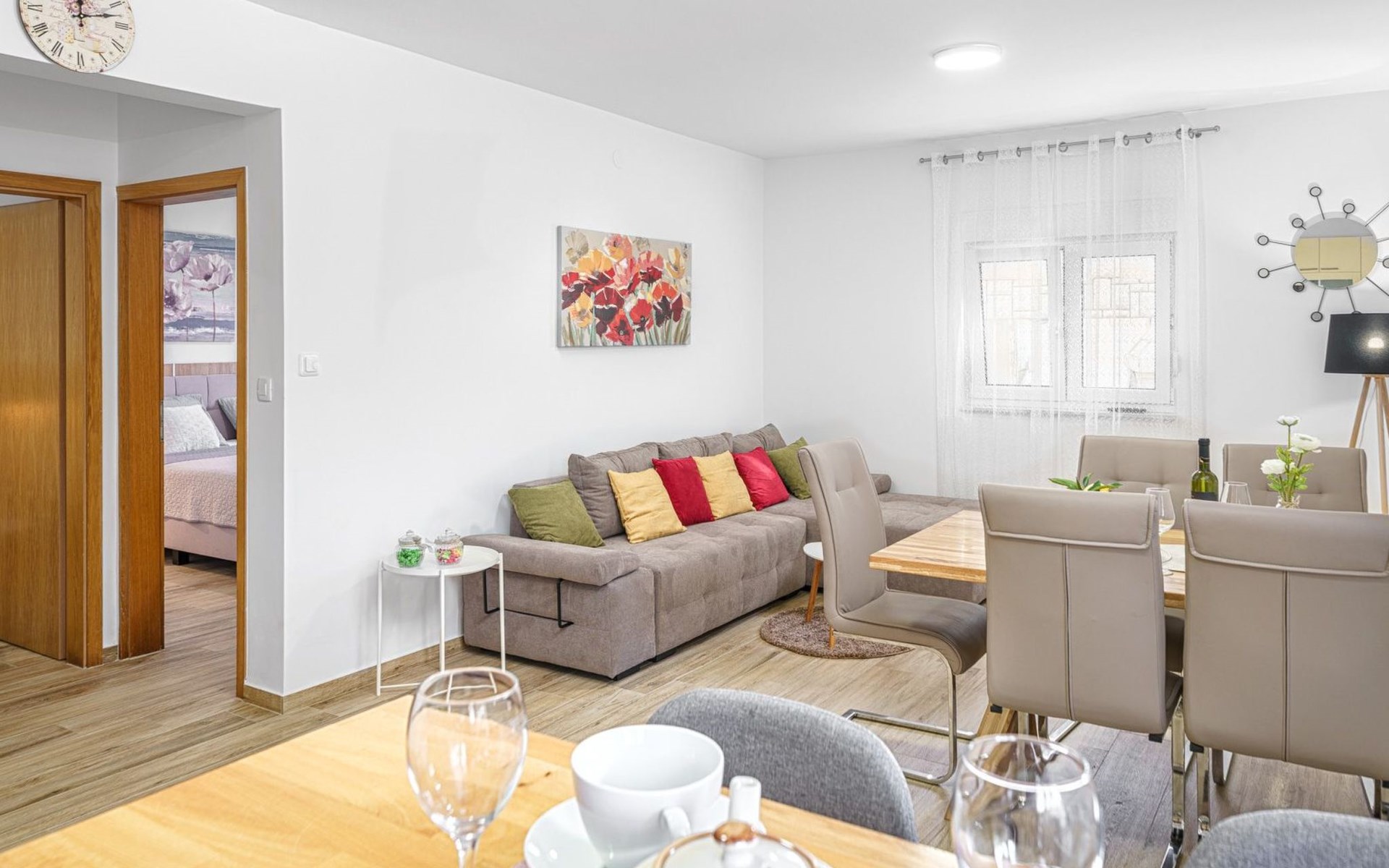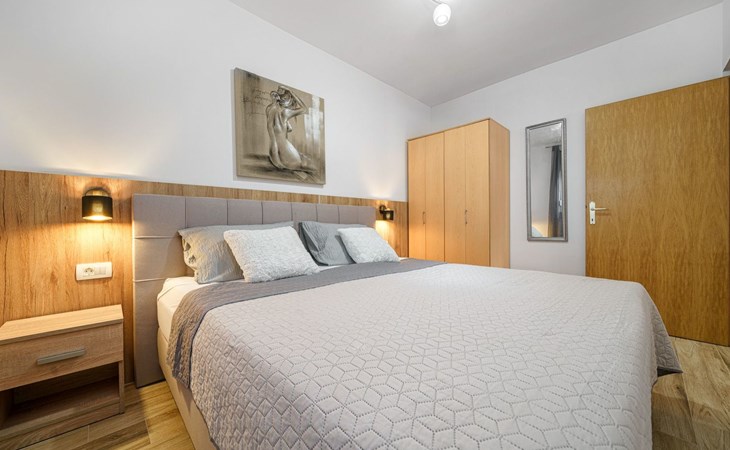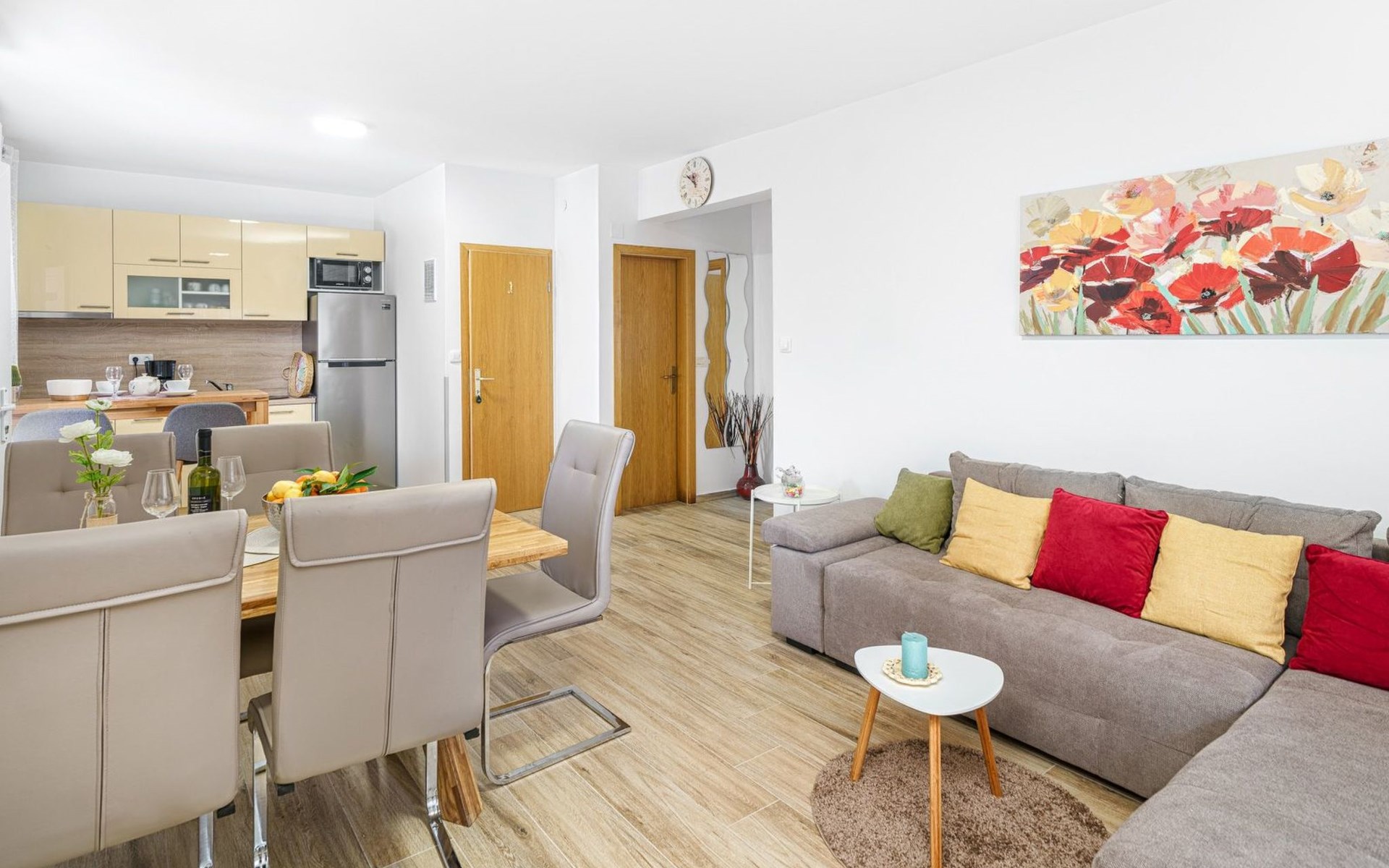 Im Inneren wartet die Wohnung mit einer modernen Ausstattung auf, die keine Wünsche offen lässt. Die klimatisierte Atmosphäre schafft auch an heißen Tagen ein angenehmes Raumklima. Zwei gemütliche Schlafzimmer mit großen Doppelbetten garantieren erholsamen Schlaf. Das großzügige Wohnzimmer mit integrierter Küche ist modern eingerichtet – hier finden Sie alles, was Sie für die Zubereitung von köstlichen Mahlzeiten benötigen: von umfangreichen Kochutensilien über einen Geschirrspüler und einen großen Kühlschrank bis hin zur Mikrowelle. Darüber hinaus gehören ein Badezimmer mit Dusche und ein separates WC zur Ausstattung der Wohnung.