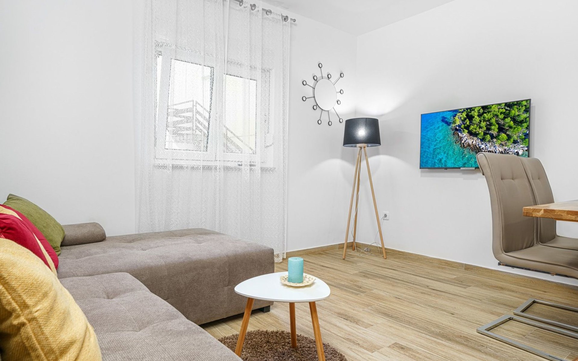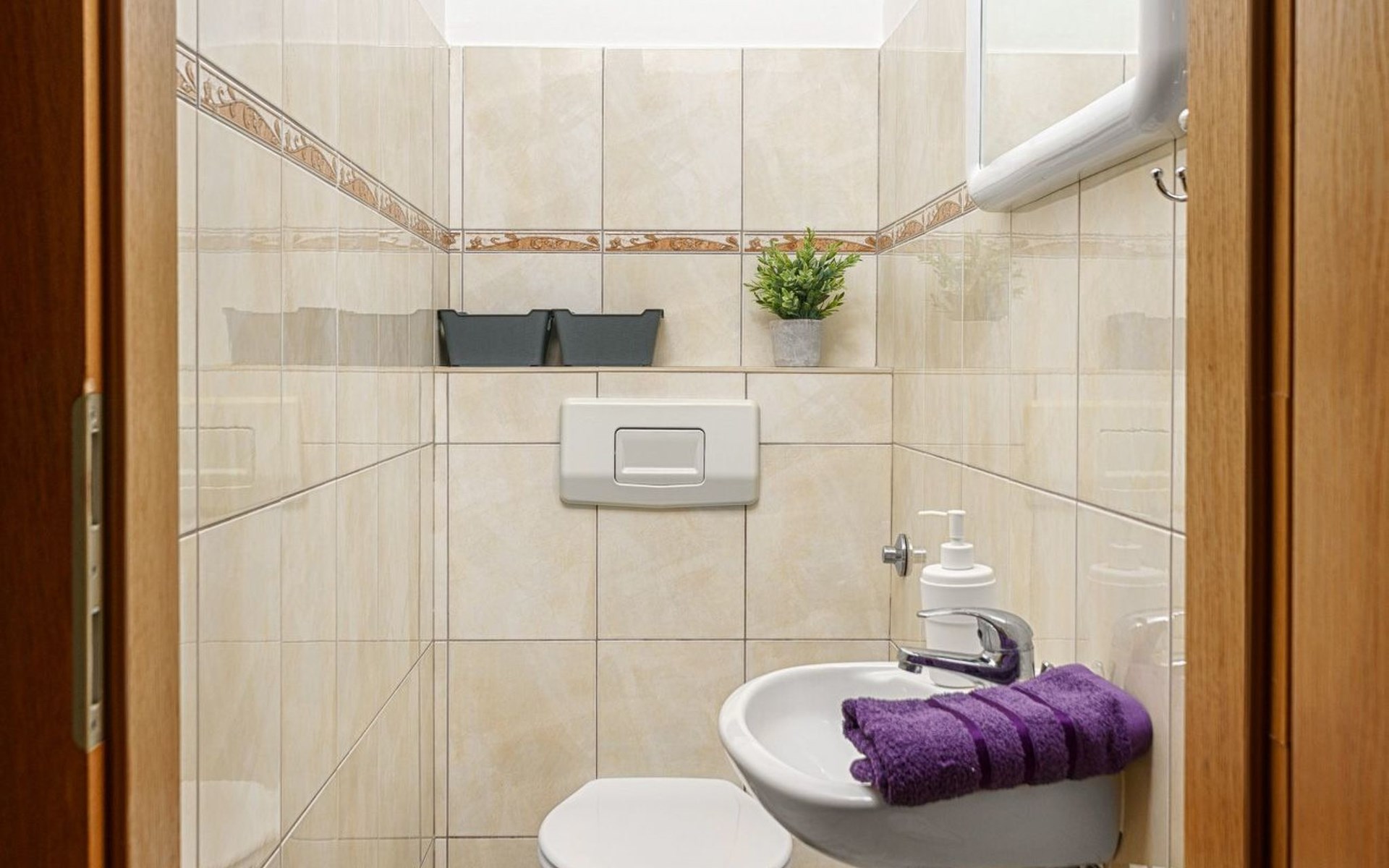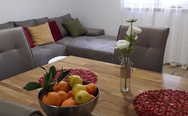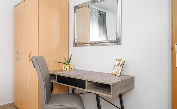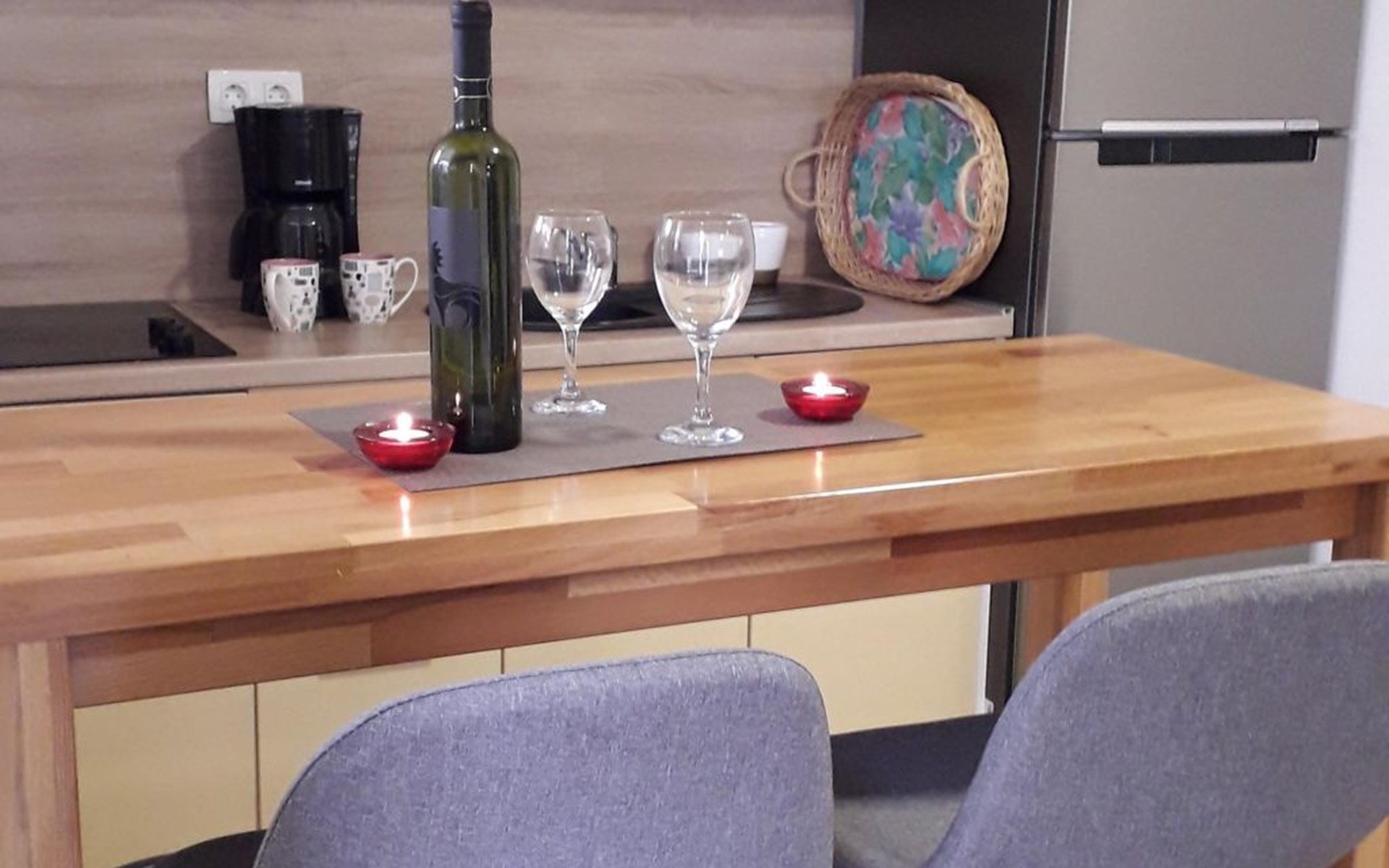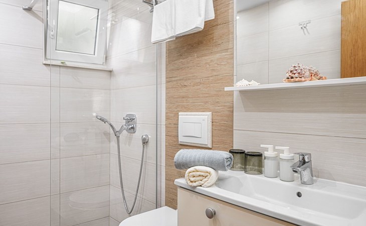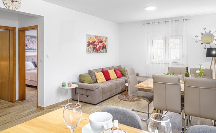 Im Inneren wartet die Wohnung mit einer modernen Ausstattung auf, die keine Wünsche offen lässt. Die klimatisierte Atmosphäre schafft auch an heißen Tagen ein angenehmes Raumklima. Zwei gemütliche Schlafzimmer mit großen Doppelbetten garantieren erholsamen Schlaf. Das großzügige Wohnzimmer mit integrierter Küche ist modern eingerichtet – hier finden Sie alles, was Sie für die Zubereitung von köstlichen Mahlzeiten benötigen: von umfangreichen Kochutensilien über einen Geschirrspüler und einen großen Kühlschrank bis hin zur Mikrowelle. Darüber hinaus gehören ein Badezimmer mit Dusche und ein separates WC zur Ausstattung der Wohnung.