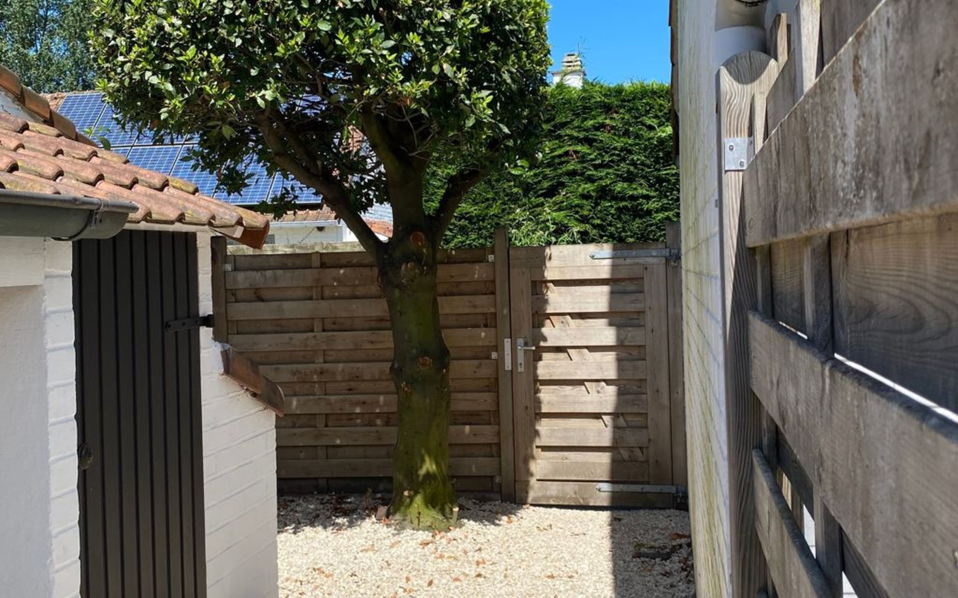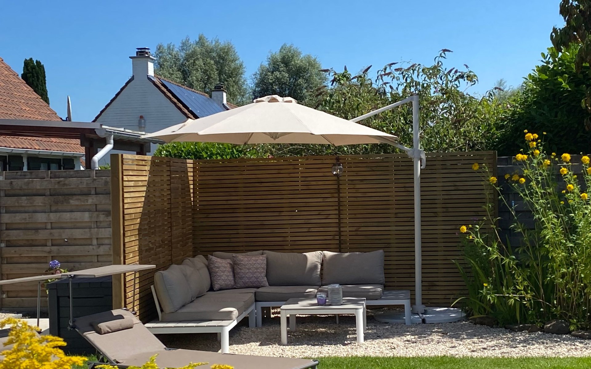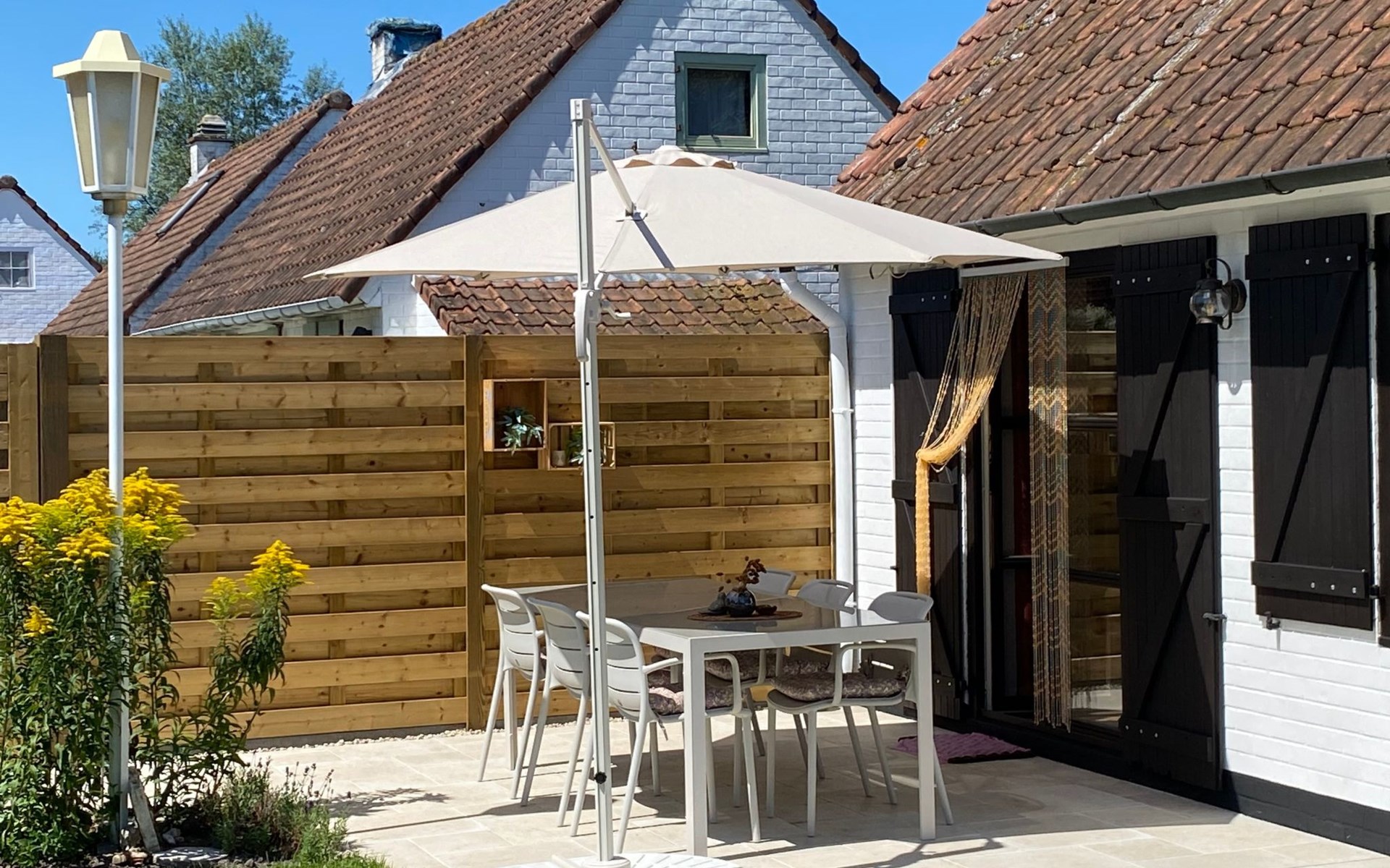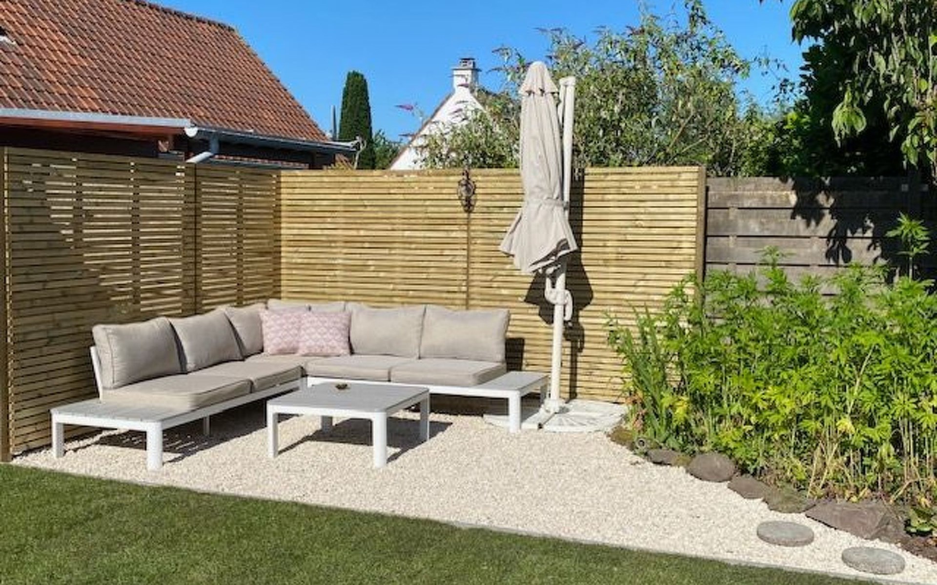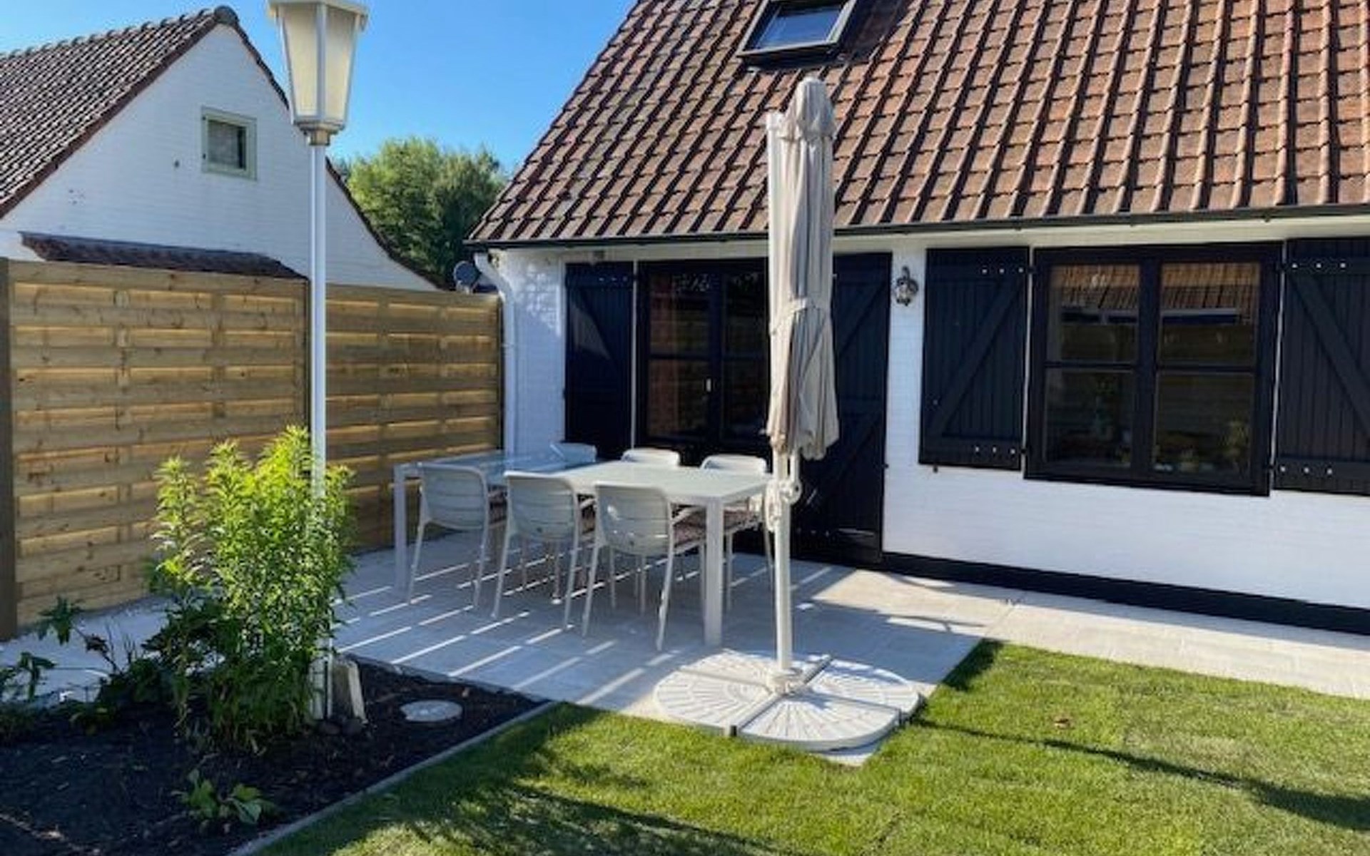 Der Außenbereich von Zonnewind wird Sie zweifelsohne beeindrucken. Der nach Süden ausgerichtete Garten verfügt über eine geräumige Terrasse mit Möbeln und Sonnenschirm, ideal für entspannte Momente und gemütliche Abende. Mit stimmungsvoller Beleuchtung und einem Grill ist sie der perfekte Ort für Erholung und Unterhaltung. Sicherheit und Bequemlichkeit sind durch ein Tor mit direktem Zugang zum Parkplatz garantiert, so dass Sie Ihre Einkäufe mühelos ausladen können.