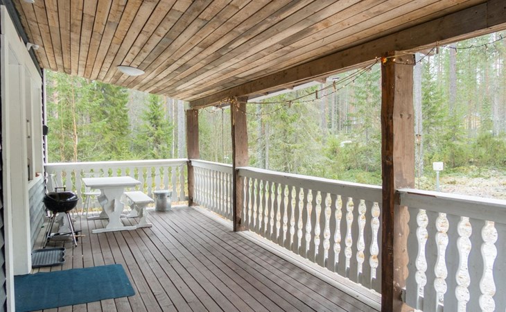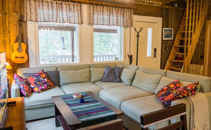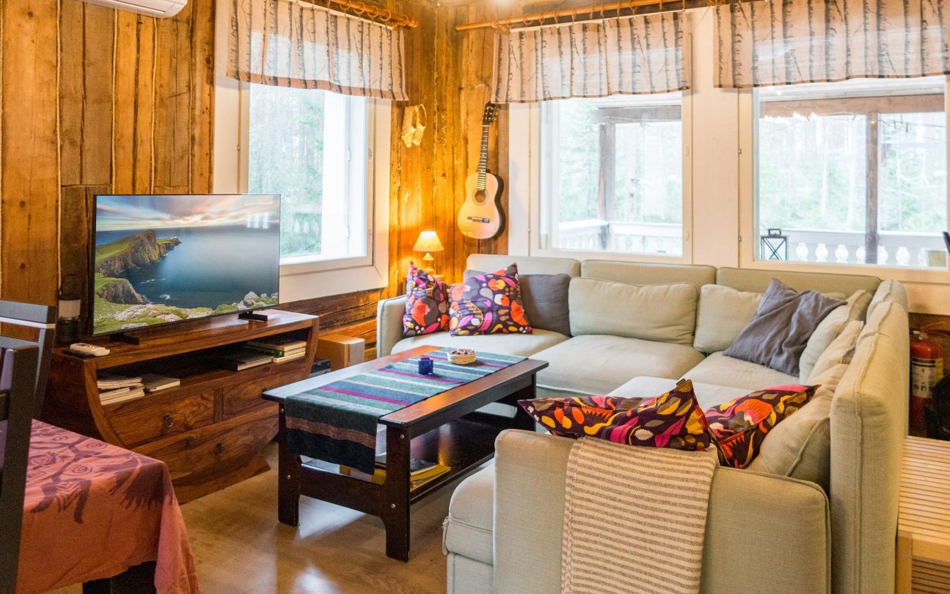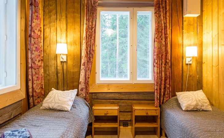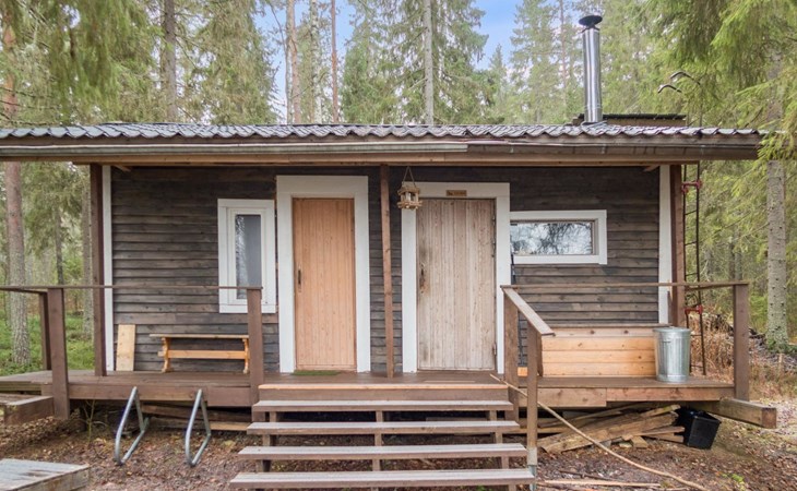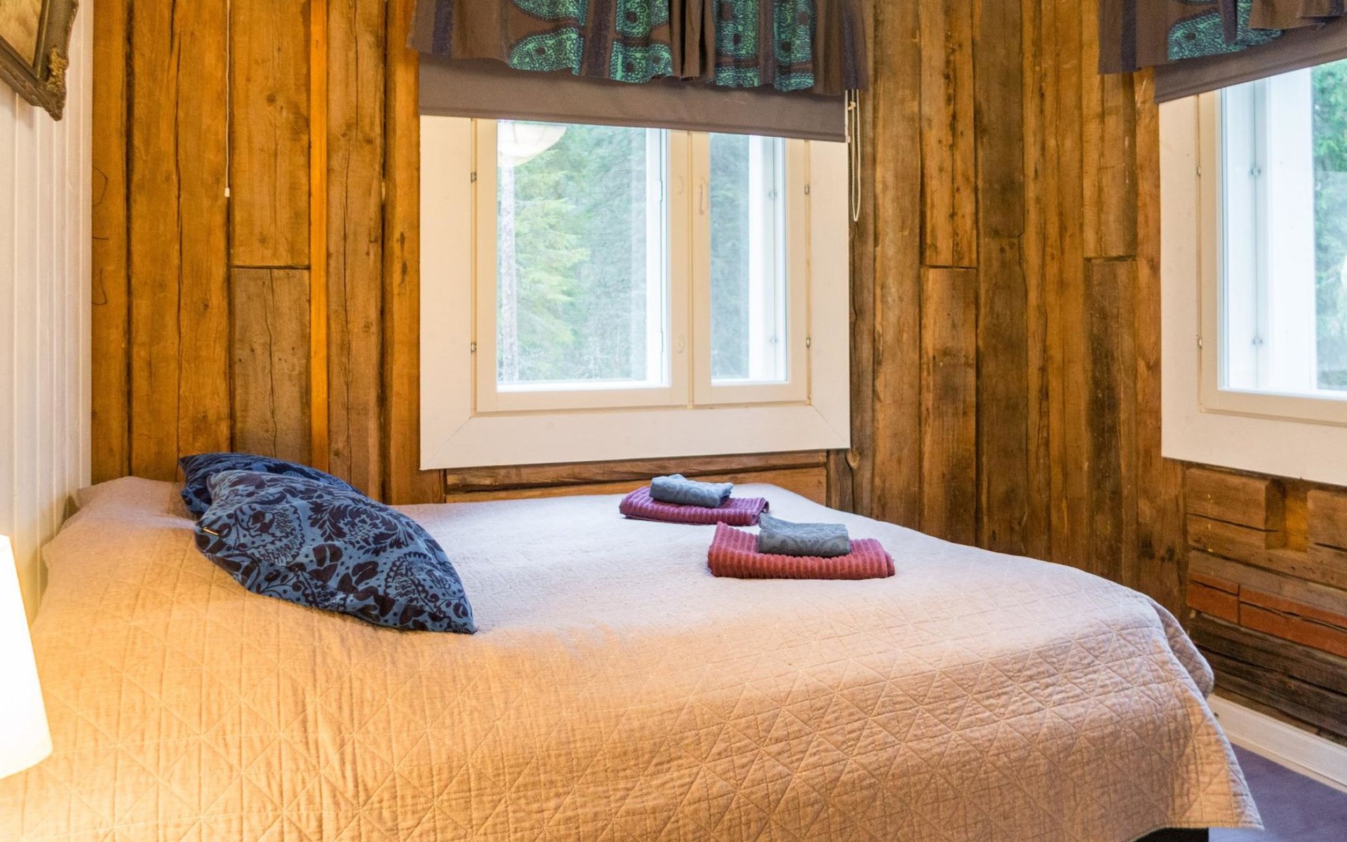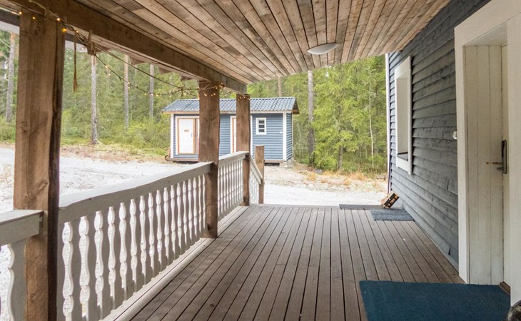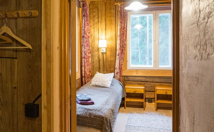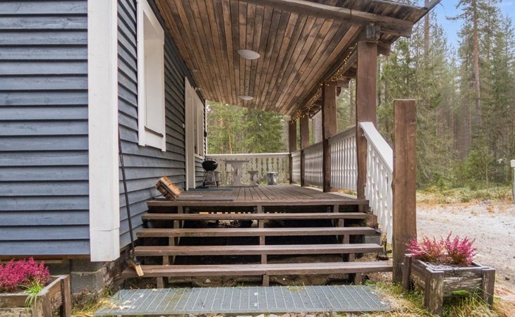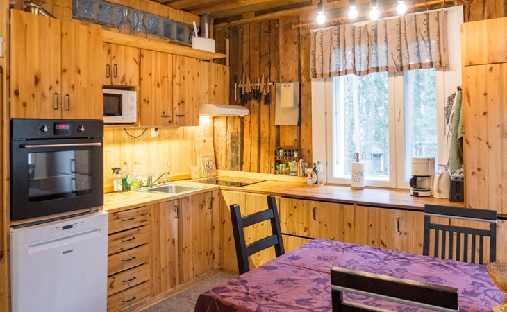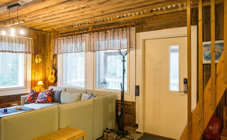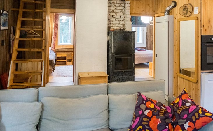 In an atmospheric cottage´s living area 75 m² on two floors. Downstairs, a spacious living room kitchen, dining set for 6-8, two bedrooms, one with a double bed and the other with separate beds for 2. Small washroom with shower, toilet and washing machine. Steep stairs to the upper floor, sofa in the hall for 1-2 guests, double bed in the bedroom. One room upstairs is not available to visiters. Covered spacious porch with furniture.