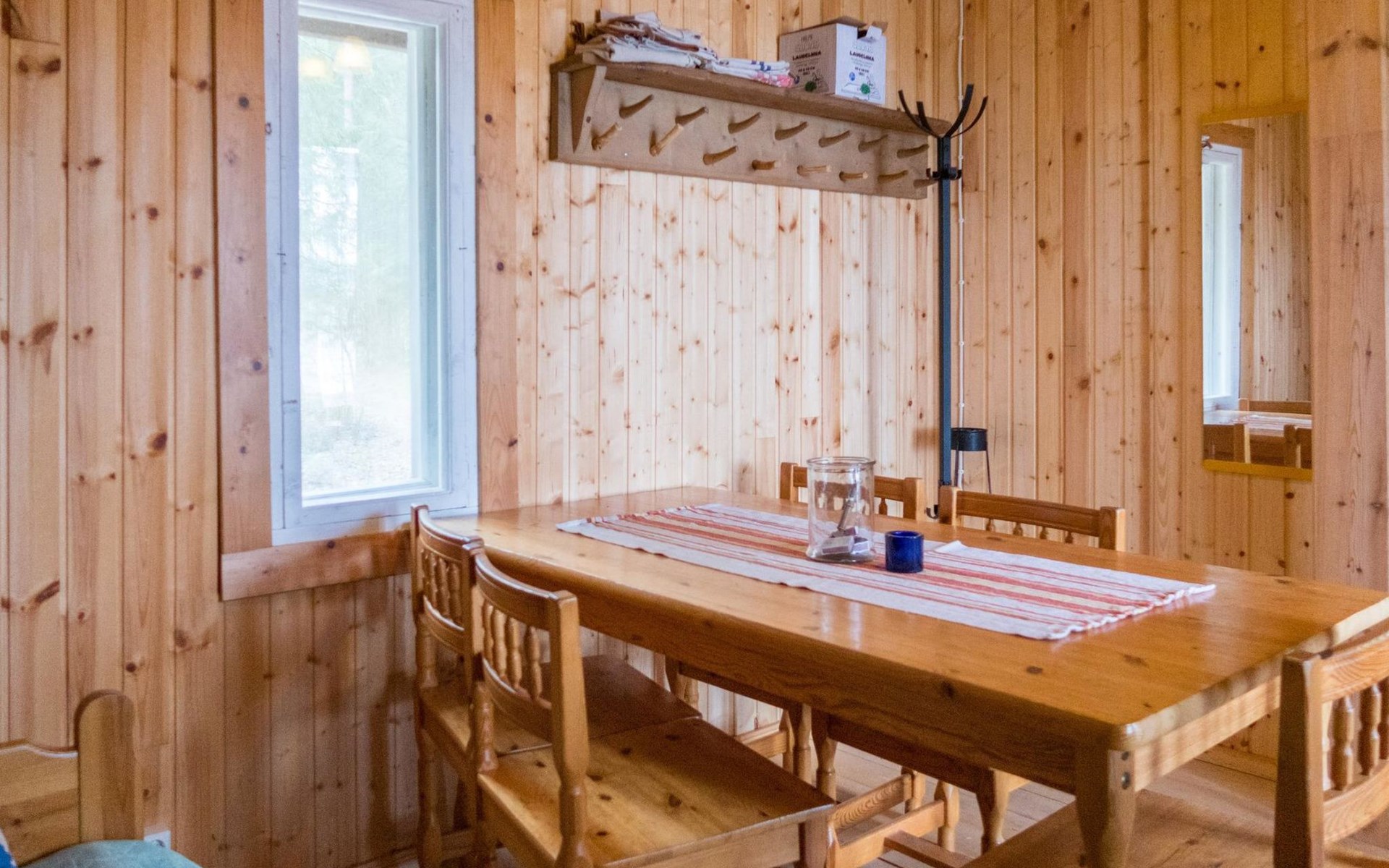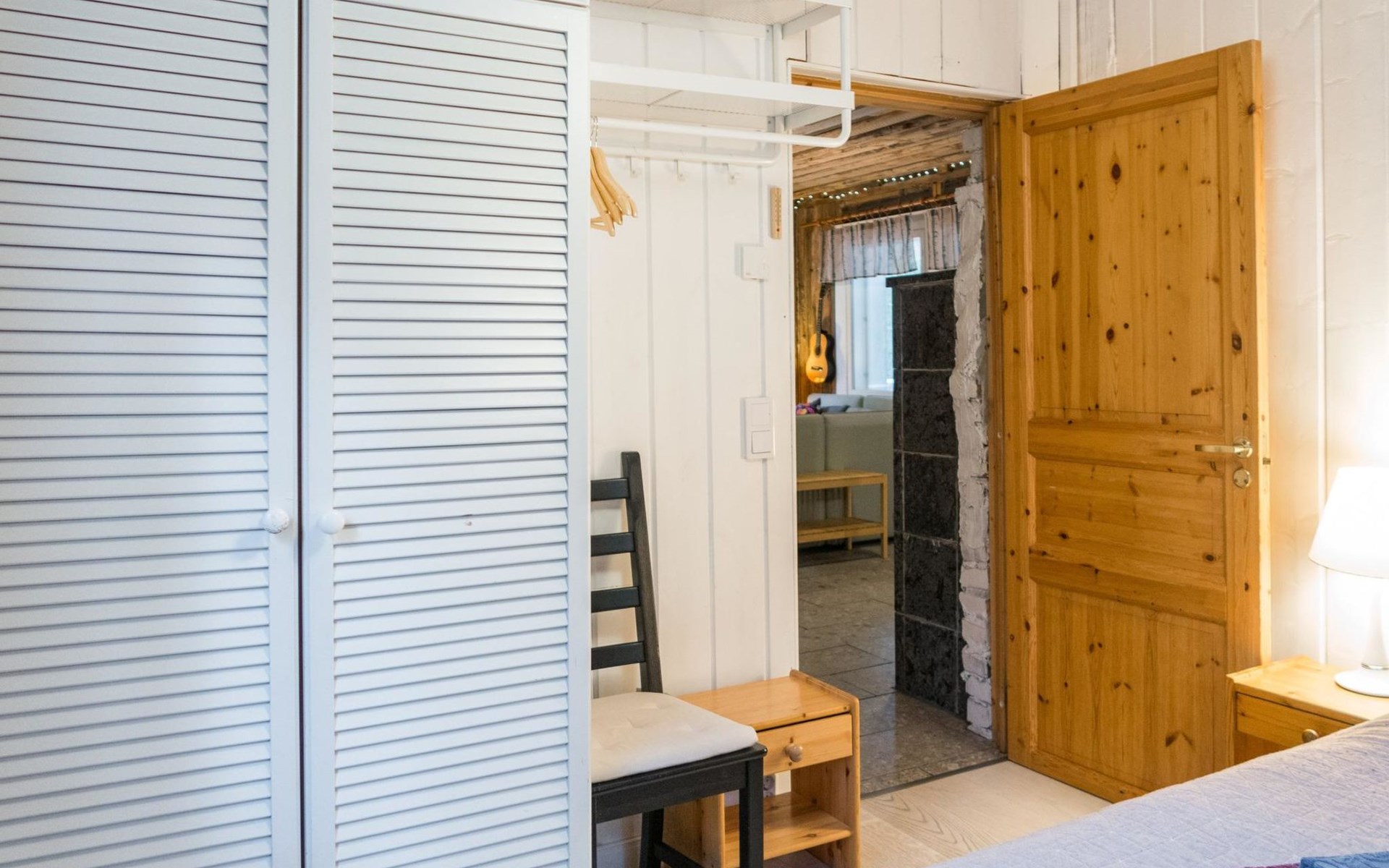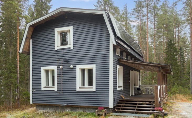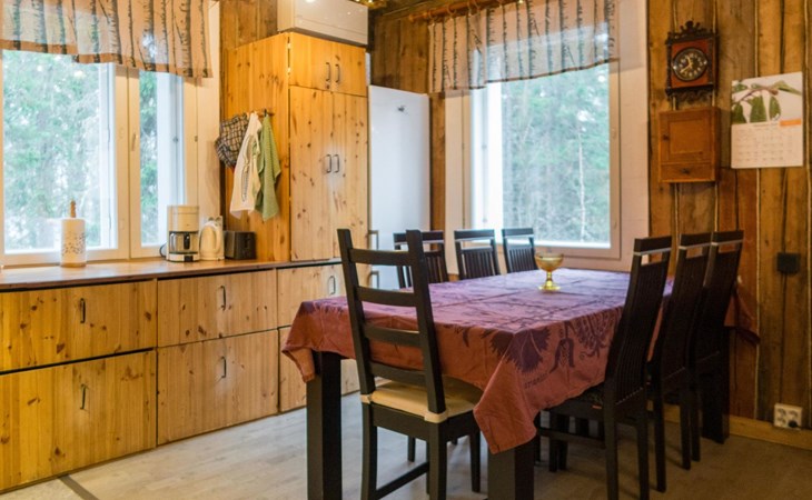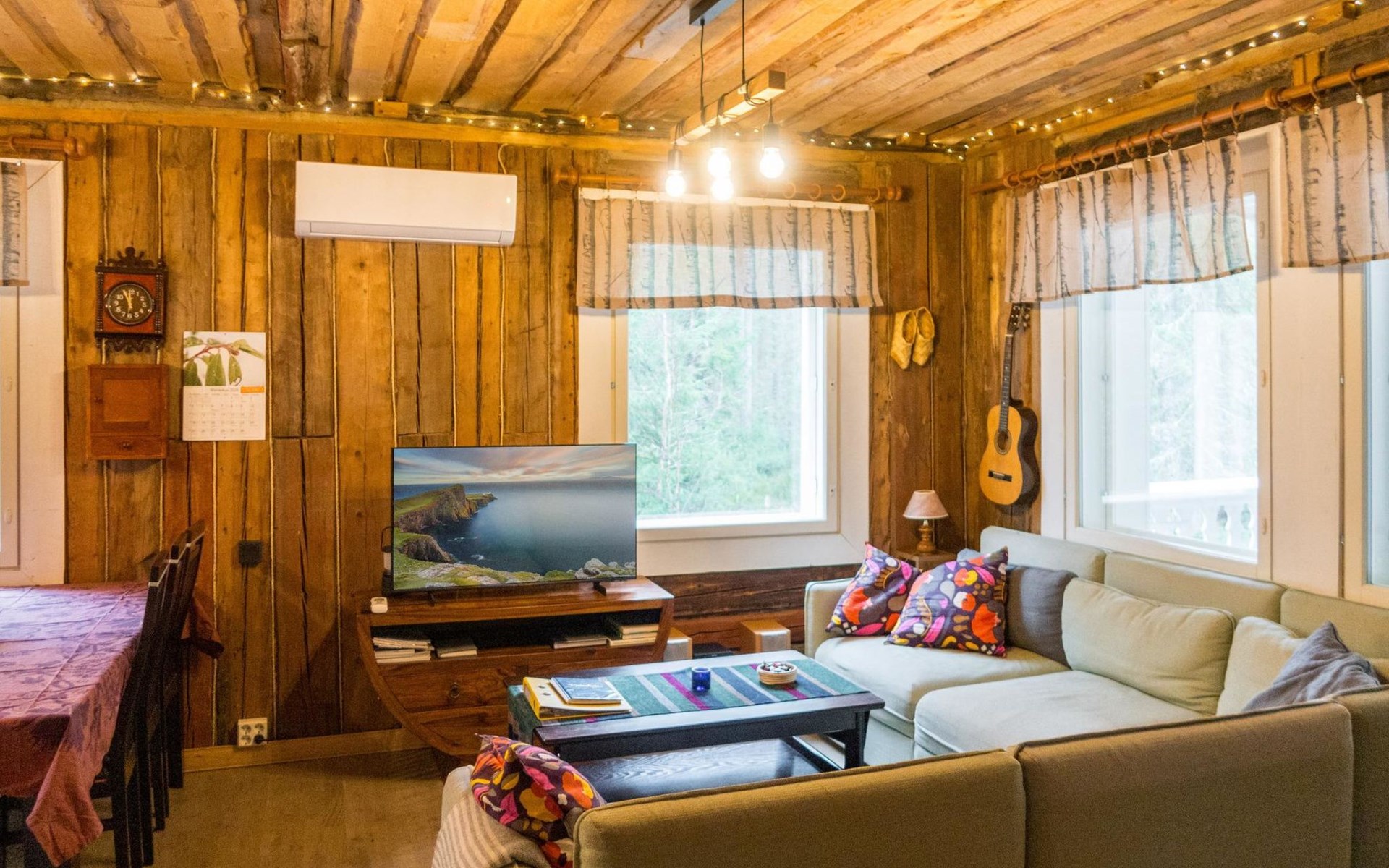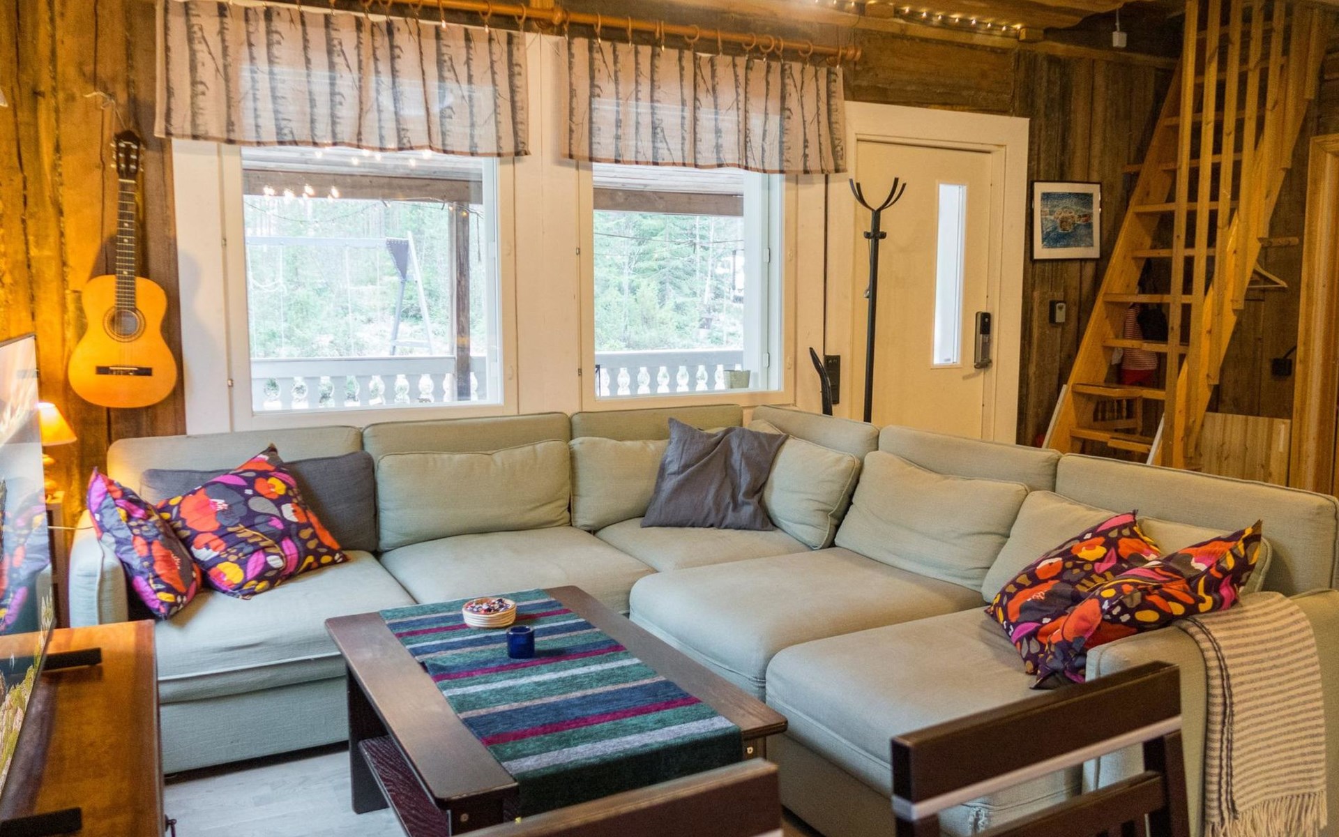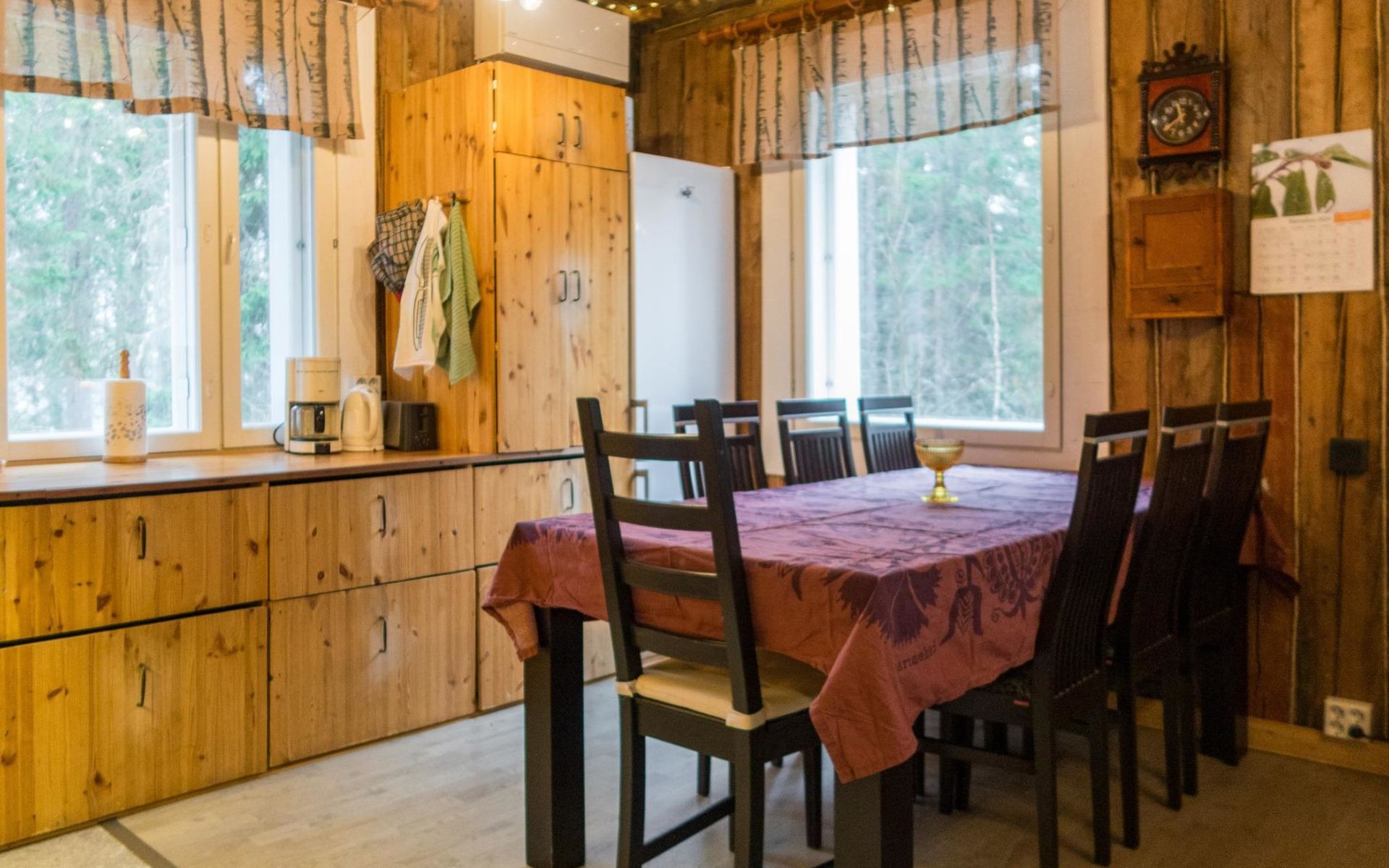 In an atmospheric cottage´s living area 75 m² on two floors. Downstairs, a spacious living room kitchen, dining set for 6-8, two bedrooms, one with a double bed and the other with separate beds for 2. Small washroom with shower, toilet and washing machine. Steep stairs to the upper floor, sofa in the hall for 1-2 guests, double bed in the bedroom. One room upstairs is not available to visiters. Covered spacious porch with furniture.