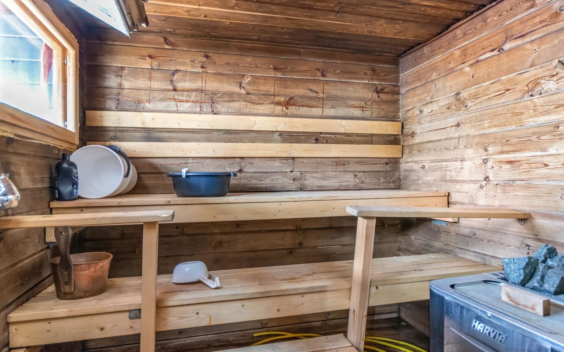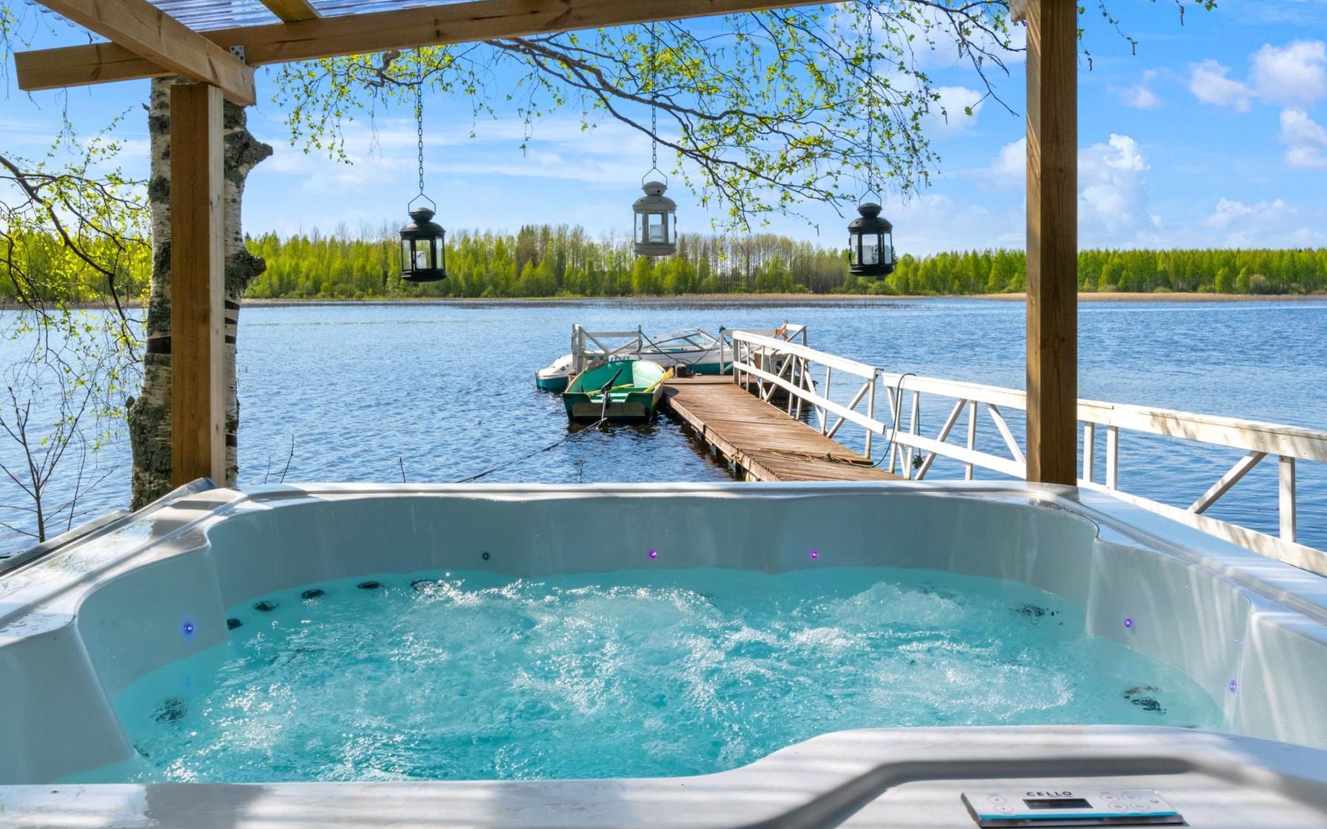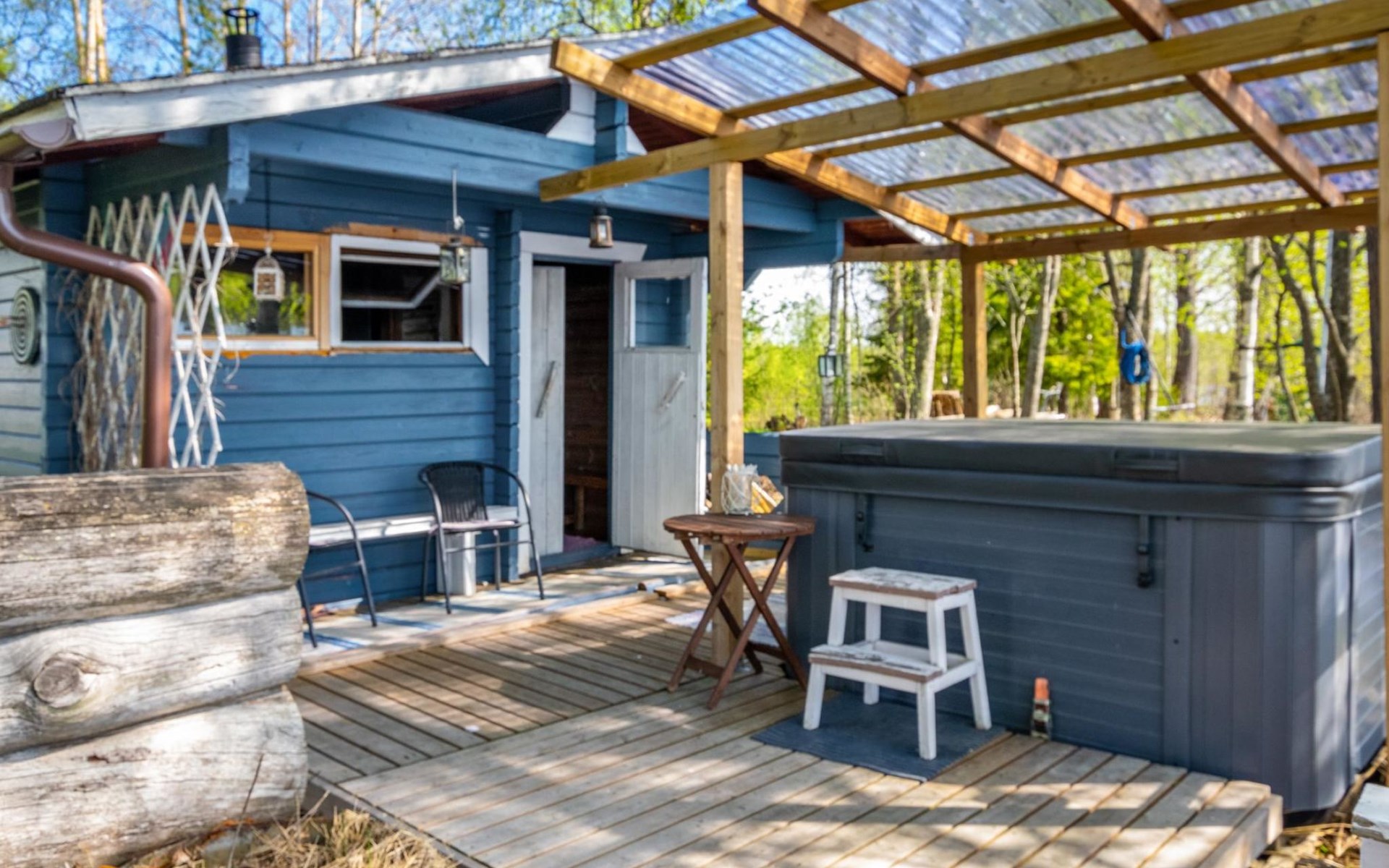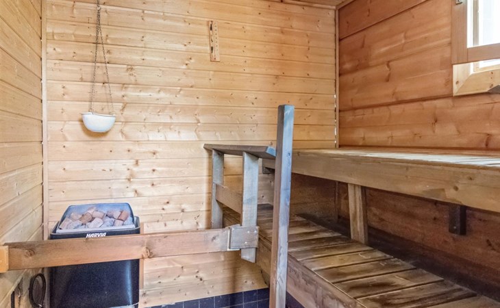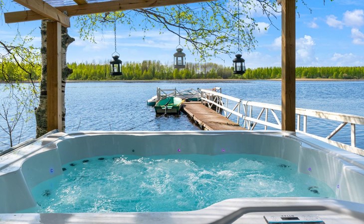 Summer kitchen with garden furniture, kettle grill and gas-heated grill pan. Separate lakeside sauna (dressing room and sauna room with wood burning sauna stove), hydro massage bath in front of the sauna building, Note hydro massage bath for the period 1.4.-31.10, note the hydro massage bath is not available during the winter months.