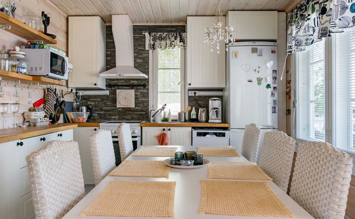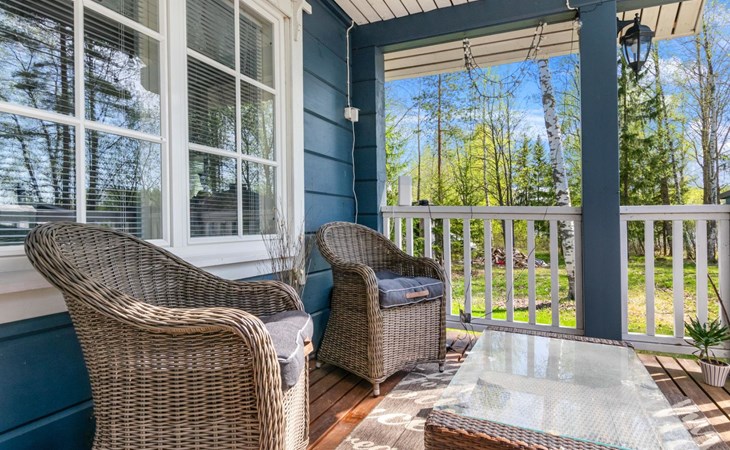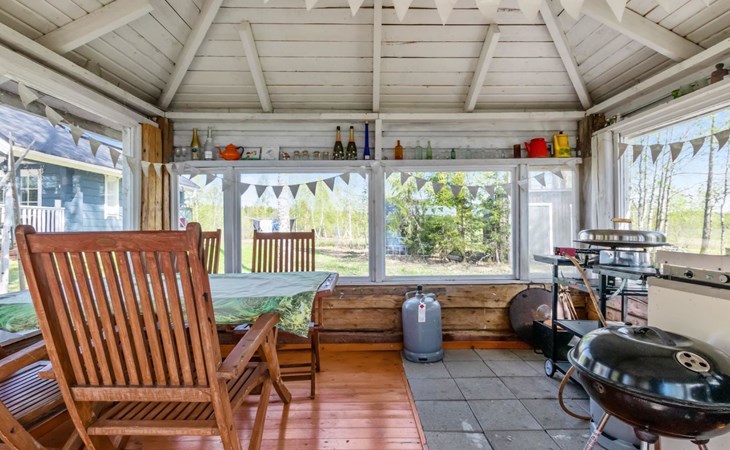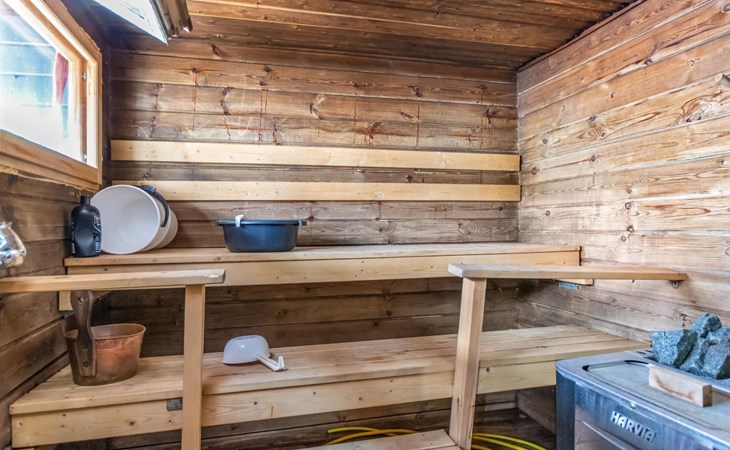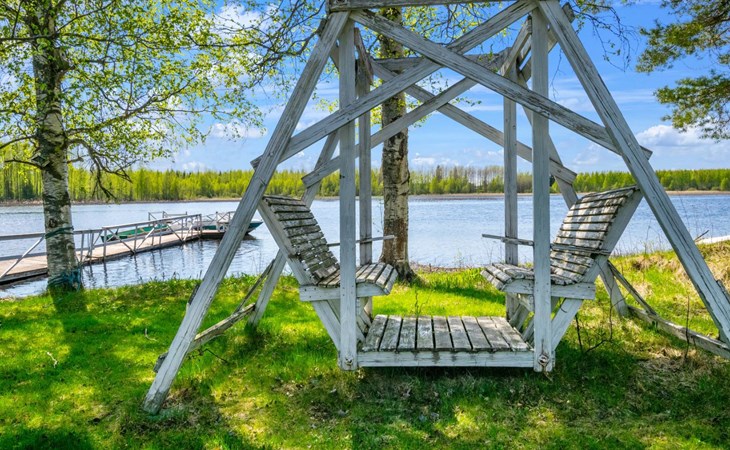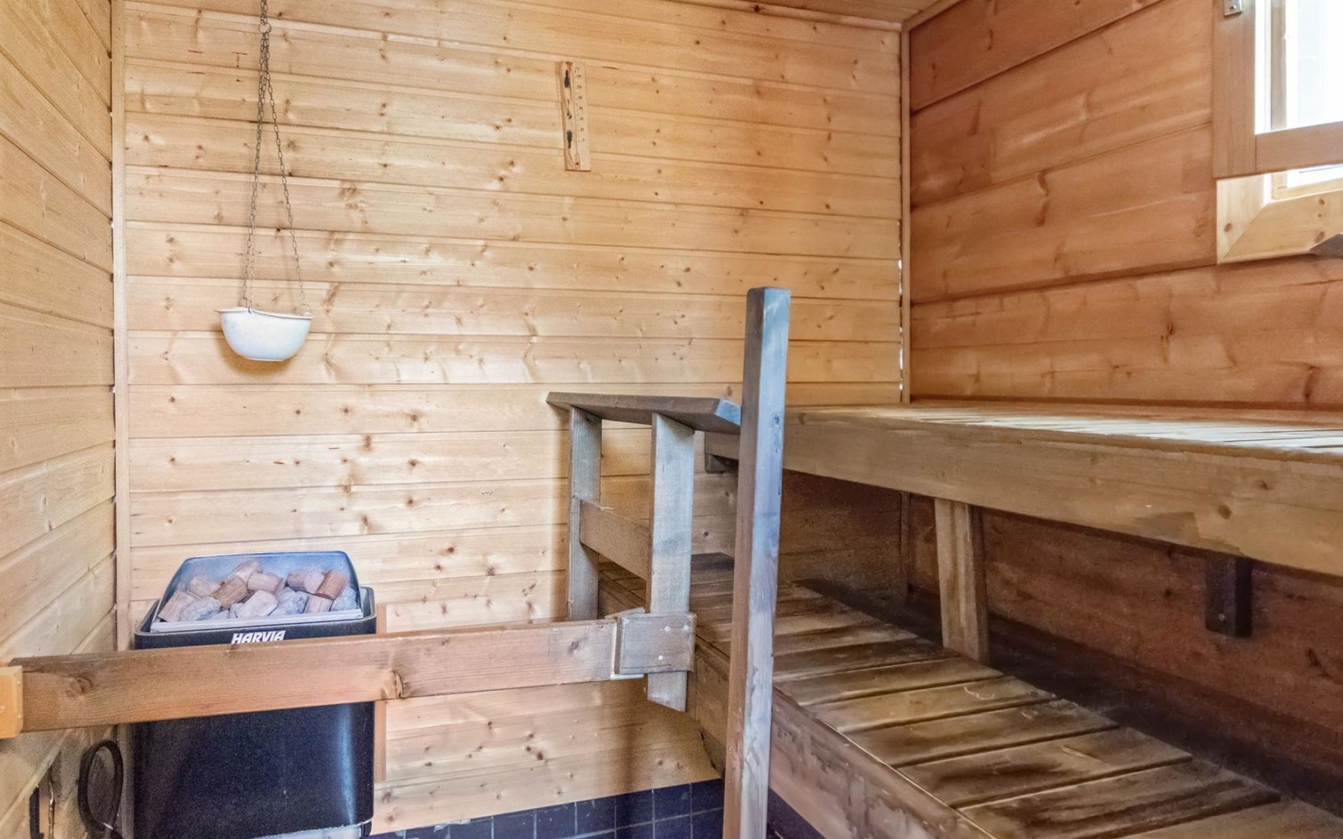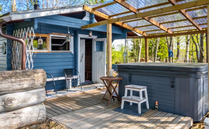 Summer kitchen with garden furniture, kettle grill and gas-heated grill pan. Separate lakeside sauna (dressing room and sauna room with wood burning sauna stove), hydro massage bath in front of the sauna building, Note hydro massage bath for the period 1.4.-31.10, note the hydro massage bath is not available during the winter months.