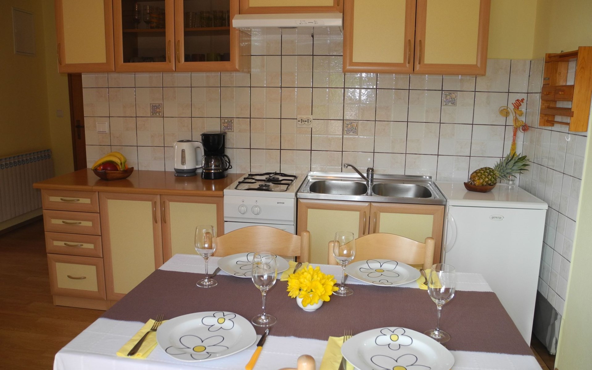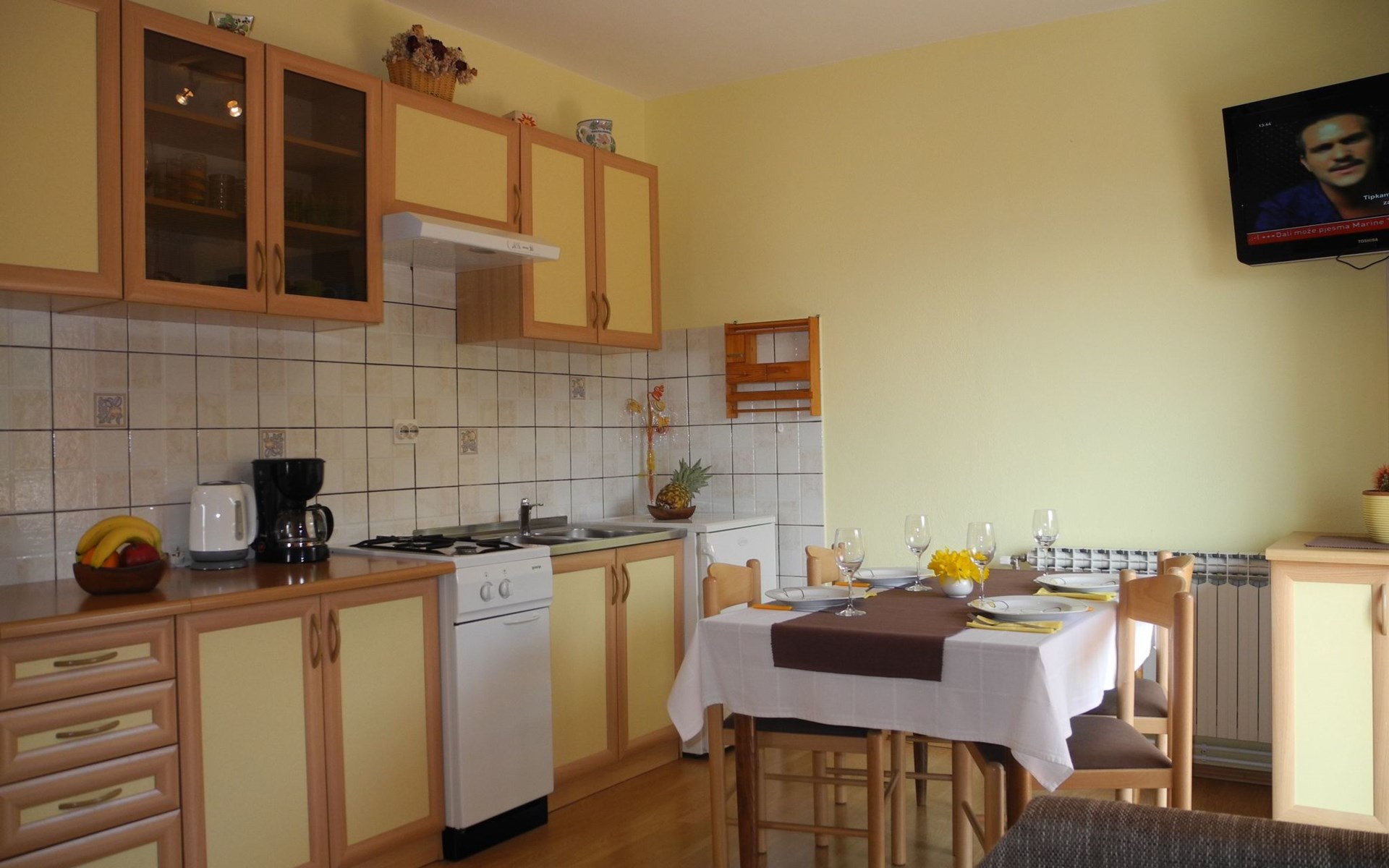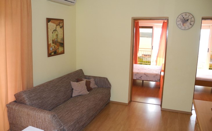 Das Innere der Wohnung ist einladend und verspricht einen gemütlichen Aufenthalt. Mit zwei gemütlichen Schlafzimmern, einer Küche und einem Essbereich kann sich jeder nach einem Tag voller Entdeckungen bequem erholen. Die Wohnung ist mit praktischen Annehmlichkeiten wie TV, Klimaanlage und Internetzugang ausgestattet, die einen erholsamen und bequemen Urlaub garantieren. Die Küche mit 2-Platten-Herd, Kaffeemaschine und Wasserkocher lädt zum gemeinsamen Zubereiten und Genießen von Mahlzeiten ein, so dass man sich wie zu Hause fühlt.