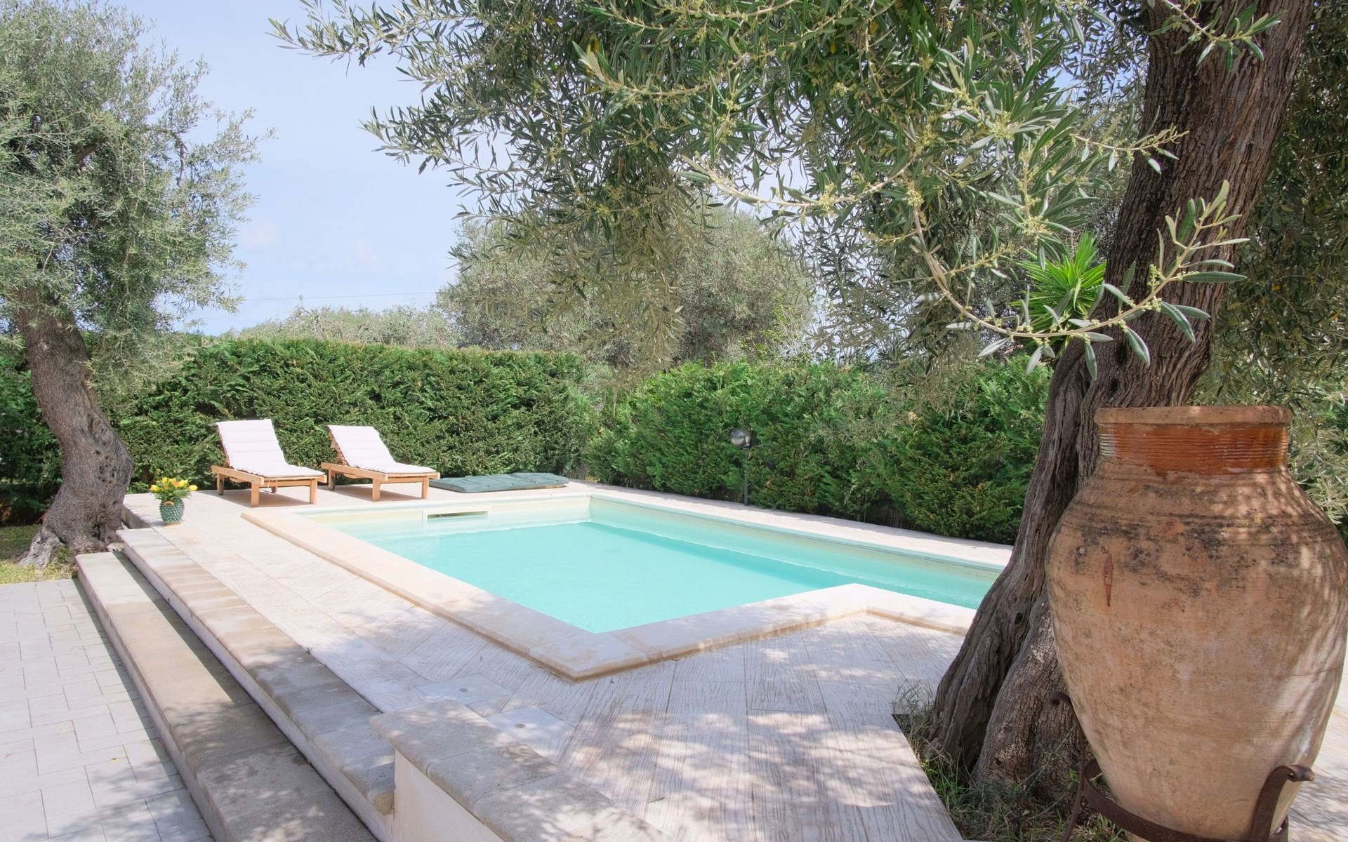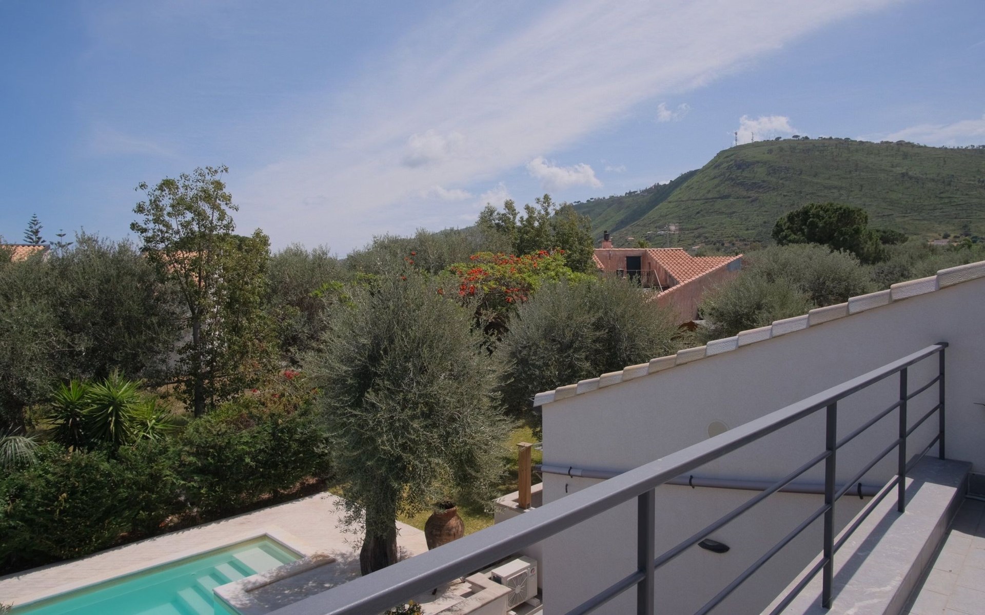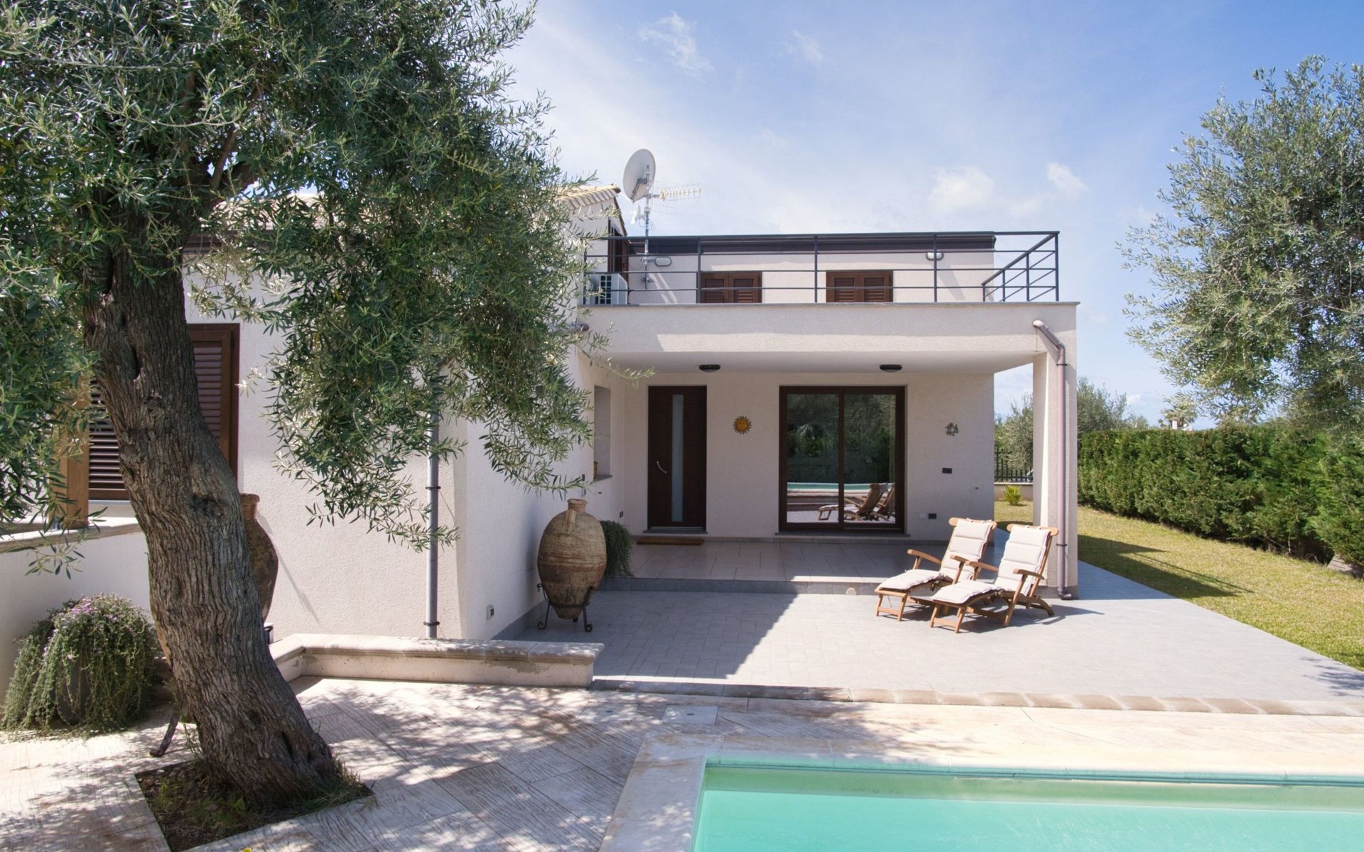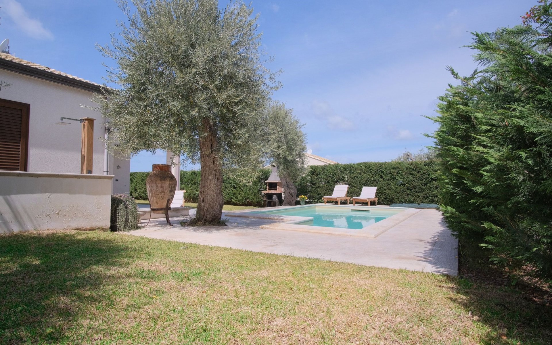 Im Außenbereich erweist sich die Villa als kleines Paradies. Der private Swimmingpool lädt zu einem erfrischenden Bad ein, während der große Garten zur alleinigen Nutzung den idealen Platz zum Entspannen in der Sonne oder zum Genießen von Mahlzeiten im Freien bietet. Die Terrasse, einschließlich der exklusiv nutzbaren Dachterrasse, ist der perfekte Ort, um sich zu entspannen und zu unterhalten, vielleicht nach einer erfrischenden Dusche im Freien. Diese gepflegten Außenbereiche sind ideal, um die frische Luft und das milde sizilianische Klima zu genießen.