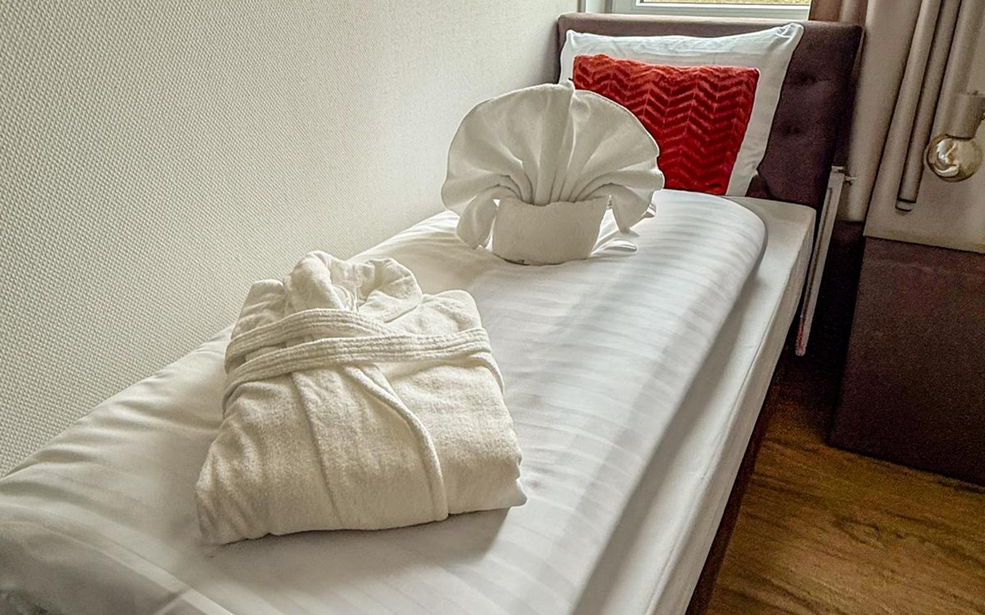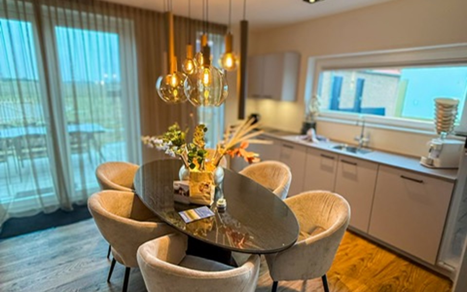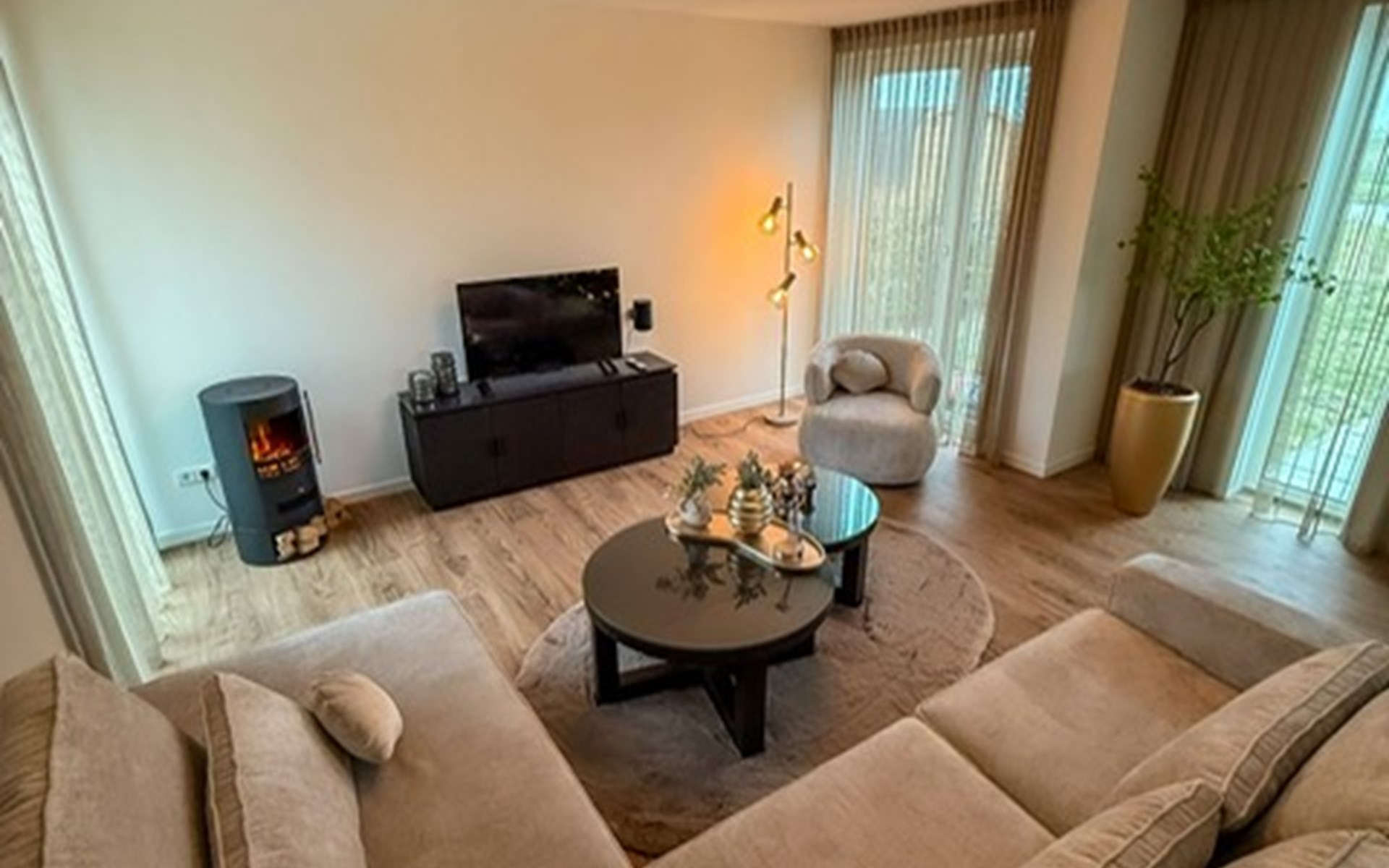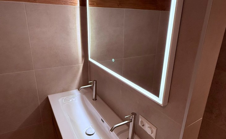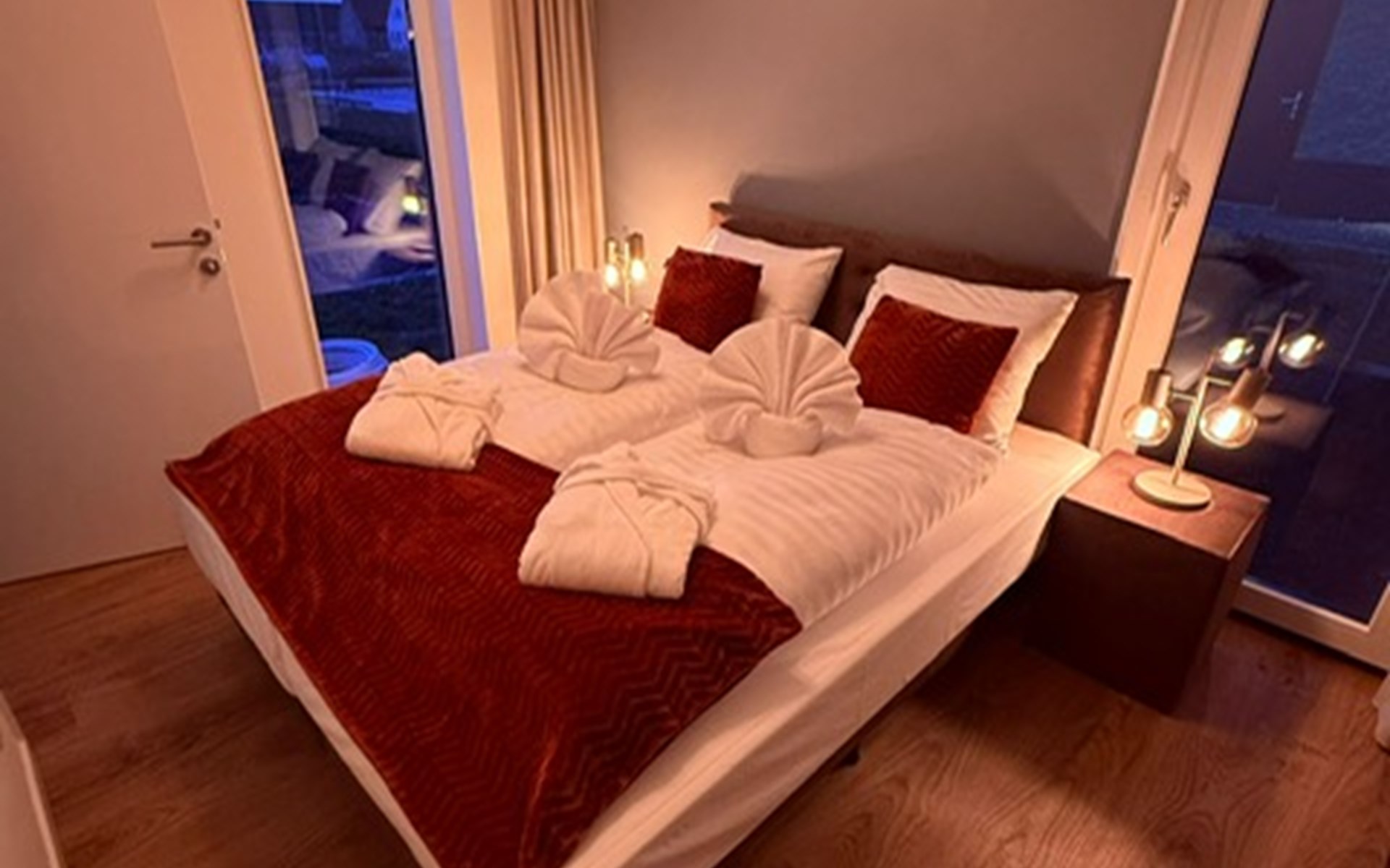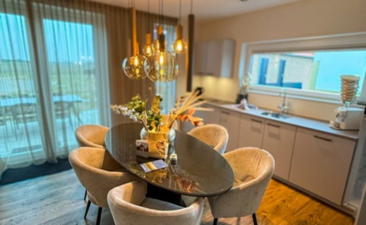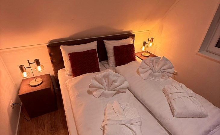 Im Inneren erwartet dich ein stilvoller Wohnbereich mit Flatscreen-TV, eine moderne Küche mit Kombi-Ofen, Geschirrspüler und Kaffeemaschine, sowie zwei Schlafzimmer mit hochwertigen Boxspringbetten. Der private Wellnessbereich ist ein echtes Highlight: Whirlpool, Sunshower, Regendusche mit Nebelfunktion und finnische Sauna sorgen für intensive Erholung. Die Unterkunft ist zudem rollstuhlfreundlich.