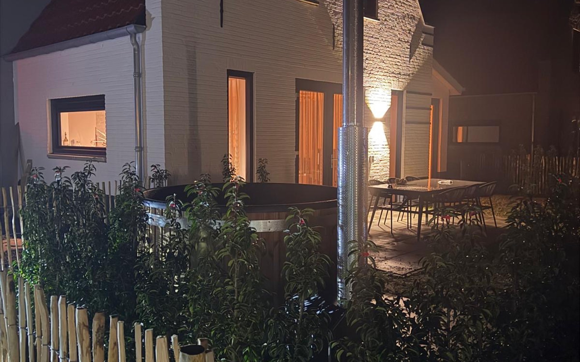 Im Außenbereich genießt du die Natur auf der Terrasse mit Gartenmöbeln, eine Außendusche mit warm/kalt Wasser und eine romantische, holzbeheizte Hottub. Ein Ort, an dem nichts muss – und alles mag.