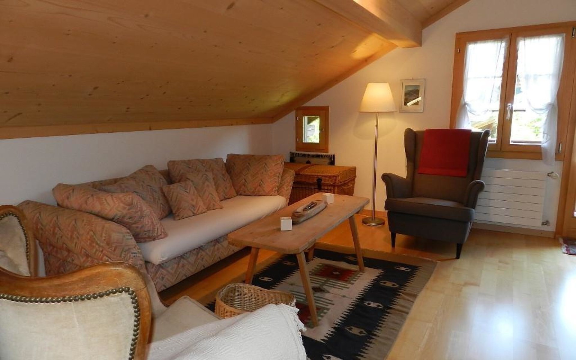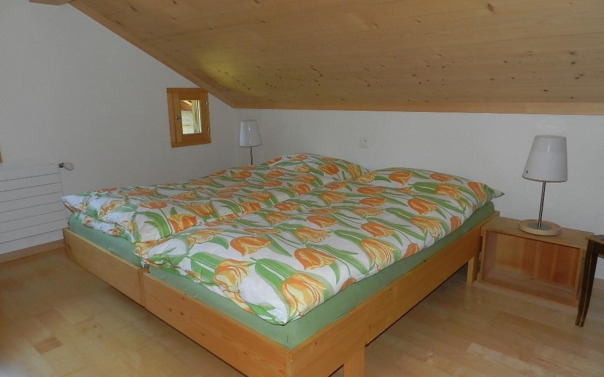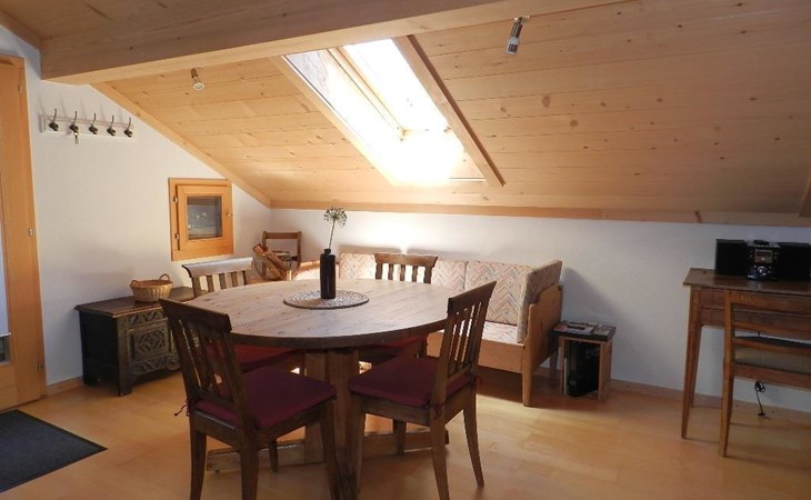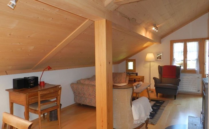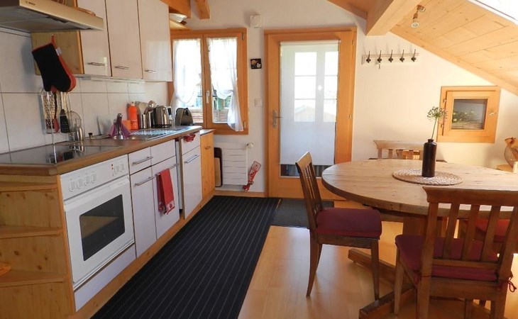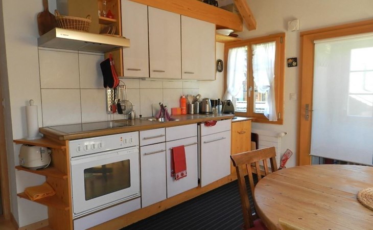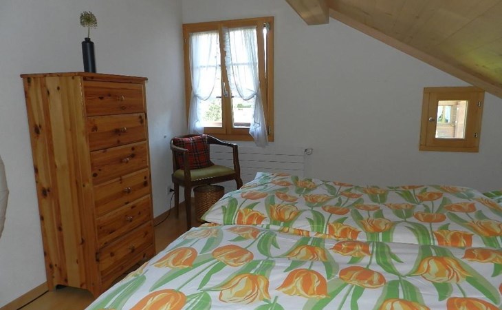 1 Schlafzimmer mit Doppelbett (2x90x200cm) und Kleiderschrank. Wohnzimmer mit ausziehbarem Sofa (152x200cm, 1 Matratze), offener Küche (u.a. ausgestattet mit Kaffeemaschine (Nespresso), Fondue- und Raclette-Set sowie Esstisch. Badezimmer mit Dusche/WC, Waschmaschine und Wäschetrockner. WiFi. Kinderbett (80x120cm) inkl. Bettwäsche und Kinderhochstuhl vorhanden.