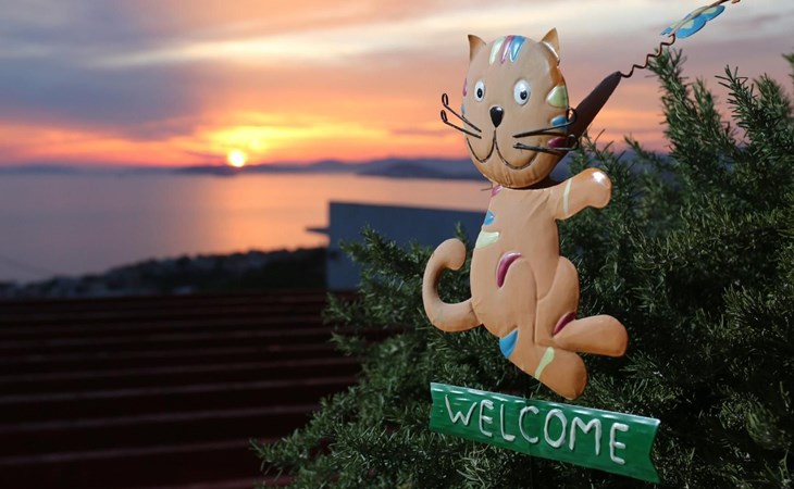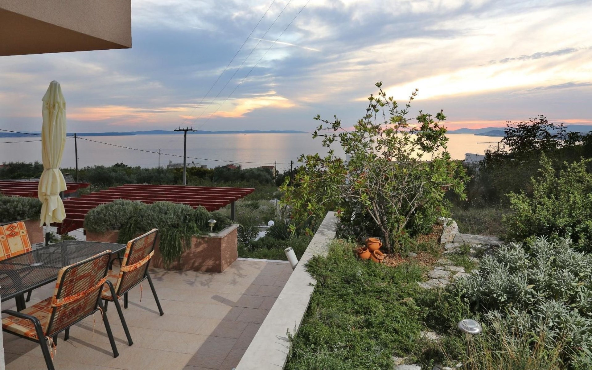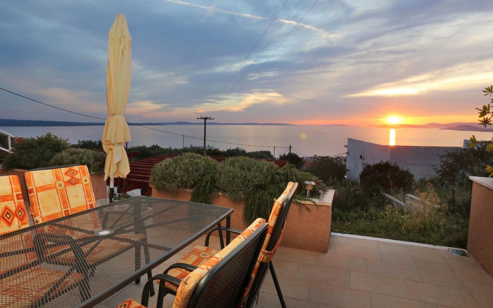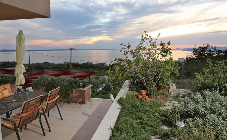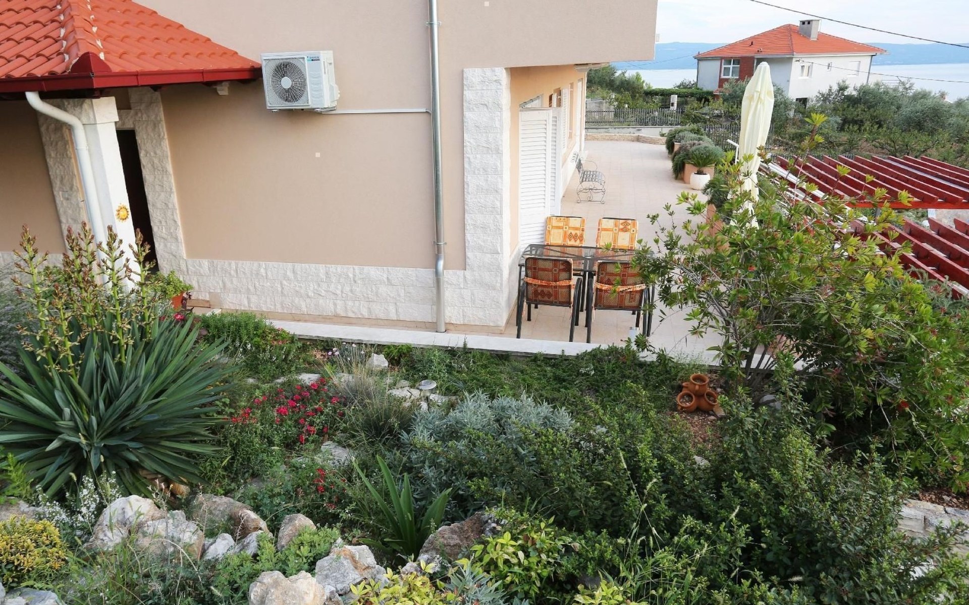 Von der Terrasse mit den Gartenmöbeln genießen Sie einen wunderbaren Ausblick über den Ort und das Meer. Hinter dem Haus steht ein Garten mit Pflanzen und Blumen sowie ein Grill für die Gäste im Haus bereit. Auch auch Parkplätze sind vorhanden.