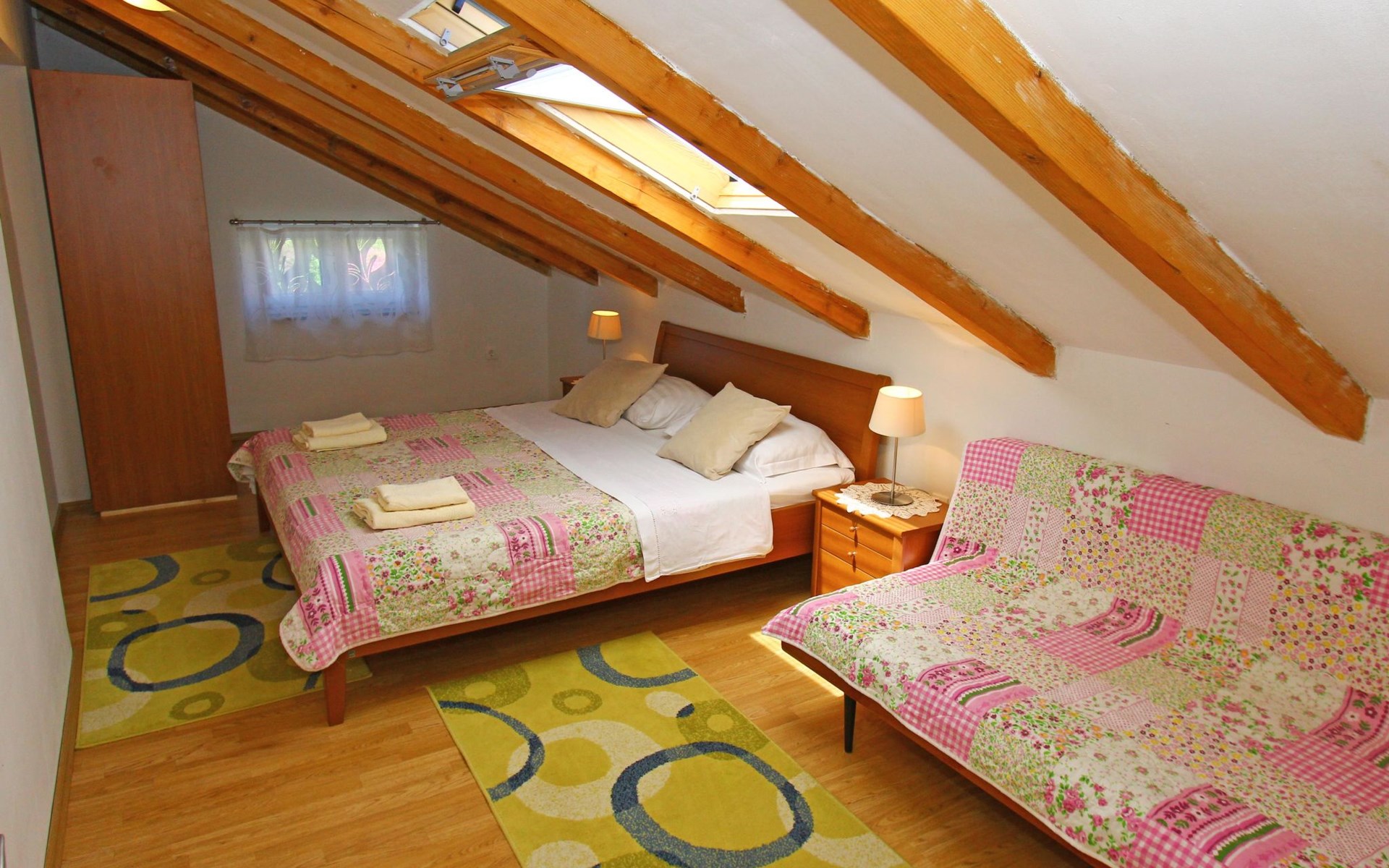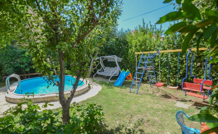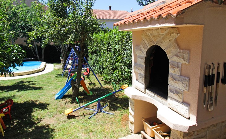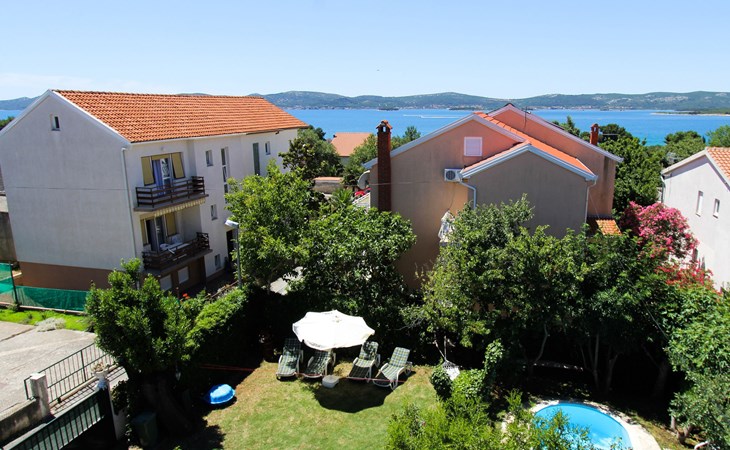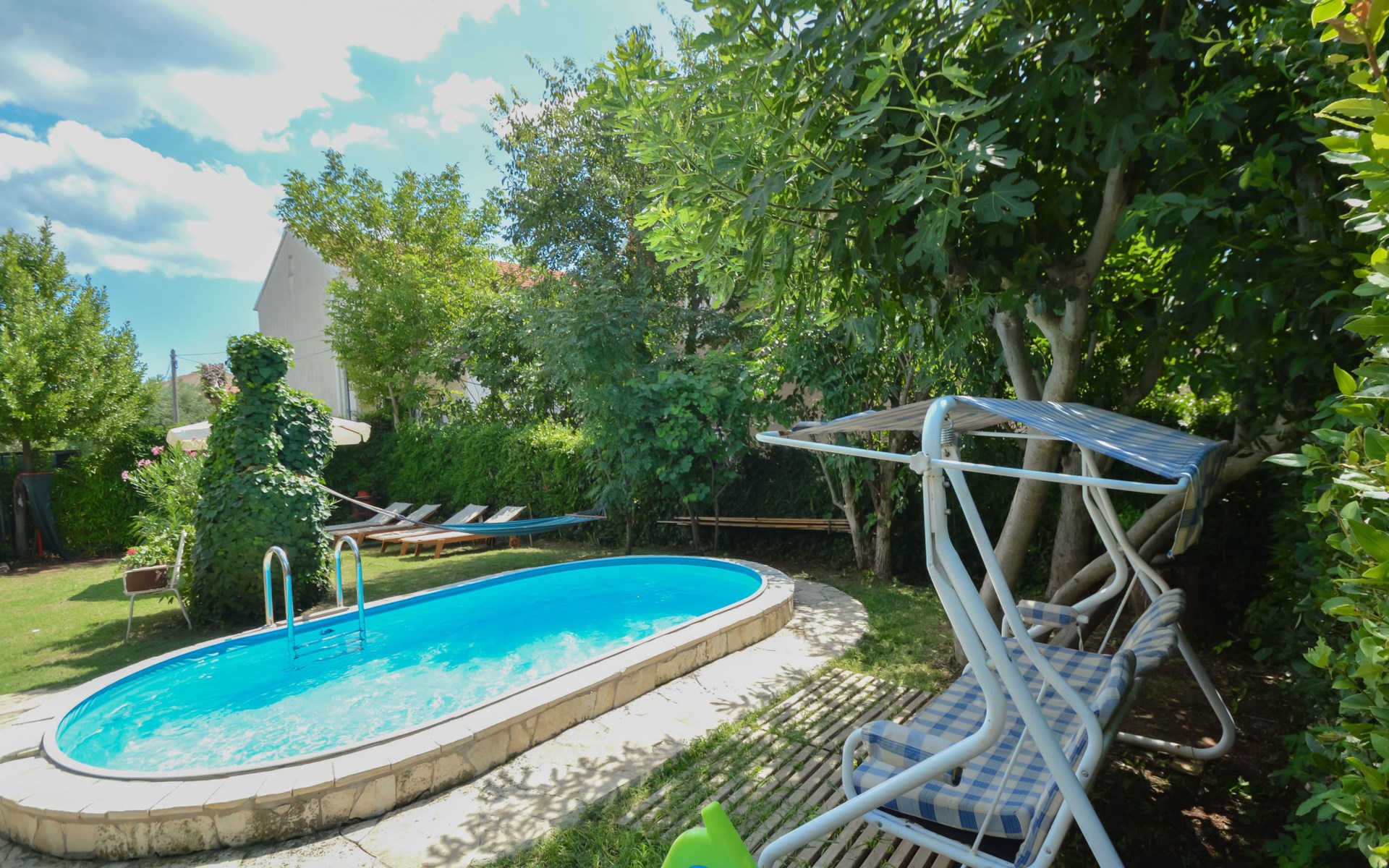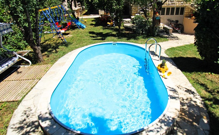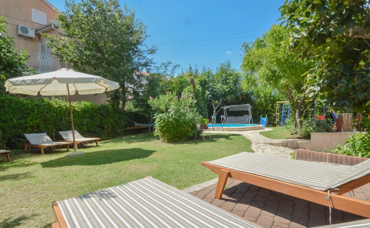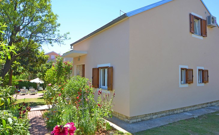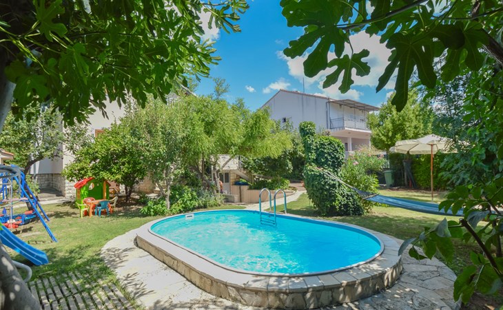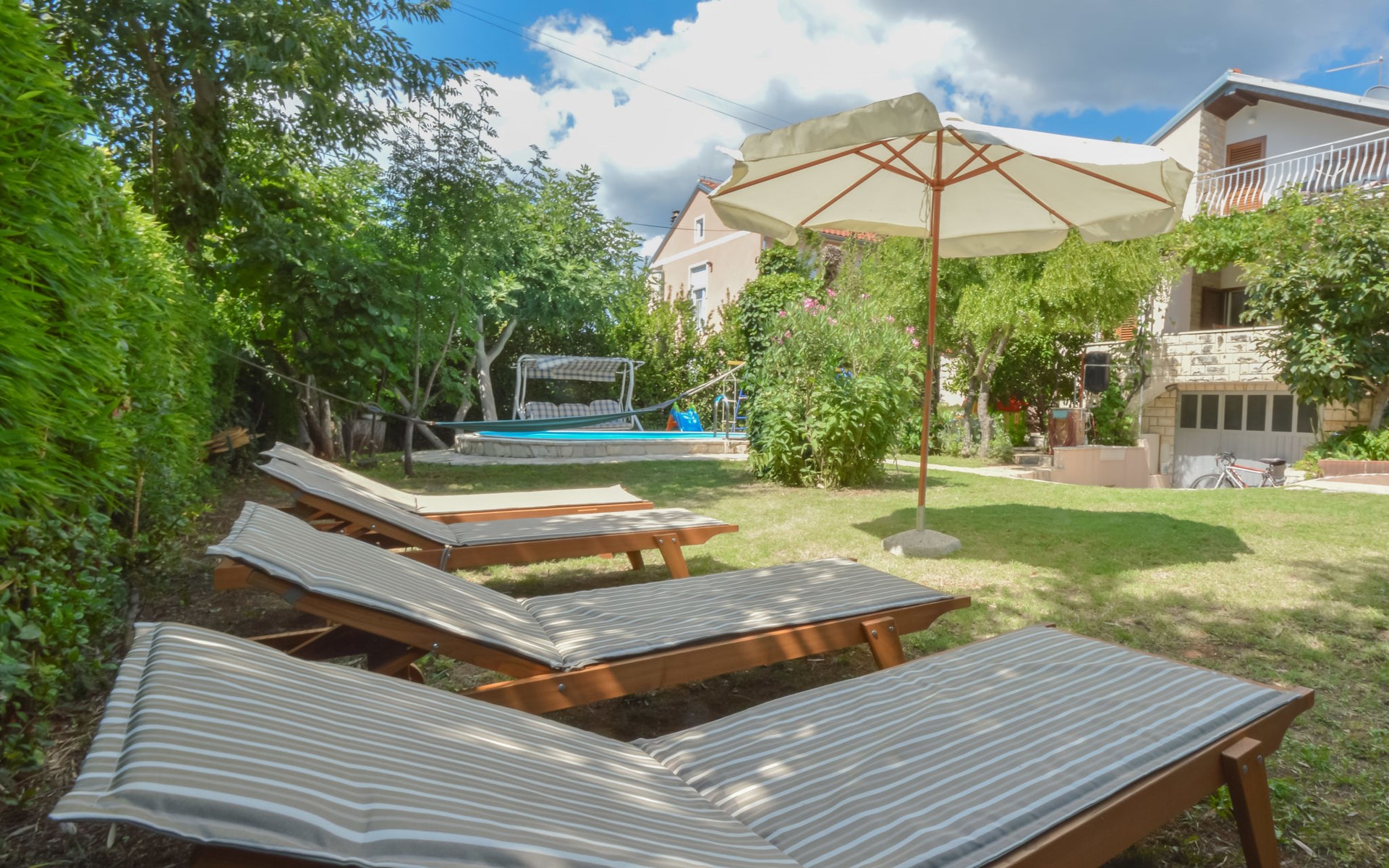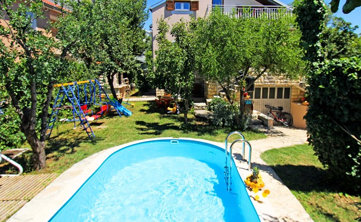 Gemütliches Einfamilienhaus "Mihovilka", auf 2 Stockwerken, renoviert im Jahre 2016. 500 m vom Zentrum, sonnige, erhöhte Lage, 250 m vom Meer, 250 m vom Strand, im Grünen. Zur Alleinbenutzung: Grundstück 1'100 m2 (eingezäunt), Garten mit Pflanzen und Bäumen, Wiese, Obstgarten, Schwimmbad (3 x 5 m, 120 cm tief, saisonale Verfügbarkeit: 01.Mai. - 15.Okt.). Aussendusche, Grillhaus, Kinderspielplatz (Rutschbahn, Schaukel, Sandkasten). Im Hause: Internetzugang, Sauna, Tischtennis, Billard. Zur Verfügung: Fahrräder (2). Parkplatz beim Haus auf dem Grundstück. Einkaufsgeschäft, Restaurant 150 m, Bushaltestelle 1.3 km, Sandstrand, Kieselstrand, Steinstrand 250 m, Tauchzentrum 5 km. Surfschule 1 km, Segelschule 1 km, Tennis 300 m, Reitstall 25 km. Nahe gelegene Sehenswürdigkeiten: amusement park 5.5 km. Ab Hof Verkauf von bäuerlichen Produkten. Ovalförmiges Schwimmbad. Ein Boot kann gemietet werden. Exkursionen mit dem Boot des Eigentümers sind möglich, extra bezahlbar. Der Eigentümer unternimmt einen kleinen Ausflug zur herzförmigen Insel "Galesnjak", auch bekannt als die Insel der Verliebten.
